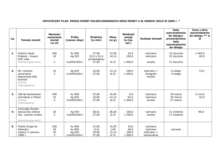 OSTATECZNY PLAN EMISJI MONET KOLEKCJONERSKICH ORAZ MONET 2 ZŁ NORDIC GOLD W 2009 r. * Lp. 1. Tematy monet Historia Jazdy Polskiej – husarz XVII wiek (Kontynuacja serii) 2. 90. rocznica utworzenia Najwyższej Izby Kontroli (Temat indywidualny) 3. 180 lat bankowości centralnej w Polsce (Temat indywidualny) 4. Zwierzęta Świata – Jaszczurka zielona (łac. Lacerta viridis) Wielkość emisji (w tys. szt.) Rodzaje stempli Data wprowadzenia do obiegu/ przewidywana data wprowadzenia do obiegu Cena z dnia wprowadzenia do obiegu ** w zł lustrzany lustrzany 23 stycznia 23 stycznia 1.645,0 64,0 Wartości nominalne monet (w zł) Próby (nazwy stop) Średnice (w mm) Masy (w g) 200 10 Au 900 Ag 925 15,50 14,14 2 CuAl5Zn5Sn1 27,00 32,0 x 22,4 (prostokątna) 27,00 8,15 1.400,0 zwykły 21 stycznia 10 2 Ag 925 CuAl5Zn5Sn1 32,00 27,00 14,14 8,15 100,0 1.200,0 lustrzany + hologram zwykły 6 lutego 4 lutego 200 10 2 Au 900 Ag 925 CuAl5Zn5Sn1 27,00 32,00 27,00 15,50 14,14 8,15 8,5 92,0 1.300,0 lustrzany lustrzany zwykły 30 marca 30 marca 27 marca 20 2 Ag 925 CuAl5Zn5Sn1 38,61 27,00 28,28 8,15 100,0 1.700,0 lustrzany zwykły 21 kwietnia 17 kwietnia 200 25 10 2 Au 900 Au 900 Ag 925 CuAl5Zn5Sn1 27,00 12,0 32,00 27,00 15,50 1,00 14,14 8,15 10,0 40,0 100,0 1.300,0 lustrzany lustrzany lustrzany + tampondruk 10,5 100,0 (Kontynuacja serii) 5. Polska Droga do Wolności wybory 4 czerwca 1989 r. czerwiec 73,0 2.110,0 63,0 96,0 Lp. Tematy monet Wartości nominalne monet (w zł) Próby (nazwy stop) Średnice (w mm) Masy (w g) Wielkość emisji (w tys. szt.) (Kontynuacja serii) zwykły 100,0 100,0 lustrzany lustrzany 14,14 14,14 CuAl5Zn5Sn1 32,00 28,2 x 28,2 (kwadrat) 27,00 8,15 1.400,0 zwykły 10 10 2 Ag 925 Ag 925 CuAl5Zn5Sn1 32,00 32,00 27,00 14,14 14,14 8,15 100,0 100,0 1.400,0 lustrzany + platerowane Au lustrzany + platerowane Au zwykły 10 2 Ag 925 CuAl5Zn5Sn1 32,00 27,00 14,14 8,15 50,0 1.000,0 lustrzany zwykły Historia Polskiej Muzyki rozrywkowej – Czesław Niemen (Nowa seria) 10 10 Ag 925 Ag 925 2 7. 65. rocznica Powstania Warszawskiego – poeci warszawscy (K. K. Baczyński, T. Gajcy) (Nowy temat indywidualny) 8. 95. rocznica wymarszu Pierwszej Kompanii Kadrowej 6. Rodzaje stempli Data wprowadzenia do obiegu/ przewidywana data wprowadzenia do obiegu czerwiec lipiec sierpień (Nowy temat indywidualny) 9. sierpień Wrzesień 1939 r. Warszawa, Wieluń, 200 10 Au 900 Ag 925 27,00 32,00 15,50 14,14 10,5 100,0 lustrzany lustrzany Cena z dnia wprowadzenia do obiegu ** w zł Lp. Tematy monet Westerplatte (Temat indywidualny) 10. 65. rocznica likwidacji getta w Łodzi Wartości nominalne monet (w zł) Próby (nazwy stop) Średnice (w mm) Masy (w g) Wielkość emisji (w tys. szt.) Rodzaje stempli 2 CuAl5Zn5Sn1 27,00 8,15 1.400,0 zwykły 20 38,61 28,28 2 Ag 925 (oksydowana) CuAl5Zn5Sn1 27,00 8,15 1.000,0 zwykły 100 10 2 Au 900 Ag 925 CuAl5Zn5Sn1 21,00 32,00 27,00 8,0 14,14 8,15 10,0 100,0 1.400,0 lustrzany + efekt kątowy lustrzany + tampondruk zwykły 50,0 lustrzany Data wprowadzenia do obiegu/ przewidywana data wprowadzenia do obiegu sierpień (Nowy temat indywidualny) 11. 100. rocznica powstania Tatrzańskiego Ochotniczego Pogotowia Ratunkowego (Nowy temat indywidualny) 12. 25. rocznica śmierci Księdza Jerzego Popiełuszki (Nowy temat indywidualny) 37 10 2 Au 900 Ag 925 CuAl5Zn5Sn1 16,00 32,00 27,00 1,75 14,14 8,15 60,0 100,0 1.500,0 lustrzany lustrzany zwykły 13. Polacy ratujący Żydów Irena Sendlerowa, 20 2 Ag 925 CuAl5Zn5Sn1 38,61 27,00 28,28 8,15 100,0 1.400,0 lustrzany zwykły wrzesień październik listopad Cena z dnia wprowadzenia do obiegu ** w zł Lp. Tematy monet Wartości nominalne monet (w zł) Próby (nazwy stop) Średnice (w mm) Masy (w g) 20 Ag 925 28,28 2 CuAl5Zn5Sn1 40 x 28 (prostokątna) 27,00 Wielkość emisji (w tys. szt.) Rodzaje stempli Data wprowadzenia do obiegu/ przewidywana data wprowadzenia do obiegu Cena z dnia wprowadzenia do obiegu ** w zł Zofia KossakSzczucka, siostra Matylda Getter (Temat indywidualny) 14. Polscy Malarze XIX/XX wieku – Władysław Strzemiński (18931952) (Kontynuacja serii) 8,15 100,0 1.300,0 lustrzany + tampondruk grudzień zwykły * uwzględnia zmiany wynikające z następujących aktów: 1) decyzja Prezesa NBP z dnia 10 kwietnia 2009 r. – uzupełnienie ostatecznego planu emisji monet kolekcjonerskich oraz monet 2 zł NG poprzez dodanie nowego tematu - 95. rocznica wymarszu Pierwszej Kompanii Kadrowej, 2) decyzja Prezesa NBP z dnia 10 kwietnia 2009 r. - uzupełnienie ostatecznego planu emisji monet kolekcjonerskich oraz monet 2 zł NG poprzez dodanie nowego tematu - 65. rocznica likwidacji getta w Łodzi, 3) Postanowienie nr III Zarządu NBP podjęte na posiedzeniu w dniu 19 marca 2009 r. ** ceny monet mogą podlegać zmianom, Plan może ulec zmianie
