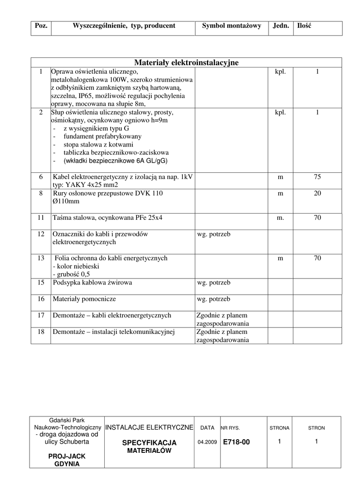 Poz. Wyszczególnienie, typ, producent Symbol montażowy Jedn. Ilość Materiały elektroinstalacyjne 1 2 6 8 Oprawa oświetlenia ulicznego, metalohalogenkowa 100W, szeroko strumieniowa z odbłyśnikiem zamkniętym szybą hartowaną, szczelna, IP65, możliwość regulacji pochylenia oprawy, mocowana na słupie 8m, Słup oświetlenia ulicznego stalowy, prosty, ośmiokątny, ocynkowany ogniowo h=9m - z wysięgnikiem typu G - fundament prefabrykowany - stopa stalowa z kotwami - tabliczka bezpiecznikowo-zaciskowa - (wkładki bezpiecznikowe 6A GL/gG) kpl. 1 kpl. 1 Kabel elektroenergetyczny z izolacją na nap. 1kV typ: YAKY 4x25 mm2 Rury osłonowe przepustowe DVK 110 Ø110mm m 75 m 20 m. 70 m 70 STRONA STRON 1 1 11 Taśma stalowa, ocynkowana PFe 25x4 12 Oznaczniki do kabli i przewodów elektroenergetycznych 13 15 Folia ochronna do kabli energetycznych - kolor niebieski - grubość 0,5 Podsypka kablowa żwirowa wg. potrzeb 16 Materiały pomocnicze wg. potrzeb 17 Demontaże – kabli elektroenergetycznych 18 Demontaże – instalacji telekomunikacyjnej Zgodnie z planem zagospodarowania Zgodnie z planem zagospodarowania Gdański Park Naukowo-Technologiczny INSTALACJE ELEKTRYCZNE - droga dojazdowa od ulicy Schuberta PROJ-JACK GDYNIA SPECYFIKACJA MATERIAŁÓW wg. potrzeb DATA 04.2009 NR RYS. E718-00