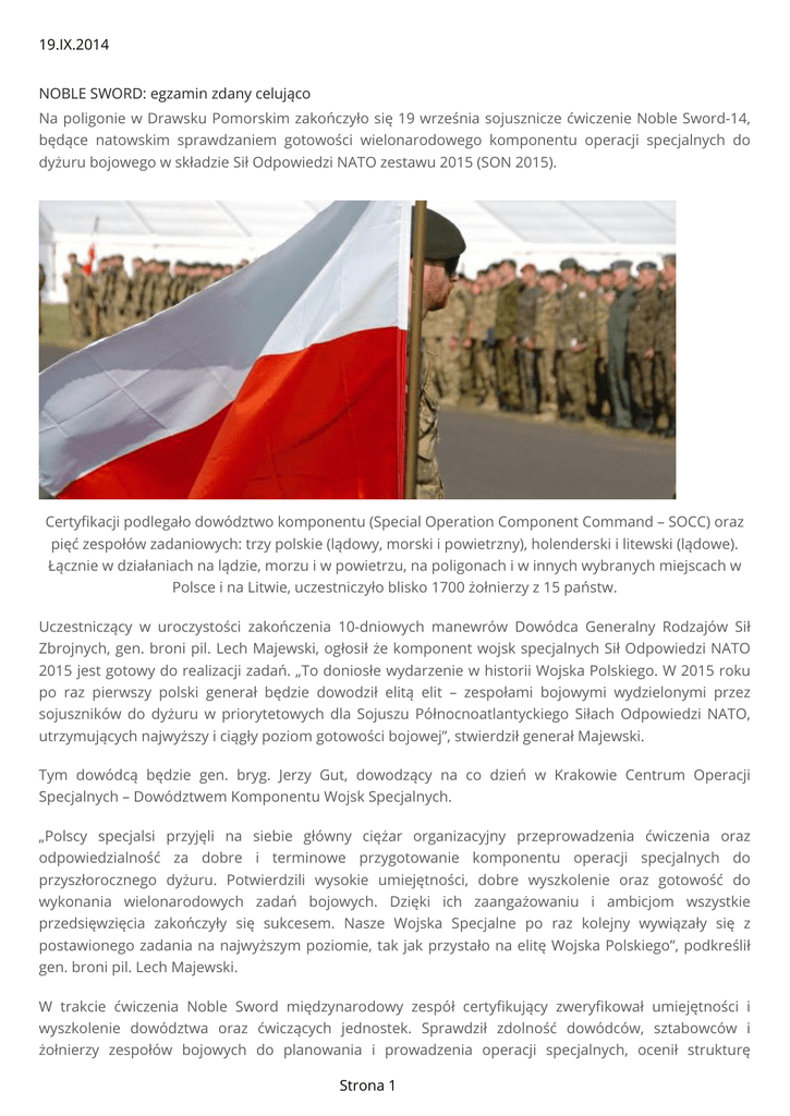 19.IX.2014 NOBLE SWORD: egzamin zdany celująco Na poligonie w Drawsku Pomorskim zakończyło się 19 września sojusznicze ćwiczenie Noble Sword-14, będące natowskim sprawdzaniem gotowości wielonarodowego komponentu operacji specjalnych do dyżuru bojowego w składzie Sił Odpowiedzi NATO zestawu 2015 (SON 2015). Certyfikacji podlegało dowództwo komponentu (Special Operation Component Command – SOCC) oraz pięć zespołów zadaniowych: trzy polskie (lądowy, morski i powietrzny), holenderski i litewski (lądowe). Łącznie w działaniach na lądzie, morzu i w powietrzu, na poligonach i w innych wybranych miejscach w Polsce i na Litwie, uczestniczyło blisko 1700 żołnierzy z 15 państw. Uczestniczący w uroczystości zakończenia 10-dniowych manewrów Dowódca Generalny Rodzajów Sił Zbrojnych, gen. broni pil. Lech Majewski, ogłosił że komponent wojsk specjalnych Sił Odpowiedzi NATO 2015 jest gotowy do realizacji zadań. „To doniosłe wydarzenie w historii Wojska Polskiego. W 2015 roku po raz pierwszy polski generał będzie dowodził elitą elit – zespołami bojowymi wydzielonymi przez sojuszników do dyżuru w priorytetowych dla Sojuszu Północnoatlantyckiego Siłach Odpowiedzi NATO, utrzymujących najwyższy i ciągły poziom gotowości bojowej”, stwierdził generał Majewski. Tym dowódcą będzie gen. bryg. Jerzy Gut, dowodzący na co dzień w Krakowie Centrum Operacji Specjalnych – Dowództwem Komponentu Wojsk Specjalnych. „Polscy specjalsi przyjęli na siebie główny ciężar organizacyjny przeprowadzenia ćwiczenia oraz odpowiedzialność za dobre i terminowe przygotowanie komponentu operacji specjalnych do przyszłorocznego dyżuru. Potwierdzili wysokie umiejętności, dobre wyszkolenie oraz gotowość do wykonania wielonarodowych zadań bojowych. Dzięki ich zaangażowaniu i ambicjom wszystkie przedsięwzięcia zakończyły się sukcesem. Nasze Wojska Specjalne po raz kolejny wywiązały się z postawionego zadania na najwyższym poziomie, tak jak przystało na elitę Wojska Polskiego”, podkreślił gen. broni pil. Lech Majewski. W trakcie ćwiczenia Noble Sword międzynarodowy zespół certyfikujący zweryfikował umiejętności i wyszkolenie dowództwa oraz ćwiczących jednostek. Sprawdził zdolność dowódców, sztabowców i żołnierzy zespołów bojowych do planowania i prowadzenia operacji specjalnych, ocenił strukturę Strona 1 komponentu i stopień zgrania elementów lądowych, morskich i powietrznych systemów walki. „Do sprawdzenia mieliśmy ponad 1300 zagadnień, a ćwiczenie dostarczyło odpowiedzi na wszystkie nasze pytania. Dzięki temu wyrobiliśmy sobie opinię na temat przygotowania i kompetencji Komponentu Operacji Specjalnych. Teraz kiedy mam już opinię jako oceniający mam honor i przyjemność ogłosić, że komponent zakończył proces certyfikacji, uzyskując ocenę celującą. Ocena ta nie jest dziełem przypadku. To wynik wielu lat ciężkiej pracy - poinformował szef Międzynarodowego Zespołu Certyfikującego, kmdr Konstantionos Gialousis z Dowództwa Sił Połączonych NATO (Joint Force Command NATO z Neapolu). Na zbiórce kończącej ćwiczenie generał Majewski wskazał, że na wspólny sukces złożył się także wysiłek personelu wydzielonego z innych rodzajów wojsk. „Nie tylko jednostki specjalne, ale również elementy z pozostałych rodzajów sił zbrojnych, wojsk i służb wspierające specjalsów bardzo dobrze zdały egzamin, potwierdzając znaczenie tak istotnego we współczesnych operacjach militarnych aspektu połączoności. Pomyślna certyfikacja komponentu jest nie efektem dobrego działania dowództwa i jednostek w trakcie ćwiczenia, ale przede wszystkim wielomiesięcznych, systematycznych przygotowań, spotkań, szkoleń, odpraw, treningów i ćwiczeń. Jest też wynikiem wielkiego doświadczenia oraz profesjonalizmu całego kierownictwa ćwiczenia oraz wszystkich żołnierzy biorących w nim udział”. Dowódca Generalny RSZ podziękował gen. dyw. Piotrowi Patalongowi, Inspektorowi Wojsk Specjalnych i zarazem kierownikowi ćwiczenia za wyjątkowe zaangażowanie w przygotowanie i przeprowadzenie „Noble Sword-14”. Podziękował także gen. bryg. Jerzemu Gutowi, dowódcy certyfikowanego na ćwiczeniu sojuszniczego Dowództwa Komponentu Operacji Specjalnych oraz uczestnikom zespołu certyfikującego. „Gdy 10 dni temu inaugurowaliśmy ćwiczenie, życzyłem kierownictwu i uczestnikom powodzenia oraz pozytywnej certyfikacji. Dziś, na zakończenie, mogę ogłosić, że komponent wojsk specjalnych Sił Odpowiedzi NATO 2015 jest gotowy do wykonania zadań”, powiedział gen. Majewski *** Certyfikację wielonarodowego Komponentu Operacji Specjalnych do dyżuru bojowego w Siłach Odpowiedzi NATO (NATO Response Force – NRF) zestawu 2015 przeprowadził zespół ekspertów Dowództwa Sił Połączonych (Joint Force Command - JFC) NATO w Neapolu oraz Dowództwa Operacyjnego RSZ. Kierownikiem ćwiczenia „Noble Sword-14” był Inspektor Wojsk Specjalnych Dowództwa Generalnego Rodzajów Sił Zbrojnych generał dywizji Piotr Patalong. Podczas dyżuru Sił Odpowiedzi NATO (SON 2015) Polska będzie państwem ramowym dla natowskiego Komponentu Operacji Specjalnych. Oznacza to, że polscy żołnierze Wojsk Specjalnych stanowić będą trzon sojuszniczego Komponentu Operacji Specjalnych, a jednostki Wojsk Specjalnych od 1 stycznia do 31 grudnia będą w bojowym dyżurze, w gotowości do przeprowadzenia operacji w składzie Sił Odpowiedzi NATO. Tekst: Bogumiła Piekut/DPI MON i ppłk Artur Goławski Foto: st. szer. Jarosław Dypolt Strona 2