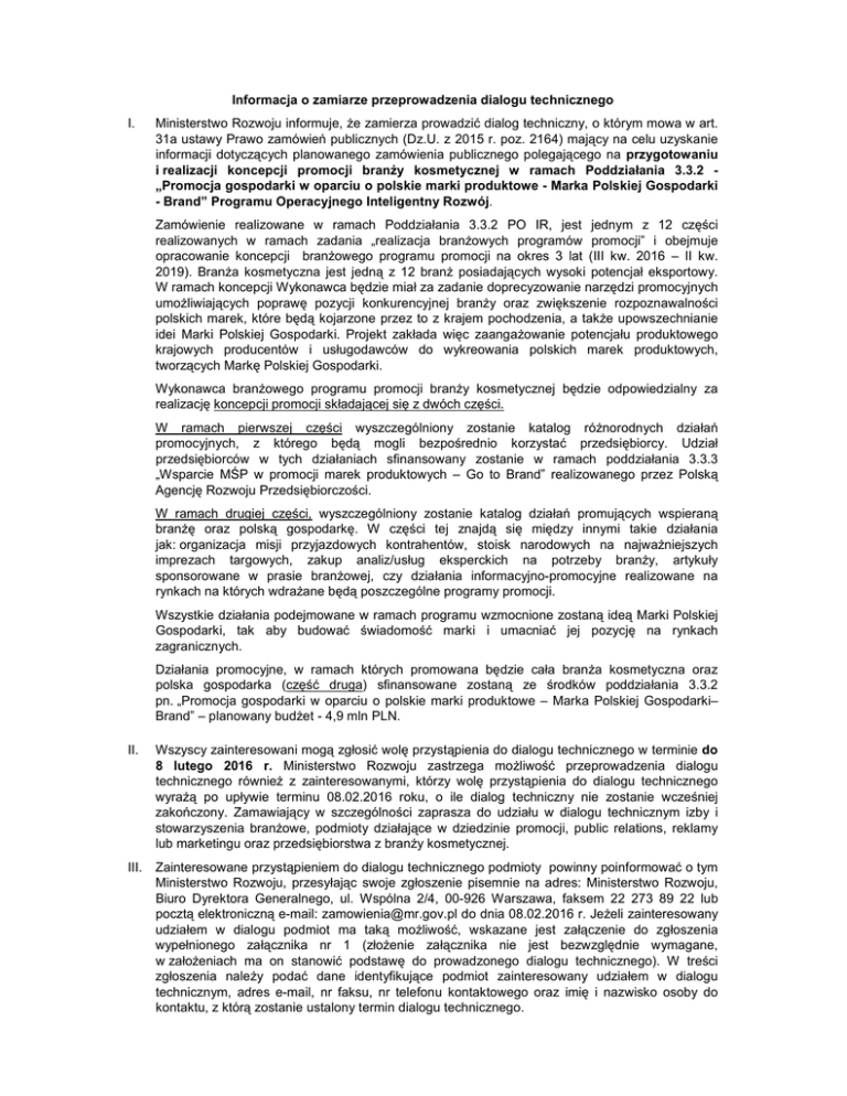 Informacja o zamiarze przeprowadzenia dialogu technicznego I. Ministerstwo Rozwoju informuje, że zamierza prowadzić dialog techniczny, o którym mowa w art. 31a ustawy Prawo zamówień publicznych (Dz.U. z 2015 r. poz. 2164) mający na celu uzyskanie informacji dotyczących planowanego zamówienia publicznego polegającego na przygotowaniu i realizacji koncepcji promocji branży kosmetycznej w ramach Poddziałania 3.3.2 „Promocja gospodarki w oparciu o polskie marki produktowe - Marka Polskiej Gospodarki - Brand” Programu Operacyjnego Inteligentny Rozwój. Zamówienie realizowane w ramach Poddziałania 3.3.2 PO IR, jest jednym z 12 części realizowanych w ramach zadania „realizacja branżowych programów promocji” i obejmuje opracowanie koncepcji branżowego programu promocji na okres 3 lat (III kw. 2016 – II kw. 2019). Branża kosmetyczna jest jedną z 12 branż posiadających wysoki potencjał eksportowy. W ramach koncepcji Wykonawca będzie miał za zadanie doprecyzowanie narzędzi promocyjnych umożliwiających poprawę pozycji konkurencyjnej branży oraz zwiększenie rozpoznawalności polskich marek, które będą kojarzone przez to z krajem pochodzenia, a także upowszechnianie idei Marki Polskiej Gospodarki. Projekt zakłada więc zaangażowanie potencjału produktowego krajowych producentów i usługodawców do wykreowania polskich marek produktowych, tworzących Markę Polskiej Gospodarki. Wykonawca branżowego programu promocji branży kosmetycznej będzie odpowiedzialny za realizację koncepcji promocji składającej się z dwóch części. W ramach pierwszej części wyszczególniony zostanie katalog różnorodnych działań promocyjnych, z którego będą mogli bezpośrednio korzystać przedsiębiorcy. Udział przedsiębiorców w tych działaniach sfinansowany zostanie w ramach poddziałania 3.3.3 „Wsparcie MŚP w promocji marek produktowych – Go to Brand” realizowanego przez Polską Agencję Rozwoju Przedsiębiorczości. W ramach drugiej części, wyszczególniony zostanie katalog działań promujących wspieraną branżę oraz polską gospodarkę. W części tej znajdą się między innymi takie działania jak: organizacja misji przyjazdowych kontrahentów, stoisk narodowych na najważniejszych imprezach targowych, zakup analiz/usług eksperckich na potrzeby branży, artykuły sponsorowane w prasie branżowej, czy działania informacyjno-promocyjne realizowane na rynkach na których wdrażane będą poszczególne programy promocji. Wszystkie działania podejmowane w ramach programu wzmocnione zostaną ideą Marki Polskiej Gospodarki, tak aby budować świadomość marki i umacniać jej pozycję na rynkach zagranicznych. Działania promocyjne, w ramach których promowana będzie cała branża kosmetyczna oraz polska gospodarka (część druga) sfinansowane zostaną ze środków poddziałania 3.3.2 pn. „Promocja gospodarki w oparciu o polskie marki produktowe – Marka Polskiej Gospodarki– Brand” – planowany budżet - 4,9 mln PLN. II. Wszyscy zainteresowani mogą zgłosić wolę przystąpienia do dialogu technicznego w terminie do 8 lutego 2016 r. Ministerstwo Rozwoju zastrzega możliwość przeprowadzenia dialogu technicznego również z zainteresowanymi, którzy wolę przystąpienia do dialogu technicznego wyrażą po upływie terminu 08.02.2016 roku, o ile dialog techniczny nie zostanie wcześniej zakończony. Zamawiający w szczególności zaprasza do udziału w dialogu technicznym izby i stowarzyszenia branżowe, podmioty działające w dziedzinie promocji, public relations, reklamy lub marketingu oraz przedsiębiorstwa z branży kosmetycznej. III. Zainteresowane przystąpieniem do dialogu technicznego podmioty powinny poinformować o tym Ministerstwo Rozwoju, przesyłając swoje zgłoszenie pisemnie na adres: Ministerstwo Rozwoju, Biuro Dyrektora Generalnego, ul. Wspólna 2/4, 00-926 Warszawa, faksem 22 273 89 22 lub pocztą elektroniczną e-mail: [email protected] do dnia 08.02.2016 r. Jeżeli zainteresowany udziałem w dialogu podmiot ma taką możliwość, wskazane jest załączenie do zgłoszenia wypełnionego załącznika nr 1 (złożenie załącznika nie jest bezwzględnie wymagane, w założeniach ma on stanowić podstawę do prowadzonego dialogu technicznego). W treści zgłoszenia należy podać dane identyfikujące podmiot zainteresowany udziałem w dialogu technicznym, adres e-mail, nr faksu, nr telefonu kontaktowego oraz imię i nazwisko osoby do kontaktu, z którą zostanie ustalony termin dialogu technicznego. IV. Ministerstwo Rozwoju zamierza prowadzić dialog techniczny w formie indywidualnych spotkań z przedstawicielami zainteresowanych podmiotów w okresie od 15.02.2016 r. do 15.03.2016 r. w budynku ministerstwa przy ul. Wspólnej 2/4 w Warszawie. V. Dialog techniczny będzie prowadzony do czasu osiągnięcia celu przeprowadzenia dialogu, o którym mowa poniżej. VI. O zakończeniu prowadzenia dialogu technicznego Ministerstwo Rozwoju poinformuje wszystkie podmioty, które przed jego zakończeniem zgłosiły wolę udziału w dialogu technicznym. Zamawiający zastrzega sobie prawo do zakończenia dialogu technicznego na każdym jego etapie lub odwołania dialogu technicznego bez podania przyczyny. VII. Ministerstwo Rozwoju nie przewiduje wynagrodzenia dla podmiotów uczestniczących w dialogu technicznym. VIII. Dialog techniczny będzie prowadzony w języku polskim. IX. Celem dialogu technicznego jest uzyskanie przez Ministerstwo Rozwoju wiedzy użytecznej przy formułowaniu zapisów specyfikacji istotnych warunków zamówienia w zakresie: - określenia narzędzi promujących branżę kosmetyczną, - określenia rynków, na terenie których zorganizowane zostaną wybrane narzędzia promocji, - określenia wskaźników umożliwiających ocenę efektywności zaproponowanych narzędzi promocyjnych, - zaproponowania Zamawiającemu możliwości zastosowania innych obok ceny, kryteriów oceny ofert złożonych w postępowaniu prze