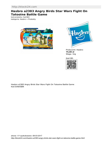 http://klocki24.com Hasbro a2383 Angry Birds Star Wars Fight On Tatooine Battle Game kod produktu: ha2383 kategoria: Hasbro > Produkty Producent: Hasbro 75,00 zł Waga: 1kg Kod QR: Hasbro a2383 Angry Birds Star Wars Fight On Tatooine Battle Game Kod EAN/ISBN strona: 1/1 wydrukowano: 08-03-2017 http://klocki24.com/hasbro-a2383-angry-birds-star-wars-fight-on-tatooine-battle-game.html