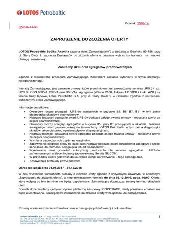 Gdańsk, 2016-12022016-11-30 ZAPROSZENIE DO ZŁOŻENIA OFERTY LOTOS Petrobaltic Spółka Akcyjna (zwana dalej „Zamawiającym”) z siedzibą w Gdańsku 80-758, przy ul. Stary Dwór 9, zaprasza Dostawców do złożenia oferty w procesie wyboru kontrahenta na ramową obsługę serwisową: Zasilaczy UPS oraz agregatów prądotwórczych Zgodnie z wewnętrzną procedurą Zamawiającego, Kontrahent zostanie wyłoniony w trybie przetargu nieograniczonego. Intencją Zamawiającego jest zawarcie umowy, której przedmiotem jest prowadzenie serwisu UPS ( 4 szt. UPS SILCON 60KVA, 20KVA oraz 35KVA) i agregatów (Wilson P100, Teksan TJ160PR i 4 ukł. AZR.) na terenie bazy lądowej Lotos Petrobaltic S.A. przy ul. Stary Dwór 9 w Gdańsku zgodnie z potrzebami wskazanymi przez Zamawiającego. Informacje dodatkowe: Okresowy roczny przegląd UPS-ów centralnych w budynku B5, B6, B7, B11 w tym pełna diagnostyka układów i akumulatorów. Naprawy bieżące i usuwanie awarii UPS-ów podczas całego trwania umowy – robocizna (zwrot za części powykonawczo). Okresowy roczny przegląd agregatów w budynku B5 i przy BT pracujących w układzie zasilania awaryjnego sieci gwarantowanej na terenie bazy LOTOS Petrobaltic w tym pełna diagnostyka układów, akumulatorów, wymiana płynów eksploatacyjnych. Naprawy bieżące i usuwanie awarii agregatów podczas całego trwania umowy – robocizna (zwrot za części powykonawczo). Wymiana uszkodzonych części na oryginalne. Zapewnienie ciągłości pracy na czas czas naprawy podczas awarii (urządzenia zastępcze i części serwisowe do momentu ściągnięcia ich od producentów). Wykonawca musi posiadać autoryzację producenta dla serwisu agregatów i UPS-ów zamontowanych u zleceniodawcy (autoryzowany Serwis SILCON). W przypadku awarii gotowość do usuwania usterki na wezwanie – tego samego dnia. Obowiązują protokoły powykonawcze. Okres realizacji prac 01.01.2017 - 31.12.2018 W celu wyłonienia kontrahenta prosimy o złożenie oferty zgodnie z wytycznymi zawartymi w poniższym „Zaproszeniu do złożenia oferty”, w nieprzekraczalnym terminie do dnia 08.12.2016, godz. 10:00. Oferty, które wpłyną po tym terminie nie będą rozpatrywane. Zamawiający dopuszcza zmianę terminu składania ofert. Sposób złożenia oferty - jedynie poprzez platformę zakupową LOGINTRADE, oferty przesłane emailem nie będą akceptowane. Szczegółowe zaproszenie do złożenia oferty w załączniku do postępowania. Prosimy o zamieszczenie w Państwa ofercie następujących informacji i dokumentów: 1 1. 2. 3. 4. 5. 6. Cena za wykonanie zlecenia uwzględniająca wszelkie niezbędne do poniesienia przez Wykonawcę prac koszty zwłaszcza (dojazd, oczekiwanie, ubezpieczenie, robociznę ). Warunki płatności - płatność po usłudze, oczekiwana min 60 dni od daty otrzymania faktury przez Zamawiającego, Numer konta bankowego wykonawcy na które będą regulowane należności. Termin ważności oferty – min. 60 dni od upływu wyznaczonego terminu na składanie ofert. Upoważnienie dla osób, które składają oświadczenia w imieniu oferenta, jeżeli wynika to z rejestru. Złożenie oferty oznacza akceptacje załączników Bezpieczeństwa i OWZ znajdujących się na stronie: http://www.lotos.pl/344/grupa_kapitalowa/nasze_spolki/lotos_petrobaltic/do_pobrania 7. Wypełnienie formularza ofertowego – Załącznik nr 1 UWAGA: 1. Zamawiający oczekuje, że Wykonawca zapozna się dokładnie z treścią niniejszego dokumentu. 2. Złożenie oferty będzie uznane za akceptację zasad prowadzonego postępowania opisanych w niniejszym dokumencie. 3. Przed sporządzeniem oferty możliwa jest konsultacja z osobą wskazaną w punkcie I podpunkt 1.2 lub inną osobą przez nią wyznaczoną. Przedstawiciele Wykonawcy przebywający na terenie i platformie Zamawiającego zobowiązani są do przestrzegania zasad Bezpieczeństwa. 4. Cena podana w ofercie powinna być określona jednoznacznie i w sposób nie budzący wątpliwości (bez tzw. widełek cenowych). 5. Ceny podane w walutach innych niż PLN zostaną na potrzeby porównania ofert przeliczone przez Zamawiającego na PLN według odpowiedniego kursu waluty obcej z tabeli A kursów średnich Narodowego Banku Polskiego opublikowanej w dniu otwarcia ofert. I. 1. OSOBY UPRAWNIONE DO KONTAKTU I SPOSÓB POROZUMIEWANIA SIĘ: Osobami upoważnionymi do kontaktu z wykonawcami są: 1.1. W sprawach handlowych i formalnych związanych z niniejszym postępowaniem przetargowym: Adam Nazaruk 58 309 21 30; 512 782 115 e-mail: [email protected] 1.2. W sprawach technicznych dotyczących przedmiotu zamówienia: Dariusz Stępniewski 502 194 280; e-mail [email protected] Informacje będą udzielane w dni robocze, w godzinach 9ºº - 14ºº wyłącznie za pośrednictwem poczty elektronicznej w terminie do dnia 07.12.2016 zawsze z kopią do osoby wyszczególnionej w punkcie 1.1 lub za pośrednictwem platformy Logintrade. II. 1. KRYTERIUM WYBORU OFERTY: Opis kryteriów, którymi Zamawiający będzie się kierował przy ocenie oferty w celu wyboru oferty najkorzystniejszej: 1.1. Najniższa cena, 1.2. Najdłuższy termin płatności, 1.3. Ocena techniczna oferty. 2. Oferta, która uzyska największa liczbę punktów zostanie wybrana przez Zamawiającego. 3. Umowa zostanie zawarta z wybranym Wykonawcą, którego oferta zostanie oceniona jako najkorzystniejsza, przy zastosowaniu kryteriów, o których mowa powyżej. 2 III. 1. WARUNKI UDZIAŁU W POSTĘPOWANIU: W postępowaniu mogą wziąć udział Wykonawcy, którzy spełniają następujące warunki dotyczące: 1.1 Posiadają doświadczenie w realizacji usług w zakresie analogicznym do postępowania. 1.2 Firma jest autoryzowanym serwisantem Silcon IV. OŚWIADCZENIA I DOKUMENTY JAKIE MAJĄ DOSTARCZYĆ WYKONAWCY W CELU POTWIERDZENIA SPEŁNIENIA WARUNKÓW UDZIAŁU W POSTĘPOWANIU. 1. W celu wykazania spełnienia przez Wykonawcę warunków udziału w postępowaniu, Wykonawca dostarczy następujące dokumenty: - Ofertę