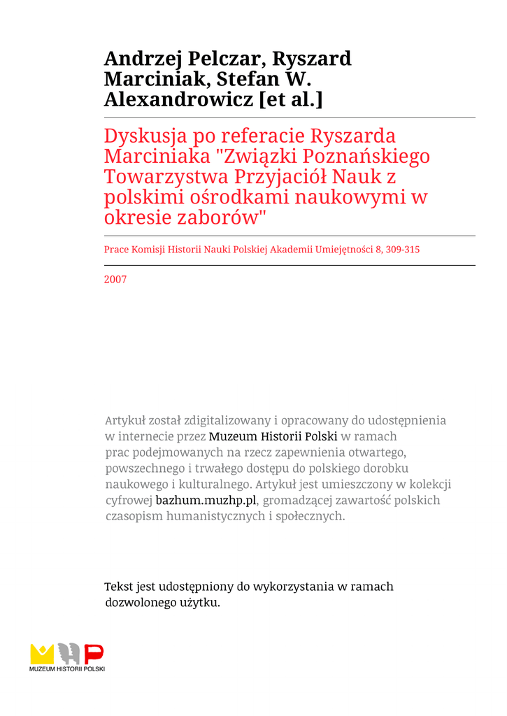 Andrzej Pelczar, Ryszard Marciniak, Stefan W. Alexandrowicz [et al.] Dyskusja po referacie Ryszarda Marciniaka "Związki Poznańskiego Towarzystwa Przyjaciół Nauk z polskimi ośrodkami naukowymi w okresie zaborów" Prace Komisji Historii Nauki Polskiej Akademii Umiejętności 8, 309-315 2007 Zwiqzki Poznańskiego Towarzystwa Przyjaciół Nauk z polskimi ośrodkami naukowymi... 309 Dyskusja po referacie Ryszarda Marciniaka: Z w iązki P oznańskiego T ow arzystw a P rzyjaciół N auk z p olskim i ośro d kam i n au kow ym i w okresie zaborów Andrzej Pelczar: Jakie były związki Poznania z francuskim Towarzystwem Nauk Ścisłych? In teresuje mnie to jako matematyka, bo tam ta część nauk ścisłych była reprezento wana. Czy były jakieś kontakty instytucjonalne czy inne? Ryszard Marciniak: Oczywiście były. Nie mogłem tu w referacie wszystkiego przedstawić, ale kontakty te były mimo wszystko marginalne. Przede wszystkim Jana Działyń skiego, który był i członkiem naszego Towarzystwa, i założycielem Towarzy stwa Nauk Ścisłych, sponsorem i wydawcą tych pism, które tamto Towarzystwo wydawało od roku 1870 do 1882. Przypominam, że Działyński zmarł co praw da w roku 1880, ale jeszcze następca jego na Kórniku, Władysław Zamoyski, próbował kontynuować te wydawnictwa, w końcu przerwał ich finansowanie, twierdząc że nie jest w stanie udźwignąć tego ciężaru. Towarzystwo przysłało do Torunia na obchody czterechsetlecia urodzin Mikołaja Kopernika swoich przed stawicieli i pewne pamiątki, które na wystawie były prezentowane, ale Zamoyski podkreślał, że Towarzystwo Poznańskie poświęcało temu zbyt mało uwagi. Gdy w Paryżu w roku 1878 została zorganizowana Wystawa Powszechna, to Wielkopolska była tam reprezentowana tylko przez tzw. „kamienie mikorzyńskie". To bardzo ciekawa historia, bo Jan Działyński zżymał się na te dwa „ka mienie mikorzyńskie". Zostały one wydobyte na terenie Wielkopolski ze stawu w Mikorzynie w latach 1855/56. Kamienie te były pokryte runami. Wywiązała się dyskusja ogólnopolska czy są to runy słowiańskie, czy niemieckie. Opinia była podzielona. Towarzystwo nasze wypowiadało się, że są to autentyki i dla tego wysłało je na wystawę do Paryża. Tymczasem okazało się - udowodnił to najwybitniejszy wtedy językoznawca we Lwowie, Antoni Małecki, zresztą z po chodzenia Wielkopolanin - że były to falsyfikaty, a twórca ich opierał się na pracach Joachima Lelewela. Oczywiście była też wymiana wydawnictw. Towarzystwo Nauk Ścisłych wy dało 26 podręczników i 12 tomów „Pamiętnika". Wszystkie one trafiły do Towa rzystwa Przyjaciół Nauk. Bardzo były potrzebne. Nomenklatura naukowa była w Poznańskiem bardzo słabo rozwinięta, nie było niemal w ogóle inżynierów, zaledwie kilku na całą Wielkopolskę. Chodziło zatem o wykształcenie kadry, ale takiego poparcia ze strony Towarzystwa Nauk Ścisłych nie było. 310 RYSZARD MARCINIAK Stefan W. Alexandrowicz: Chciałem odnieść się do sprawy tych falsyfikatów mnikowskich, które Pan Profesor zilustrował tu na fotografiach. Rozumiem, że są one w dalszym ciągu w zasobach Muzeum Poznańskiego. Ja miałem okazję się z nimi zetknąć, gdy dla programu III Telewizji Polskiej kręciłem film na temat Mnikowa i między innymi prezentowałem te falsyfikaty. Otóż Gotfryd Ossowski, który rozkopywał jaskinie mnikowskie rozkopał między innymi dwa małe schrony skalne, które nazywają się „jaskinie na Dolniku górna i dolna" . Nie wiadomo, co takiego on znalazł, co dało asumpt robotnikom czy ludziom tam kopiącym, aby mu to w dalszym ciągu produkować. Ale ponieważ bywał od czasu do czasu na wykopaliskach i pa trzył na to, co mu wykopali, to stwierdzili, że nadarza się okazja dodatkowego zarobku i zaczęli mu te falsyfikaty produkować. Potem nastąpił okres dyskusji czy są to oryginały, czy falsyfikaty i osobą, która przyczyniła się do wyjaśnienia tej sprawy był dr Leńczyk. To był archeolog krakowski związany z PAU, pra cujący potem nad Tyńcem. Ja miałem okazję się z nim osobiście zetknąć, gdy robiłem pracę dyplomową geologiczną w Tyńcu. Wtedy poznałem go dobrze, bo geolog miał zawsze coś sobie z archeologiem do powiedzenia. Otóż on zor ganizował wycieczkę, w czasie której zgłosił się do niego starszy już człowiek i oświadczył, że był wtedy, gdy te wykopaliska prowadzono. Pokazywał, gdzie wtedy, kto, co robił i sprzedawał. Ten zbiór falsyfikatów jest to zbiór kuriozalny i trzeba powiedzieć, że kuriozalny w światowej skali. Niezależnie od tego, że są to falsyfikaty, zasługuje on na uwagę. Natomiast do dziś jest nierozpoznany. Z punktu widzenia, o którym powiem za chwile, ważne jest to, że są to ryty czy kształty wycinane na materiale kostnym. Te najbardziej przypominają oryginały, było to najprawdopodobniejsze, że człowiek znajdował jakieś kości i coś tam na nich figurował. Natomiast część tych falsyfikatów jest w materiale kamiennym, a do dziś nikt tego nie zbadał, co tam jest. Są tam niewątpliwie kawałki wapieni jurajskich, oryginalnych, ale nie w większości. Są to prawdopodobnie wyroby ryte na gipsie, co oczywiście nie mogło być związane z przeszłością. Ale do dziś bardzo mało wiemy z czego te falsyfikaty są. Zasługuje to na wyjaśnienie. Ja nie jestem archeologiem i nie potrafię powiedzieć, jakie są obiekty porównawcze, ale znany jest słynny problem falsyfikatów skamieniałości, który doprowadził odkrywcę do śmierci. Ten zbiór mnikowski jest kuriozalny w skali światowej i zasługuje na uwagę niezależnie od tego, że archeolodzy będą mieli do niego taki stosunek, jaki powinni mieć, czyli jako do zbioru falsyfikatów. Zbigniew Wójcik: Wystąpienie Pana Profesora dotyczy całej wiązki spraw bardzo istotnych za równo dla Poznańskiego Towarzystwa Przyjaciół Nauk, jak i dla Polskiej Akade mii Umiejętności. Ch