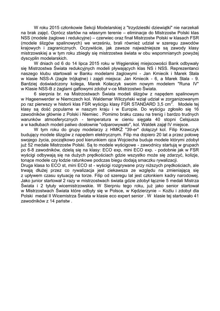 W roku 2015 członkowie Sekcji Modelarskiej z "trzydziestki dziewiątki" nie narzekali na brak zajęć. Oprócz startów na własnym terenie – eliminacje do Mistrzostw Polski klas NSS (modele żaglowe i redukcyjne) – czerwiec oraz finał Mistrzostw Polski w klasach FSR (modele ślizgów spalinowych) we wrześniu, brali również udział w szeregu zawodów krajowych i zagranicznych. Oczywiście, jak zawsze najważniejsze są zawody klasy mistrzowskiej a w tym roku zbiegły się mistrzostwa świata w obu wspomnianych powyżej dyscyplin modelarskich. W dniach od 6 do 14 lipca 2015 roku w Węgierskiej miejscowości Bank odbywały się Mistrzostwa Świata redukcyjnych modeli pływających klas NS i NSS. Reprezentanci naszego klubu startowali w Banku modelami żaglowymi - Jan Kmiecik i Marek Stala w klasie NSS-A (żagle trójkątne) i zajęli miejsca: Jan Kmiecik - 6, a Marek Stala - 9. Bardziej doświadczony kolega, Marek Kołaczyk swoim nowym modelem "Runa IV" w Klasie NSS-B z żaglami gaflowymi zdobył v-ce Mistrzostwo Świata. 6 sierpnia br. na Mistrzostwach Świata modeli ślizgów z napędem spalinowym w Hageenwerder w Niemczech kol. Waldemar Wilczyński wziął udział w zorganizowanym po raz pierwszy w historii klas FSR wyścigu klasy FSR STANDARD 3,5 cm 3. Modele tej klasy są dość popularne w naszym kraju i w Europie. Do wyścigu zgłosiło się 16 zawodników głównie z Polski i Niemiec . Pomimo braku czasu na trenig i bardzo trudnych warunków atmosferycznych - temperatura w cieniu sięgała 40 stopni Celsjusza a w kadłubach modeli paliwo dosłownie "odparowywało", kol. Waldek zajął IV miejsce. W tym roku do grupy modelarzy z HMKŻ "39-er" dołączył kol. Filip Krawczyk budujący modele ślizgów z napędem elektrycznym. Filip ma dopiero 20 lat a przez połowę swojego życia, początkowo pod kierunkiem ojca Wojciecha buduje modele którymi zdobył już 52 medale Mistrzostw Polski. Są to modele wyścigowe - zawodnicy startują w grupach po 6-8 zawodników, dzielą się na klasy: ECO exp, mini ECO exp. - podobnie jak w FSR wyścigi odbywają się na dużych prędkościach gdzie wszystko może się zdarzyć, kolizje, tonące modele czy łodzie ratunkowe podczas biegu dodają smaczku rywalizacji. Druga klasa to ECO st, mini ECO st - wyścigi rozgrywane przy niższych prędkościach, ale trwają dłużej przez co rywalizacja jest ciekawsza ze względu na zmieniającą się z upływem czasu sytuację na torze. Filip od szeregu lat jest członkiem kadry narodowej. Jako junior startował 2 razy w mistrzostwach świata gdzie zdobył łącznie 5 medali Mistrza Świata i 2 tytuły wicemistrzowskie. W Sierpniu tego roku, już jako senior startował w Mistrzostwach Świata które odbyły się w Polsce, w Kędzierzynie – Kożlu i zdobył dla Polski medal II Wicemistrza Świata w klasie eco expert senior . W klasie tej startowało 41 zawodników z 14 państw .