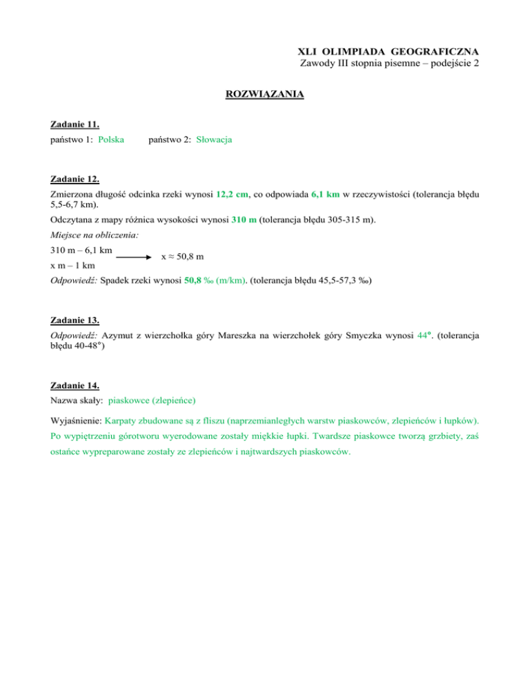 -2r/1- XLI OLIMPIADA GEOGRAFICZNA Zawody III stopnia pisemne – podejście 2 ROZWIĄZANIA Zadanie 11. państwo 1: Polska państwo 2: Słowacja Zadanie 12. Zmierzona długość odcinka rzeki wynosi 12,2 cm, co odpowiada 6,1 km w rzeczywistości (tolerancja błędu 5,5-6,7 km). Odczytana z mapy różnica wysokości wynosi 310 m (tolerancja błędu 305-315 m). Miejsce na obliczenia: 310 m – 6,1 km x m – 1 km x ≈ 50,8 m Odpowiedź: Spadek rzeki wynosi 50,8 ‰ (m/km). (tolerancja błędu 45,5-57,3 ‰) Zadanie 13. Odpowiedź: Azymut z wierzchołka góry Mareszka na wierzchołek góry Smyczka wynosi 44°. (tolerancja błędu 40-48°) Zadanie 14. Nazwa skały: piaskowce (zlepieńce) Wyjaśnienie: Karpaty zbudowane są z fliszu (naprzemianległych warstw piaskowców, zlepieńców i łupków). Po wypiętrzeniu górotworu wyerodowane zostały miękkie łupki. Twardsze piaskowce tworzą grzbiety, zaś ostańce wypreparowane zostały ze zlepieńców i najtwardszych piaskowców. -2r/2- Zadanie 15. W tabeli przedstawiono przykładowe poprawne odpowiedzi. Informacja na mapie Uzasadnienie zaznaczono symbolicznymi drzewami i opisano na mapie wsie nieistniejące Przesiedlenia ludności. Wyludnienie regionu. duże kompleksy leśne na terenach porolnych Na obszarach dawniej użytkowanych rolniczo, a dziś niemal bezludnych, posadzono las, lub też drogą naturalnej sukcesji spontanicznie wyrósł las. opuszczone cmentarze Na terenach niemal bezludnych znajdują się cmentarze pozbawione opieki, brak nowych pochówków. pomniki upamiętniające wydarzenia historyczne (np. mogiła Żydów) Eksterminacja Żydów przez hitlerowców w czasie II wojny światowej. drogi donikąd, ślady dawnej infrastruktury Sieć dróg lokalnych nawiązuje do dawnej struktury osadniczej i dawnego sposobu użytkowania gruntów. Zadanie 16. Nazwa własna odczytana z mapy Zbiorowisko leśne Nazwa drzewa Bucznik, Bukowisko, Bukowiec buk buczyna, regiel dolny Cisowy Potok cis grąd, regiel dolny Czeremcha czeremcha łęg, grąd Cerešnia czereśnia grąd, regiel dolny Grab, Grabina, Grabanina, Grabna grab grąd, regiel dolny Jabłoń jabłoń grąd Jawor, Jaworzyna, Jaworzynka, Jawornik, Jaworze jawor łęg, regiel dolny Jesiennik, Jesionów Las jesion łęg, grąd Jedlne, Dwór pod Jodłą, OW „Pod Jodłą” jodła regiel dolny, grąd, bór jodłowy Lipie, Lipowiec, Lipka, Lipinki, Zielona Lipka lipa grąd, regiel dolny Leszczyny leszczyna regiel dolny, grąd, dąbrowa Olchowa Młaka, Olchowice, Olszany, Olchowiec olsza łęg, ols, regiel dolny Osiny osika łęg Smrekowiec, Smreczyny, Świerchowa świerk bór świerkowy, regiel dolny Sośnica, Sośnie Dolne, Sosny sosna bór, bór mieszany, regiel dolny -2r/3- Zadanie 17. Każda odpowiedź jest dobra, jeśli jest umiejętnie uzasadniona. Poniżej przedstawiono przykładowe uzasadnienia: Wysowa-Zdrój – najlepszy i najłatwiejszy dostęp do lekarzy, szybkie dojście do utwardzonej drogi Hańczowa – szybkie dojście do utwardzonej drogi, dobre położenie komunikacyjne, co umożliwia dalszy transport poszkodowanego Regietów – położony jest najbliżej miejsca wypadku Zadanie 18. A. Powierzchnia zbiornika na mapie wynosi 1200 mm2 (tolerancja błędu 1000-1400 mm2) 1 mm2 na mapie odpowiada w rzeczywistości 0,0025 km2. Odpowiedź: Powierzchnia zbiornika Klimkówka wynosi 3 km2. (tolerancja błędu 2,5-3,5 km2). B. Poniżej podano przykładowe poprawne odpowiedzi. a) retencyjne b) zaopatrzeniowe w wodę c) energetyczne d) przeciwpowodziowe e) rekreacyjno-wypoczynkowe C. Poniżej podano przykładowe poprawne odpowiedzi. a) lewy brzeg jest płaski (mniejszy spadek terenu) b) lewym brzegiem biegnie droga