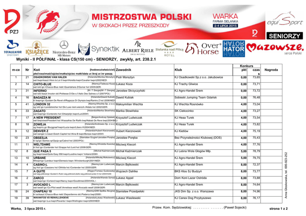 Wyniki - II PÓŁFINAŁ - klasa CS(150 cm) - SENIORZY, zwykły, art. 238.2.1 m-ce 1 2 3 Nr Koń płeć\rasa\maść\ojciec\matka/ojciec matki\data ur.\kraj ur.\nr paszp. [Holandia\Monika Morsztyn] Piotr Morsztyn OSADKOWSKI VAN HALEN 21 14 31 [hodowca\właściciel] Zawodnik Klub Konkurs pkt czas s KJ Osadkowski Sp.z o.o. Jakubowice 0,00 73,65 Łukasz Koza KJ Trachy Gliwice 0,00 73,71 Jarosław Skrzyczyński KJ Agro-Handel Śrem 0,00 73,72 Dawid Kubiak Sobieski Jumping Team Gdańsk 0,00 76,48 Maksymilian Wechta KJ Wechta Rosnówko 4,00 73,04 Marika Słowińska SK Ciekocinko 4,00 73,27 Krzysztof Ludwiczak KJ Heaa Turek 4,00 73,54 Krzysztof Ludwiczak KJ Heaa Turek 4,00 73,82 Hubert Kierznowski KJ Kietlów 4,00 75,19 Jarosław Poręba Bez Przynależności Klubowej (DOS) 4,00 75,43 Mściwoj Kiecoń KJ Agro-Handel Śrem 4,00 77,76 Michał Kaźmierczak KJ Leśna Wola Głogów Młp. 5,00 78,79 Mściwoj Kiecoń KJ Agro-Handel Śrem 5,00 79,75 Marcin Bętkowski KJ Agro-Handel Śrem 8,00 72,37 Wojciech Dahlke BKS Kłos SJ Budzyń 8,00 73,77 Łukasz Appel Dom Koni Lazar Ostróda 8,00 73,88 Marcin Bętkowski KJ Agro-Handel Śrem 8,00 74,64 Stanisław Przedpełski JKS Dim Sp. z o.o. Warszawa 8,00 74,96 Łukasz Wasilewski KJ Canex Dog Przybyszewo 8,00 76,17 Nagroda wał.\kwpn\kaszt.\Hors la Loi II kwpn\Horetta kwpn/Cavalier kwpn\2002\NED\ [Niemcy\Tadeusz Koza] CHITO-BLUE wał.\old.\gn.\Chacco-Blue mekl.\Quantahara Z/Quinar hol.\2005\GER\ [M i T Siergiej\M i T Siergiej] INFERNO wał.\old.\kaszt.\Incolor old.\Politesse D Ete s.f./Italic Des Salines s.f.\2007\POL\ [Holandia\Dawid Kubiak] 4 16 BAGAZZA M 5 41 kl.\kwpn\gn.\Quidam De Revel sf\Ragazza Di Olympia bwp/Ramiro Z hol.\2006\NED\ [Niemcy\Wechta Sp. z o.o.] LONDON 32 og.\old.\gn.\Landstreicher hol.\De Luxe niem.wierzch./Aldato hol.\2002\GER\ 6 33 [Holandia\Marika Słowińska] ZAGATO wał.\kwpn\gn.\Contendro hol.\Orbarjolijn kwpn/Lux\2004\\ 7 17 [Belgia\Andrzej Opłatek] A NEW PRESIDENT wał.\bwp\siwa\President hol.\Wassafras De Rialfo bwp/Nabab De Reve bwp\2004\BEL\ 8 18 [Holandia\Andrewex Sp. z o.o.] ZOWEJA og.\kwpn\c.gn.\Burggraaf kwpn\Lucia kwpn/Libero H\2004\NED\ 9 12 [Holandia\Hubert Kierznowski] DENVER Z wał.\zanger.\c.kaszt.\Dutch Capitol hol.\Kina B kwpn/Boreas kwpn\2004\\ 10 23 OBSESJA [Stanisław Grygier\Jarosław Poręba] kl.\sp\gn.\Santos sp\Opcja sp/Cabrol hol.\2003\POL\ 11 11 WELTDAME [Niemcy\Wioletta Kosicka] 12 8 QUE PASA 5 [\Michał Kaźmierczak] og.\kwpn\siwa\Quite Easy 958 kwpn\Luodine kwpn/ Voltaire\2006\\ 13 10 URBANE [Holandia\Mikołaj Moksiewicz] M\kwpn\gn.\Landeur kwpn\Demesis kwpn /Winckenburgh\2001\NED\ 14 4 CASINO-L [Niemcy\Jan Ludwiczak] og.\hol.\gn.\Cassiano hol.\Othilda hol./Contender hol.\2005\GER\ 15 7 A QUITE [Węgry\Tomasz Gudzowaty] wał.\węg.półkrew\gn.\Quidam's Rubin weg.pólkrew\Libelle weg.pólkrew/Landor S hol.\2004\HUN\ 16 2 ZARCO [Holandia\Wanda Szmyt] wał.\kwpn\gn.\Corland kwpn\Nancy kwpn/Goodtimes\2004\HOL.\ 17 3 AVOCADO L [Niemcy\Jan Ludwiczak] wał.\westf.\gn.\Co-Pilot westf.\Anneliese westf./Avocado westf.\2006\GER\ 18 24 CHAPEAU 10 [Niemcy\DIM Spółka Akcyjna] kl.\os\kaszt.\Chacco-Blue mekl.\Depardienne old./Padarco bwp\2006\\ 19 39 WAVANTOS VD RENVILLEHOEVE [Holandia\Łukasz Wasilewski] Anna Głoskowska, tel. 695-923-252 kl.\hol.\gn.\Contender hol.\Grappa hol./Lord hol.\2006\GER\ wał.\kwpn\gn.\Lux kwpn\Pavanta I kwpn/Wellington kwpn\2003\NED\ Warka, 3 lipca 2015 r. Przew. Kom. Sędziowskiej: . . . . . . . . . . . . . . . . (Paweł Sojecki) strona 1 z 2 Wyniki - II PÓŁFINAŁ - klasa CS(150 cm) - SENIORZY, zwykły, art. 238.2.1 m-ce Nr Koń [hodowca\właściciel] Konkurs pkt czas s Zawodnik Klub Wojciech Wojcianiec Bez Przynależności Klubowej (ZPO) Tomasz Miśkiewicz płeć\rasa\maść\ojciec\matka/ojciec matki\data ur.\kraj ur.\nr paszp. 20 43 [Niemcy\Stanisław Jasiński] QUO VADIS 8,00 76,88 LKS Nadwiślanin Kwidzyn 12,00 71,07 Paulina Koza KJ Trachy Gliwice 12,00 71,31 Ewelina Szczepanik TKJ Garbówek 12,00 72,73 Klaudia Siarkiewicz Stowarzyszenie WKJ Warszawa 12,00 73,37 Grzegorz Psiuk Sobieski Jumping Team Gdańsk 16,00 73,52 Hubert Kierznowski KJ Kietlów 16,00 75,25 Michał Ziębicki KJK Szary Michałowice 16,00 76,18 Sławomir Uchwat JKS Pogórze Glinik Zaborowski 18,00 98,85 Łukasz Appel Dom Koni Lazar Ostróda 20,00 75,88 Marika Słowińska SK Ciekocinko 32,00 70,93 Grzegorz Psiuk Sobieski Jumping Team Gdańsk elim. Maksymilian Wechta KJ Wechta Rosnówko elim. Łukasz Brzóska KJ Miralex Jakubowo rezyg. Jarosław Skrzyczyński KJ Agro-Handel Śrem rezyg. Tomasz Miśkiewicz LKS Nadwiślanin Kwidzyn rezyg. Wojciech Wojcianiec Bez Przynależności Klubowej (ZPO) rezyg. Ewelina Szczepanik TKJ Garbówek rezyg. Klaudia Siarkiewicz Stowarzyszenie WKJ Warszawa rezyg. Michał Kaźmierczak KJ Leśna Wola Głogów Młp. rezyg. Stanisław Przedpełski JKS Dim Sp. z o.o. Warszawa wycof. Łukasz Brzóska KJ Miralex Jakubowo wycof. Nagroda og.\old.\sk.gn.\Quidams Rubin hol.\Hawana old./Liberty Life old.\2005\GER\ 21 19 [SK Racot\SK Racot] BORA kl.\wlkp.\gn.\Avero hol.\Bogoria wlkp/Sterowiec xx\2004\POL\ 22 15 [Holandia\Agnieszka Gruca] BANJO-BOY og.\kwpn\kaszt.\Sjapoo kwpn\Telvera kwpn/Matterhorn kwpn\2006\NED\ 23 37 STUNTMAN 10 [Niemcy\Dariusz Michalak] wał.\han.\kara\Silvio I old.\Silver Dream han./Singular Joter hol.\2005\\ 24 28 [Niemcy\Horst Karcher] CAPRINI 3 wał.\zweib.\gn.\Cento hol.\Lalic/Lord Calando hol.\2001\GER\ 25 27 [Niemcy\Weronika Wilska] CASSATO og.\hol.\siwa\Cassini II hol.\Petite II hol./Literat old.\2004\GER\ 26 13 [\Przemysław Sawicki] NEVER MIND 22 wał.\kwpn\gn.\Numero Uno kwpn\Chantana kwpn/Legaat kwpn\2004\\ 27 44 HEARTBREKER 5 [Holandia\Michał Ziębicki] wał.\kwpn\gn.\Heartbreaker kwpn\Nafanory kwpn/G. Ramiro Z\2001\HOL.\ 28 38 [Niemcy\Marta Roszkiewicz-Heizer] NEGRO wał.\han.\kara\Now Or Never M nl\Grace han./Graf Granus han.\2004\GER\ 29 1 [\] CASPER XXI wał.\\\Unitair\Vita Triple R\2007\\ 30 32 [Holandia\Marika Słowińska] VIPER W Z wał.\zanger.\kara\Vigo Darso