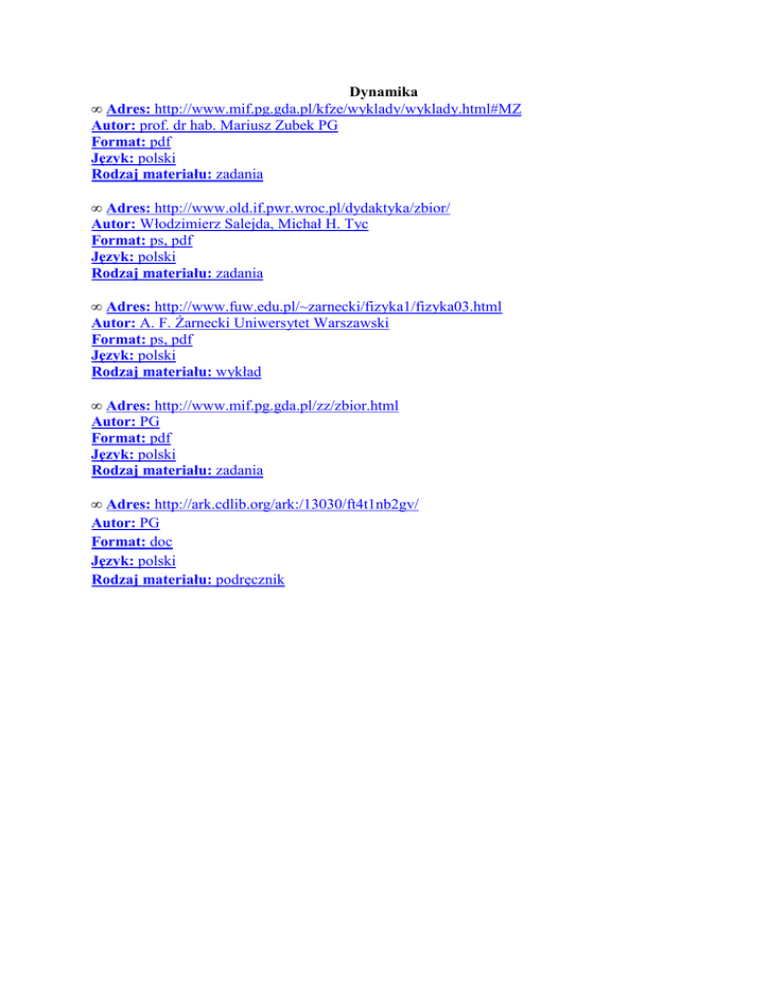 Dynamika • Adres: http://www.mif.pg.gda.pl/kfze/wyklady/wyklady.html#MZ Autor: prof. dr hab. Mariusz Zubek PG Format: pdf Język: polski Rodzaj materiału: zadania • Adres: http://www.old.if.pwr.wroc.pl/dydaktyka/zbior/ Autor: Włodzimierz Salejda, Michał H. Tyc Format: ps, pdf Język: polski Rodzaj materiału: zadania • Adres: http://www.fuw.edu.pl/~zarnecki/fizyka1/fizyka03.html Autor: A. F. śarnecki Uniwersytet Warszawski Format: ps, pdf Język: polski Rodzaj materiału: wykład • Adres: http://www.mif.pg.gda.pl/zz/zbior.html Autor: PG Format: pdf Język: polski Rodzaj materiału: zadania • Adres: http://ark.cdlib.org/ark:/13030/ft4t1nb2gv/ Autor: PG Format: doc Język: polski Rodzaj materiału: podręcznik