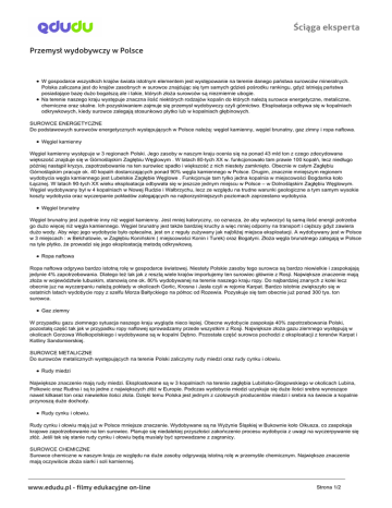 Ściąga eksperta Przemysł wydobywczy w Polsce W gospodarce wszystkich krajów świata istotnym elementem jest występowanie na terenie danego państwa surowców mineralnych. Polska zaliczana jest do krajów zasobnych w surowce znajdując się tym samych gdzieś pośrodku rankingu, gdyż istnieją państwa posiadające bazę dużo bogatszą ale i takie, których złoża surowców są niezmiernie ubogie. Na terenie naszego kraju występuje znaczna ilość niektórych rodzajów kopalin do których należą surowce energetyczne, metaliczne, chemiczne oraz skalne. Ich pozyskiwaniem zajmuje się przemysł wydobywczy czyli górnictwo. Eksploatacja odbywa się w kopalniach odkrywkowych, kiedy surowce zalegają stosunkowo płytko lub w kopalniach głębinowych. SUROWCE ENERGETYCZNE Do podstawowych surowców energetycznych występujących w Polsce należą: węgiel kamienny, węgiel brunatny, gaz zimny i ropa naftowa. Węgiel kamienny Węgiel kamienny występuje w 3 regionach Polski. Jego zasoby w naszym kraju ocenia się na ponad 43 mld ton z czego zdecydowana większość znajduje się w Górnośląskim Zagłębiu Węglowym . W latach 80-tych XX w. funkcjonowało tam prawie 100 kopalń, lecz niedługo później nastąpił kryzys, zapotrzebowanie na ten surowiec spadło i większość z nich niestety zamknięto. Obecnie w całym Zagłębiu Górnośląskim pracuje ok. 40 kopalń dostarczających ponad 90% węgla kamiennego w Polsce. Drugim, znacznie mniejszym regionem wydobycia węgla kamiennego jest Lubelskie Zagłębie Węglowe . Funkcjonuje tam tylko jedna kopalnia w miejscowości Bogdanka koło Łącznej. W latach 90-tych XX wieku eksploatacja odbywała się w jeszcze jednym miejscu w Polsce – w Dolnośląskim Zagłębiu Węglowym. Węgiel wydobywany był w 4 kopalniach w Nowej Rudzie i Wałbrzychu, lecz ze względu na trudne warunki geologiczne a tym samym wysokie koszty wydobycia oraz wyczerpanie pokładów zalegających na najkorzystniejszych poziomach zaprzestano wydobycia. Węgiel brunatny Węgiel brunatny jest zupełnie inny niż węgiel kamienny. Jest mniej kaloryczny, co oznacza, że aby wytworzyć tą samą ilość energii potrzeba go dużo więcej niż węgla kamiennego. Węgiel brunatny jest także bardziej kruchy a więc mniej odporny na transport i cięższy gdyż zawiera dużo wody. Aby więc jego wydobycie było opłacalne, jest on z reguły zużywany jak najbliżej miejsca eksploatacji. A wydobywany jest w Polsce w 3 miejscach : w Bełchatowie, w Zagłębiu Konińskim ( miejscowości Konin i Turek) oraz Bogatyni. Złoża węgla brunatnego zalegają w Polsce na tyle płytko, że prowadzi się jego eksploatacją metodą odkrywkową. Ropa naftowa Ropa naftowa odgrywa bardzo istotną rolę w gospodarce światowej. Niestety Polskie zasoby tego surowca są bardzo niewielkie i zaspokajają jedynie 4% zapotrzebowania. Dlatego też tak jak z resztą wiele krajów importujemy ten surowiec głównie z Rosji. Największe znaczenie mają złoża w województwie lubuskim, stanowią one ok. 80% wydobywanej na terenie naszego kraju ropy. Do najbardziej znanych z kolei lecz obecnie juz na wyczerpaniu należą pokłady w okolicach Gorlic, Krosna i Jasła czyli w rejonie Karpat. Bardzo istotnie zwiększyło się w ostatnich latach wydobycie ropy z szelfu Morza Bałtyckiego na północ od Rozewia. Pozyskuje się tam obecnie już ponad 300 tys. ton surowca. Gaz ziemny W przypadku gazu ziemnego sytuacja naszego kraju wygląda nieco lepiej. Obecne wydobycie zaspokaja 40% zapotrzebowania Polski, pozostałą część tak jak w przypadku ropy naftowej sprowadzamy przede wszystkim z Rosji. Największe złoża gazu ziemnego występują w okolicach Gorzowa Wielkopolskiego i wydobywane są w kopalni Dębno. Pozostała część surowca pochodzi z eksploatacji z terenów Karpat i Kotliny Sandomierskiej. SUROWCE METALICZNE Do surowców metalicznych występujących na terenie Polski zaliczymy rudy miedzi oraz rudy cynku i ołowiu. Rudy miedzi Największe znaczenie mają rudy miedzi. Eksploatowane są w 3 kopalniach na terenie zagłębia Lubińsko-Głogowskiego w okolicach Lubina, Polkowic oraz Rudna i są to jedne z największych złóż w Europie. Podczas wydobycia miedzi uzyskuje się duże ilości srebra wynoszące nawet kilkaset ton oraz niewielkie ilości złota. Dzięki temu Polska jest jednym z czołowych producentów miedzi i srebra na świecie a kopalnie przynoszą duże dochody. Rudy cynku i ołowiu. Rudy cynku i ołowiu mają już w Polsce mniejsze znaczenie. Wydobywane są na Wyżynie Śląskiej w Bukownie koło Olkusza, co zaspokaja krajowe zapotrzebowanie na ten surowiec. Planuje się niedalekiej przyszłości zakończenie procesu wydobycia z uwagi na wyczerpywanie się złóż. Jeśli tak się stanie rudy cynku i ołowiu będą musiały być sprowadzane z zagranicy. SUROWCE CHEMICZNE Surowce chemiczne w naszym kraju ze względu na duże zasoby odgrywają istotną rolę w przemyśle chemicznym. Największe znaczenie mają oczywiście złoża siarki i soli kamiennej. www.edudu.pl - filmy edukacyjne on-line Strona 1/2 Ściąga eksperta Siarka Złoża siarki w rejonie Tarnobrzega należą do największych na świecie i tym samym Polska należy do największych jej producentów. Przed laty funkcjonowały kopalnie odkrywkowe jeszcze w Piasecznie, Staszowie i Machowie, lecz wynalezienie metody pozyskiwania dużej ilości siarki z odsiarczania ropy naftowej i gazu ziemnego spowodowało, że kopalnie zamknięto. Obecnie siarkę wydobywa się w jedynej dużej kopalni w Osieku koło Tarnobrzega za pomocą metody otworowej. Sól kamienna Wydobycie soli kamiennej w Polsce ma bardzo długie tradycje. Pierwsze kopalnie w Bochni i Wieliczce znane były już w średniowieczu i z resztą znane są na całym świecie do dziś. Z tą różnicą jednak, że obecnie stanowią bardziej wartość muzealną niż eksploatacyjną. Na skalę przemysłową sól wydobywa się w okolicach Kłodawy, Inowrocławia i Mogilna 