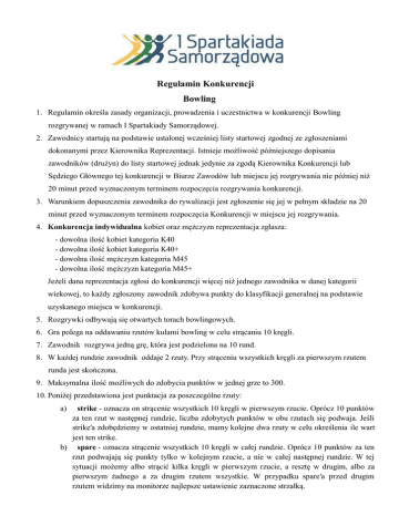 Regulamin Konkurencji Bowling 1. Regulamin określa zasady organizacji, prowadzenia i uczestnictwa w konkurencji Bowling rozgrywanej w ramach I Spartakiady Samorządowej. 2. Zawodnicy startują na podstawie ustalonej wcześniej listy startowej zgodnej ze zgłoszeniami dokonanymi przez Kierownika Reprezentacji. Istnieje możliwość późniejszego dopisania zawodników (drużyn) do listy startowej jednak jedynie za zgodą Kierownika Konkurencji lub Sędziego Głównego tej konkurencji w Biurze Zawodów lub miejscu jej rozgrywania nie później niż 20 minut przed wyznaczonym terminem rozpoczęcia rozgrywania konkurencji. 3. Warunkiem dopuszczenia zawodnika do rywalizacji jest zgłoszenie się jej w pełnym składzie na 20 minut przed wyznaczonym terminem rozpoczęcia Konkurencji w miejscu jej rozgrywania. 4. Konkurencja indywidualna kobiet oraz mężczyzn reprezentacja zgłasza: - dowolna ilość kobiet kategoria K40 - dowolna ilość kobiet kategoria K40+ - dowolna ilość mężczyzn kategoria M45 - dowolna ilość mężczyzn kategoria M45+ Jeżeli dana reprezentacja zgłosi do konkurencji więcej niż jednego zawodnika w danej kategorii wiekowej, to każdy zgłoszony zawodnik zdobywa punkty do klasyfikacji generalnej na podstawie uzyskanego miejsca w konkurencji. 5. Rozgrywki odbywają się otwartych torach bowlingowych. 6. Gra polega na oddawaniu rzutów kulami bowling w celu strącaniu 10 kręgli. 7. Zawodnik rozgrywa jedną grę, która jest podzielona na 10 rund. 8. W każdej rundzie zawodnik oddaje 2 rzuty. Przy strąceniu wszystkich kręgli za pierwszym rzutem runda jest skończona. 9. Maksymalna ilość możliwych do zdobycia punktów w jednej grze to 300. 10. Poniżej przedstawiona jest punktacja za poszczególne rzuty: strike - oznacza on strącenie wszystkich 10 kręgli w pierwszym rzucie. Oprócz 10 punktów za ten rzut w następnej rundzie, liczba zdobytych punktów w obu rzutach się podwaja. Jeśli strike'a zdobędziemy w ostatniej rundzie, mamy kolejne dwa rzuty w celu określenia ile wart jest ten strike. b) spare - oznacza strącenie wszystkich 10 kręgli w całej rundzie. Oprócz 10 punktów za ten rzut podwajają się punkty tylko w kolejnym rzucie, a nie w całej następnej rundzie. W tej sytuacji możemy albo strącić kilka kręgli w pierwszym rzucie, a resztę w drugim, albo za pierwszym żadnego a za drugim rzutem wszystkie. W przypadku spare'a przed drugim rzutem widzimy na monitorze najlepsze ustawienie zaznaczone strzałką. a) open frame - to sytuacja, w której gracz zbił tylko kilka kręgli. Otrzymuje on wtedy tyle punktów, ile strącił kręgli. d) miss - sytuacja, w której gracz w ogóle nie strąca żadnego kręgla. 11. W przypadku, gdy najlepszy wynik uzyska 2 lub więcej zawodników nastąpi dodatkowa gra c) (dogrywka) pomiędzy tymi graczami. 12. W sprawach spornych i nieobjętych niniejszym regulaminem decyduje Sędzia i Kierownik Konkurencji. Ewentualne protesty mogą być zgłaszane zgodnie Regulaminem Spartakiady. 13. Organizator zastrzega sobie prawo do zmian treści niniejszego regulaminu konkurencji o czym niezwłocznie powiadomi jej uczestników poprzez stronę spartakiady, komunikaty słowne, przekazanie informacji Kierownikom Reprezentacji.