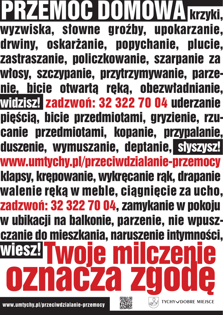 przemoc domowA krzyki, wyzwiska, słowne groźby, upokarzanie, drwiny, oskarżanie, popychanie, plucie, zastraszanie, policzkowanie, szarpanie za włosy, szczypanie, przytrzymywanie, parzenie, bicie otwartą ręką, obezwładnianie, widzisz! zadzwoń: 32 322 70 04 uderzanie pięścią, bicie przedmiotami, gryzienie, rzucanie przedmiotami, kopanie, przypalanie, duszenie, wymuszanie, deptanie, słyszysz! www.umtychy.pl/przeciwdzialanie-przemocy klapsy, krępowanie, wykręcanie rąk, drapanie walenie ręką w meble, ciągnięcie za ucho, zadzwoń: 32 322 70 04, zamykanie w pokoju w ubikacji na balkonie, parzenie, nie wpuszczanie do mieszkania, naruszenie intymności, Twoje milczenie wiesz! oznacza zgodę www.umtychy.pl/przeciwdzialanie-przemocy