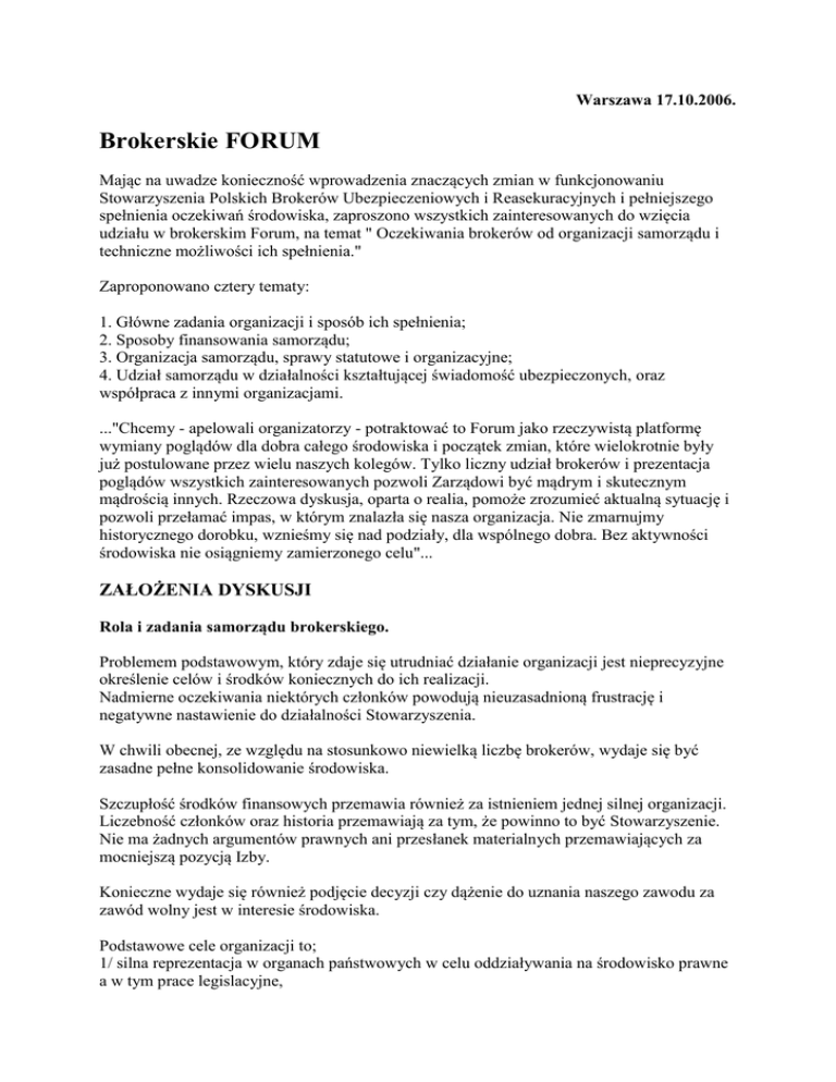 udziału w brokerskim Forum, na temat " Oczekiwania brokerów od organizacji samorządu i
