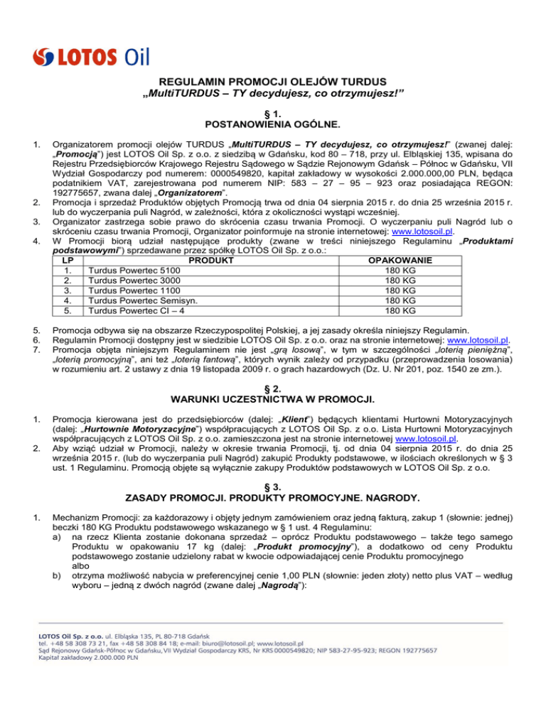 REGULAMIN PROMOCJI OLEJÓW TURDUS „MultiTURDUS – TY decydujesz, co otrzymujesz!” § 1. POSTANOWIENIA OGÓLNE. 1. 2. 3. 4. 5. 6. 7. Organizatorem promocji olejów TURDUS „MultiTURDUS – TY decydujesz, co otrzymujesz!” (zwanej dalej: „Promocją”) jest LOTOS Oil Sp. z o.o. z siedzibą w Gdańsku, kod 80 – 718, przy ul. Elbląskiej 135, wpisana do Rejestru Przedsiębiorców Krajowego Rejestru Sądowego w Sądzie Rejonowym Gdańsk – Północ w Gdańsku, VII Wydział Gospodarczy pod numerem: 0000549820, kapitał zakładowy w wysokości 2.000.000,00 PLN, będąca podatnikiem VAT, zarejestrowana pod numerem NIP: 583 – 27 – 95 – 923 oraz posiadająca REGON: 192775657, zwana dalej „Organizatorem”. Promocja i sprzedaż Produktów objętych Promocją trwa od dnia 04 sierpnia 2015 r. do dnia 25 września 2015 r. lub do wyczerpania puli Nagród, w zależności, która z okoliczności wystąpi wcześniej. Organizator zastrzega sobie prawo do skrócenia czasu trwania Promocji. O wyczerpaniu puli Nagród lub o skróceniu czasu trwania Promocji, Organizator poinformuje na stronie internetowej: www.lotosoil.pl. W Promocji biorą udział następujące produkty (zwane w treści niniejszego Regulaminu „Produktami podstawowymi”) sprzedawane przez spółkę LOTOS Oil Sp. z o.o.: LP PRODUKT OPAKOWANIE 1. Turdus Powertec 5100 180 KG 2. Turdus Powertec 3000 180 KG 3. Turdus Powertec 1100 180 KG 4. Turdus Powertec Semisyn. 180 KG 5. Turdus Powertec CI – 4 180 KG Promocja odbywa się na obszarze Rzeczypospolitej Polskiej, a jej zasady określa niniejszy Regulamin. Regulamin Promocji dostępny jest w siedzibie LOTOS Oil Sp. z o.o. oraz na stronie internetowej: www.lotosoil.pl. Promocja objęta niniejszym Regulaminem nie jest „grą losową”, w tym w szczególności „loterią pieniężną”, „loterią promocyjną”, ani też „loterią fantową”, których wynik zależy od przypadku (przeprowadzenia losowania) w rozumieniu art. 2 ustawy z dnia 19 listopada 2009 r. o grach hazardowych (Dz. U. Nr 201, poz. 1540 ze zm.). § 2. WARUNKI UCZESTNICTWA W PROMOCJI. 1. 2. Promocja kierowana jest do przedsiębiorców (dalej: „Klient”) będących klientami Hurtowni Motoryzacyjnych (dalej: „Hurtownie Motoryzacyjne”) współpracujących z LOTOS Oil Sp. z o.o. Lista Hurtowni Motoryzacyjnych współpracujących z LOTOS Oil Sp. z o.o. zamieszczona jest na stronie internetowej www.lotosoil.pl. Aby wziąć udział w Promocji, należy w okresie trwania Promocji, tj. od dnia 04 sierpnia 2015 r. do dnia 25 września 2015 r. (lub do wyczerpania puli Nagród) zakupić Produkty podstawowe, w ilościach określonych w § 3 ust. 1 Regulaminu. Promocją objęte są wyłącznie zakupy Produktów podstawowych w LOTOS Oil Sp. z o.o. § 3. ZASADY PROMOCJI. PRODUKTY PROMOCYJNE. NAGRODY. 1. Mechanizm Promocji: za każdorazowy i objęty jednym zamówieniem oraz jedną fakturą, zakup 1 (słownie: jednej) beczki 180 KG Produktu podstawowego wskazanego w § 1 ust. 4 Regulaminu: a) na rzecz Klienta zostanie dokonana sprzedaż – oprócz Produktu podstawowego – także tego samego Produktu w opakowaniu 17 kg (dalej: „Produkt promocyjny”), a dodatkowo od ceny Produktu podstawowego zostanie udzielony rabat w kwocie odpowiadającej cenie Produktu promocyjnego albo b) otrzyma możliwość nabycia w preferencyjnej cenie 1,00 PLN (słownie: jeden złoty) netto plus VAT – według wyboru – jedną z dwóch nagród (zwane dalej „Nagrodą”): PRODUKT (1 BECZKA 180 KG) NAGRODA I Turdus Powertec 5100 Turdus Powertec 3000 Turdus Powertec 1100 Turdus Powertec Semisyn. Turdus Powertec CI – 4 1 BILET NA MECZ REPREZENTACJI POLSKI I IRLANDII W ELIMINACJACH MISTRZOSTW EUROPY ROZGRYWANY W DNIU 11.10.2015 R. NA STADIONIE NARODOWYM W WARSZAWIE 2. NAGRODA II ( JEDEN ZESTAW ODZIEŻY 4F) ALBO KURTKA + POLAR + POLO Dodatkowym koniecznym warunkiem otrzymania Produktu promocyjnego albo Nagrody jest brak posiadania względem LOTOS Oil Sp. z o.o. przeterminowanych należności. 3. Klienta, który otrzyma Nagrodę określa się w skrócie „Uczestnikiem Promocji”. 4. Ilość Produktów Promocyjnych oraz Nagród jest ograniczona. O pierwszeństwie wydania Nagród Uczestnikom Promocji decyduje kolejność złożenia w LOTOS Oil Sp. z o.o. zamówienia na Produkty podstawowe (zarejestrowania oraz realizacji przez LOTOS Oil Sp. z o.o. zamówienia). Rejestr zamówień jest prowadzony na podstawie raportu z Biura Obsługi Sprzedaży, na podstawie wyciągu z systemu SAP. 5. Klient może dokonać zakupów w ramach Promocji wielokrotnie i może wziąć udział w Promocji wielokrotnie, pod warunkiem spełnienia wymogów określonych w Regulaminie. 6. Sposób wyboru przez Klienta opcji Produkt promocyjny bądź Nagroda: a) jeśli Klient składa zamówienie na Produkty podstawowe poprzez system informatyczny, w polu „UWAGI” winien wpisać: „gratis własny” – w przypadku wyboru Produktu promocyjnego, „gratis inny” – w przypadku wyboru Nagrody, b) jeśli Klient składa zamówienie na Produkty podstawowe za pośrednictwem Doradcy Techniczno – Handlowego LOTOS Oil Sp. z o.o. – informację o wyborze Produktu promocyjnego bądź konkretnej Nagrody przekazuje w/w Doradcy Techniczno – Handlowemu drogą mailową. 7. Dokonany – na zasadach określonych w ust. 6 – przez Klienta wybór Produktu promocyjnego bądź Nagrody nie może być w późniejszym czasie zmieniony. W przypadku wyboru przez Klienta Nagrody w postaci zestawu odzieży 4F i braku zamówionych rozmiarów, Organizator kontaktować się będzie z Klientem celem ustalenia innych rozmiarów odzieży. W przypadku braku wskazania rozmiaru odzieży przez Klienta w trybie wskazanym w ust. 6, decyzja w tym zakresie leżeć będzie w gestii Organizatora, zaś wszelkie roszczenia Klienta w tym zakresie są wyłączone. 8. Każdy z Uczestników Promocji, który zdecydował się na wybór Nagrody w postaci Biletu na mecz, jest bezwzględnie zobowiązany przesła