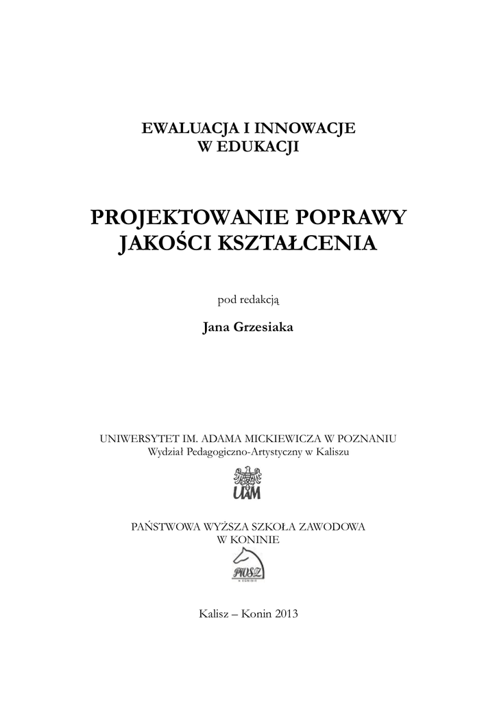 EWALUACJA I INNOWACJE W EDUKACJI PROJEKTOWANIE POPRAWY JAKOŚCI KSZTAŁCENIA pod redakcją Jana Grzesiaka UNIWERSYTET IM. ADAMA MICKIEWICZA W POZNANIU Wydział Pedagogiczno-Artystyczny w Kaliszu PAŃSTWOWA WYŻSZA SZKOŁA ZAWODOWA W KONINIE Kalisz – Konin 2013 Tytuł: Projektowanie poprawy jakości kształcenia Tytuł serii: Ewaluacja i innowacje w edukacji Recenzja: prof. zw. dr hab. Wojciech Kojs prof. dr hab. Włodzimierz Prokopiuk Opracowanie redakcyjne: Ewa Kapyszewska Skład i łamanie: Piotr Bajak Projekt okładki: Krzysztof Kraszkiewicz © Copyright by Jan Grzesiak & WPA UAM w Kaliszu & PWSZ w Koninie Wszelkie prawa zastrzeżone ISBN: 978-83-88335-86-0 Wydawcy: Uniwersytet im. Adama Mickiewicza w Poznaniu Wydział Pedagogiczno-Artystyczny w Kaliszu 62-800 Kalisz, ul. Nowy Świat 28-30 tel. 062 767 07 30, e-mail: [email protected] Państwowa Wyższa Szkoła Zawodowa w Koninie 62-510 Konin, ul. kard. S. Wyszyńskiego 3C, tel. 063 249 72 09, e-mail: [email protected] Druk: SOWA Sp. z o.o. ul. Hrubieszowska 6a 01-209 Warszawa tel. 022 431 81 40, fax 022 431 81 50 e-mail: [email protected] SPIS TREŚCI Jan Grzesiak – Modelowanie projektowania poprawy jakości kształcenia wyzwaniem dzisiaj – wczoraj i jutro 11 Część I METODOLOGICZNE UWARUNKOWANIA PROJEKTOWANIA POPRAWY JAKOŚCI EDUKACJI W DOBIE SPOŁECZEŃSTWA INFORMACYJNEGO Kazimierz Denek – Projektowanie poprawy jakości kształcenia w szkole wyższej i jej uwarunkowania Kazimierz Wenta – Pułapki w projektowaniu poprawy jakości kształcenia Anna Karpińska – Neurodydaktyczne podstawy projektowania poprawy jakości kształcenia Jan Grzesiak – Projektowanie poprawy jakości badań pedagogicznych versus projektowanie poprawy jakości edukacji Bronisław Siemieniecki – Dyskusja nad jakością kształcenia informatycznego Elżbieta Piątek – Szkoła wielu kultur – szkołą przyszłości? Nauczyciele i uczniowie wobec nowych wyzwań Ewelina Strawa – Jak uczyć ludzi pokolenia sieci? Rozterki digitalnego imigranta Iwona Samborska – Doświadczenia egzystencjalne i ich potencjał kompetencyjny wobec poprawy jakości edukacji Łarisa Ikonnikowa – Интерпретаторское искусство хорового дирижера в контексте системной методологии Ewelina Poniedziałek, Marian Walczak – Permanentny proces poszukiwania doskonalszej jakości kształcenia w dziejach edukacji 21 31 43 53 63 73 83 93 103 109 Część II PROJEKTOWANIE POPRAWY JAKOŚCI KSZTAŁCENIA W SZKOLNICTWIE WYŻSZYM Czesław Plewka – Krajowe Ramy Kwalifikacji jako instrumentarium w procesie dążenia do nieustannej poprawy jakości kształcenia czy biurokratyczna pozoracja? Danuta Waloszek – Zmiana w kształceniu praktycznym nauczycieli. Konieczna i możliwa Anna Krajewska – Współdziałanie dydaktyczne osób w realizacji procesu kształcenia w ocenie studentów i nauczycieli oraz jego uwarunkowania – wyniki badań Elżbieta Marek – Rozwijanie wielorakich inteligencji w procesie kształcenia nauczycieli wczesnej edukacji Sabina Wieruszewska-Duraj – Poprawa jakości rozwijania praktycznych kompetencji zawodowych przyszłych nauczycieli Tatiana Frołowa – О психологической подготовке студента-музыканта к концертному выступлению 125 135 147 157 169 175 Raisa Lewina – К вопросу изучения «хоровых пейзажей» белорусских композиторов в классе дирижирования Katarzyna Wojciechowska – Wizerunek nauczyciela – edukatora zdrowia w opinii studentów pedagogiki wczesnoszkolnej Irena Smucerowicz – Ewaluacja w kształtowaniu kompetencji przyszłych nauczycieli a jakość kształcenia w szkole wyższej 181 187 197 Część III PROJEKTOWANIE POPRAWY JAKOŚCI KSZTAŁCENIA W IMIĘ POSTĘPU PEDAGOGICZNEGO WE WSPÓŁCZESNEJ SZKOLE Gabriela Kapica – Sztuka czytania jako wartość w świadomości młodszych uczniów Krystyna Żuchelkowska – Wypalenie zawodowe u nauczycieli przedszkoli. Jak sobie z nim radzić? Stanisława Włoch – Teorie rozwoju a efekty kształcenia uczniów w młodszym wieku szkolnym Paweł Prusak, Jadwiga Sala – Projektowanie nauczania – uczenia się na lekcji Aleksandra Janocha – Schülerfeedback als beitrag zur verbesserung des unterrichts an deutschen schulen Karolina Kwak – Nauczyciel jako pogromca mitów. Digitalno-genderowa perspektywa interpretacyjna pomysłem na poprawę jakości kształcenia w szkole ponadgimnazjalnej Mirosław Kordowski – Jakość przygotowania dzieci i młodzieży do uczestnictwa (udziału) w orkiestrze dętej Paweł A. Trzos – Zdolności i twórcze osiągnięcia muzyczne – ku indywidualizacji pomiaru Bożena Jakubczak – Projektowanie zajęć dydaktycznych z wykorzystaniem tablicy interaktywnej SMART Board Kazimierz Żegnałek – Czas wolny uczniów jako czynnik warunkujący jakość kształcenia Ewa Czaja, Halina Wróżyńska – Czas wolny dzieci i młodzieży a jakość kształcenia Małgorzata Prokosz – Innowacyjne formy realizacji zajęć wolnoczasowych w świetlicy szkolnej Małgorzata Gałczyńska, Marianna Styczyńska – Zajęcia pozalekcyjne ofertą do ciekawej codzienności dziecka – ewaluacja projektu „Akademia rozwoju i poznania” Krzysztof Zajdel – Ocenianie wobec założonych efektów kształcenia Ewa Kochanowska – Pytania dydaktyczne jako narzędzia indywidualizacji procesu kształcenia dzieci w młodszym wieku szkolnym Anna Romanowska-Tołłoczko, Agata Nowak, Piotr Oleśniewicz – Asertywność i samoocena a relacje interpersonalne młodzieży gimnazjalnej 213 225 233 243 251 261 271 285 291 303 311 321 333 343 357 367 Część IV ZARZĄDZANIE PROJEKTOWANIEM POPRAWY JAKOŚCI KSZTAŁCENIA W SZKOLE I W UCZELNI Artur Zimny, Jerzy Jasiński – Jakość czy jakoś? Dylematy wokół zarządzania jakością kształcenia w uczelni zawodowej Leszek Pawelski – Dyrektor