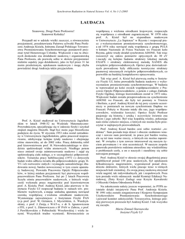 Synchrotron Radiation in Natural Science Vol. 4, No 1-2 (2005 LAUDACJA Szanowny, Drogi Panie Profesorze! Szanowni Koledzy! współpracą z wieloma ośrodkami krajowymi, rozpoczęła się współpraca z ośrodkami zagranicznymi. W 1970 roku prof. A. Kisiel był na stypendium naukowym w Uniwersytecie „La Sapienza” w Rzymie i rozpoczął prace z wykorzystaniem promieniowania synchrotronowego, a od 1974 roku nawiązał stałą współpracę z grupą PULS w Istituto Nazionale di Fisica Nucleare we Frascati koło Rzymu, gdzie wtedy działał synchrotron ADONE. Tak więc rozszerzył się zakres pomiarów optycznych do 30 eV i zaczęły się kolejno badania struktury lokalnej metodą EXAFS i struktury elektronowej metodą XANES dla związków półprzewodnikowych. Oprócz prac doświadczalnych prowadzone były obliczenia teoretyczne struktury pasmowej mieszanych związków półprzewodnikowych, co pozwoliło na bardziej kompleksowe opracowania. Tak więc prof. A. Kisiel był pierwszą osobą w Instytucie Fizyki UJ, która prowadziła badania naukowe z wykorzystaniem promieniowania synchrotronowego. W badania te wprowadzał po kolei swoich współpracowników z Pracowni Optyki Półprzewodników, a potem z całego Zakładu Fizyki Ogólnej, którego kierownikiem został w 1973 roku. Większość badań została przeprowadzona na synchrotronie ADONE we Frascati, ale były też pomiary w Trieście i Berlinie, a prof. Andrzej Kisiel do tej pory czynnie uczestniczy w pomiarach na nowym synchrotronie Daphne we Frascati. Pobyty w Rzymie miały dla nas, jego współpracowników, wielorakie korzyści. Oprócz fizyki Profesor pasjonuje się historią i sztuką i oczywiście świetnie zna Rzym i jego zabytki. Był więc kopalnią wiedzy, pokazując nam różne ciekawe miejsca, o których nie można było przeczytać w najlepszych przewodnikach. Prof. Andrzej Kisiel bardzo ceni sobie wartości „rodzinne”. Sam posiada troje dzieci i obecnie siedmioro wnucząt i zawsze nam powtarzał, że praca jest bardzo ważna, ale są też inne ważne rzeczy, o których nie można zapominać. W związku z tym zawsze interesował się naszym życiem prywatnym i w nim uczestniczył. W naszym zespole panowała prawdziwie rodzinna atmosfera: my wiedzieliśmy o problemach szefa, a on o naszych i staraliśmy się sobie nawzajem pomagać. Prof. Andrzej Kisiel w okresie swojej długoletniej pracy opublikował ponad 150 prac naukowych, był opiekunem kilkudziesięciu magistrantów, wypromował ponad dwudziestu doktorów, których wielu pracuje teraz w różnych miejscach kuli ziemskiej. Za swoją pracę naukową otrzymał wiele nagród, tak indywidualnych, jak i zespołowych. Poza tym posiada wiele odznaczeń: medal Komisji Edukacji Narodowej, Złoty Krzyż Zasługi oraz Krzyże Kawalerski i Oficerski Orderu Odrodzenia Polski. Na zakończenie należy jeszcze wspomnieć, że PTPS zaistniało dzięki inicjatywie Pana Prof. Andrzeja Kisiela. W 1991 roku zostało zorganizowane I Krajowe Sympozjum Użytkowników Promieniowania Synchrotronowego i powstał komitet założycielski Towarzystwa, którego później pierwszym prezesem był Andrzej Kisiel. I tak wszystko się zaczęło. Przypadł mi w udziale wielki zaszczyt, a równocześnie przyjemność, przedstawienia Państwu sylwetki Pana Profesora Andrzeja Kisiela, któremu Zarząd Polskiego Towarzystwa Promieniowania Synchrotronowego postanowił przyznać tytuł Honorowego Członka. Większość z nas tu obecnych doskonale zna działalność naukową i organizatorską Pana Profesora, ale pozwolę sobie w skrócie przypomnieć niektóre aspekty jego działalności, jako że był przez 31 lat moim przełożonym, opiekunem naukowym i mogę chyba powiedzieć drogi Andrzeju także przyjacielem. Prof. A. Kisiel studiował na Uniwersytecie Jagiellońskim w latach 1948-52 na Wydziale MatematycznoPrzyrodniczym, specjalizując się w zakresie fizyki i uzyskał stopień magistra filozofii. Stąd być może jego filozoficzne podejście do życia. W styczniu 1953 roku został zatrudniony w Uniwersytecie Jagiellońskim, gdzie pracował nieprzerwanie, zdobywając kolejne tytuły naukowe i obejmując różne stanowiska, aż do 2002 roku. Pracę doktorską robił pod kierownictwem prof. H. Niewodniczańskiego w dziedzinie spektroskopii widm atomowych. Niedługo potem nieco zmienił swoje zainteresowania naukowe i zajął się spektroskopią ciała stałego, a w szczególności półprzewodników. Tematyka pracy habilitacyjnej (1972 r.) dotyczyła badań widm odbicia światła dla półprzewodników grupy IIVI i ich roztworów stałych i wymagała samodzielnego zbudowania nowej, bardzo nowoczesnej w tym czasie aparatury badawczej. Powstała Pracownia Optyki Półprzewodników, w której miałam przyjemność być pierwszym współpracownikiem Pana Profesora. Już po 2 latach Pracownia liczyła ośmiu pracowników naukowych, z których większość wykonała prace magisterskie pod kierownictwem prof. A. Kisiela. Prof. Andrzej Kisiel, jako pierwszy w Instytucie Fizyki UJ rozpoczął badania w ramach tzw. problemów węzłowych, a mając unikalną aparaturę nawiązał szeroką współpracę z wieloma ośrodkami naukowymi. Wymieniając najważniejsze: z Instytutem Fizyki PAN (z p. prof. prof. W. Giriatem, J. Mycielskim, A. Wardzyńskim), z prof. J. Żmiją z WAT-u, z dr S. Ignatowiczem z ITE, z prof. L. Żdanowiczem z IF PAN w Zabrzu, z prof. J. Pawlikowskim z Politechniki Wrocławskiej i wielu innymi. Wszystkich trudno wymienić. Równocześnie ze Marta Zimnal-Starnawska Instytut Fizyki UJ 5