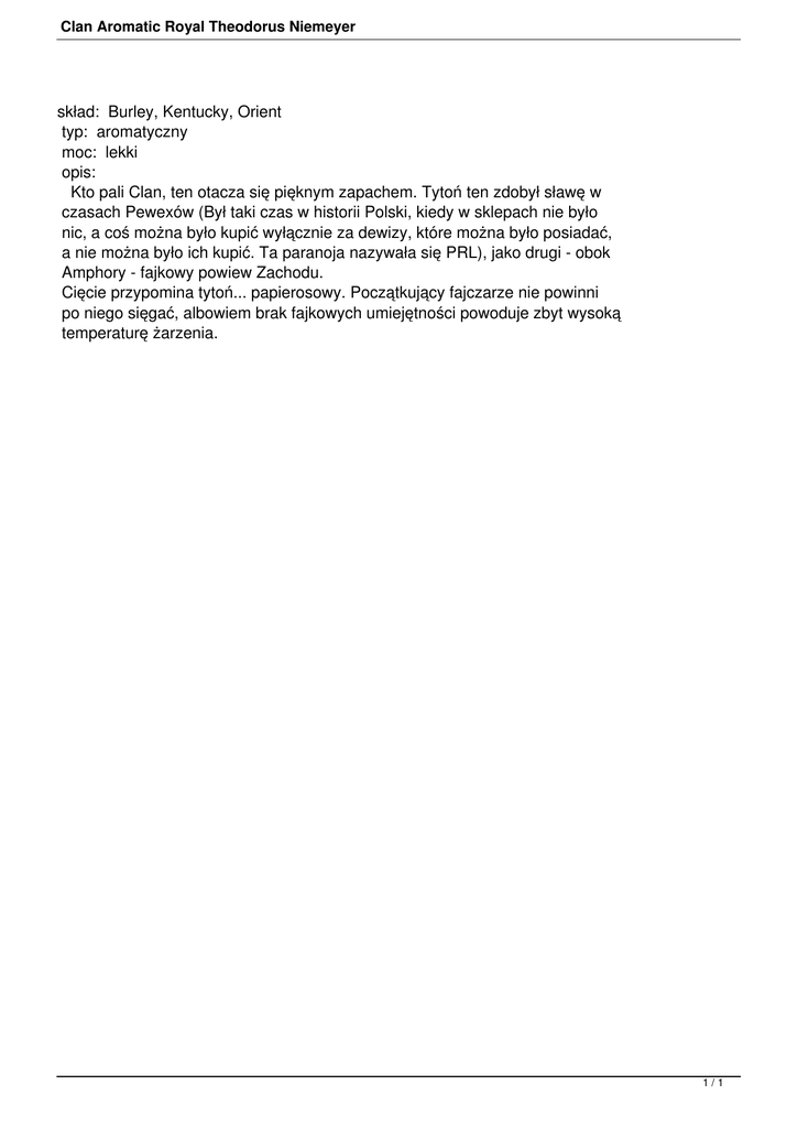 Clan Aromatic Royal Theodorus Niemeyer skład: Burley, Kentucky, Orient typ: aromatyczny moc: lekki opis: Kto pali Clan, ten otacza się pięknym zapachem. Tytoń ten zdobył sławę w czasach Pewexów (Był taki czas w historii Polski, kiedy w sklepach nie było nic, a coś można było kupić wyłącznie za dewizy, które można było posiadać, a nie można było ich kupić. Ta paranoja nazywała się PRL), jako drugi - obok Amphory - fajkowy powiew Zachodu. Cięcie przypomina tytoń... papierosowy. Początkujący fajczarze nie powinni po niego sięgać, albowiem brak fajkowych umiejętności powoduje zbyt wysoką temperaturę żarzenia. 1/1