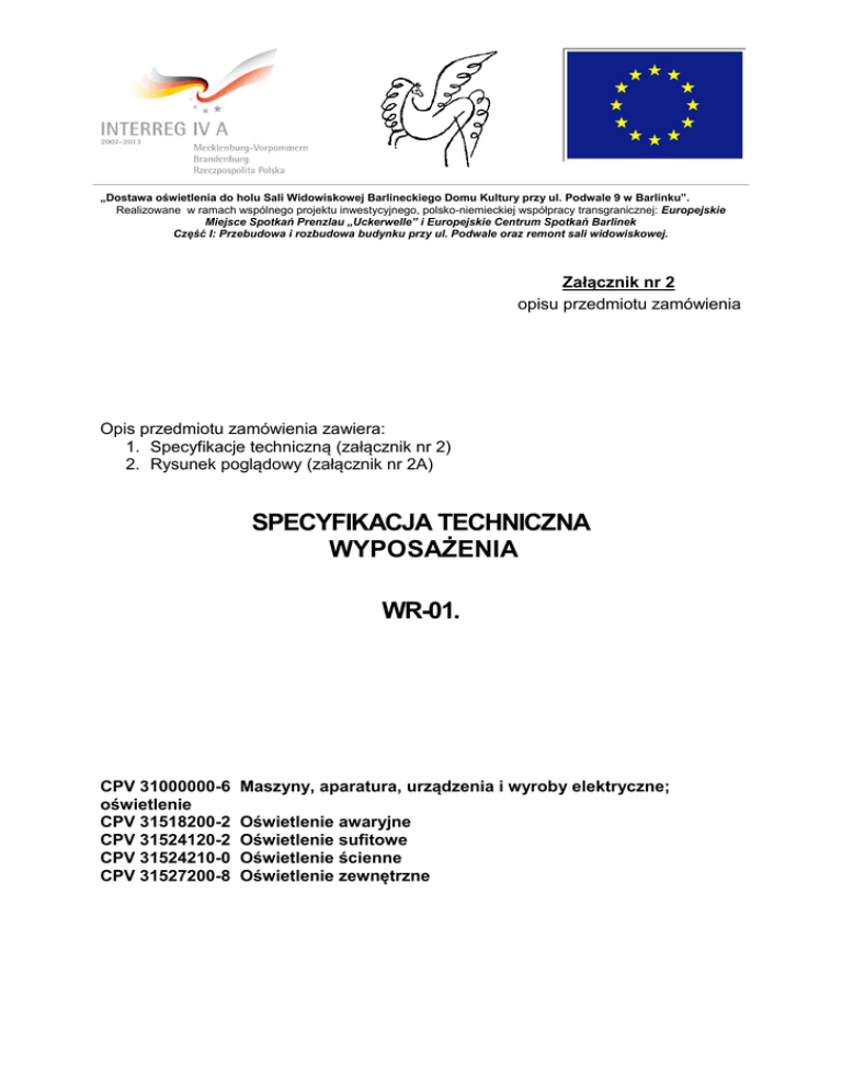 „Dostawa oświetlenia do holu Sali Widowiskowej Barlineckiego Domu Kultury przy ul. Podwale 9 w Barlinku”. Realizowane w ramach wspólnego projektu inwestycyjnego, polsko-niemieckiej współpracy transgranicznej: Europejskie Miejsce Spotkań Prenzlau „Uckerwelle” i Europejskie Centrum Spotkań Barlinek Część I: Przebudowa i rozbudowa budynku przy ul. Podwale oraz remont sali widowiskowej. Załącznik nr 2 opisu przedmiotu zamówienia Opis przedmiotu zamówienia zawiera: 1. Specyfikacje techniczną (załącznik nr 2) 2. Rysunek poglądowy (załącznik nr 2A) SPECYFIKACJA TECHNICZNA WYPOSAŻENIA WR-01. CPV 31000000-6 oświetlenie CPV 31518200-2 CPV 31524120-2 CPV 31524210-0 CPV 31527200-8 Maszyny, aparatura, urządzenia i wyroby elektryczne; Oświetlenie awaryjne Oświetlenie sufitowe Oświetlenie ścienne Oświetlenie zewnętrzne Specyfikacje Techniczne WR-01. Wyposażenie ruchome 1. WSTĘP 1.1. Przedmiot Specyfikacji Technicznej Przedmiotem niniejszej szczegółowej specyfikacji technicznej są wymagania dotyczące zakupu i dostawy opraw oświetleniowych dla zamówienia pn.: „Dostawa opraw oświetleniowych do holu Sali Widowiskowej Barlineckiego Domu Kultury przy ul. Podwale 9 w Barlinku”. Realizowane w ramach wspólnego projektu inwestycyjnego, polsko-niemieckiej współpracy transgranicznej: Europejskie Miejsce Spotkań Prenzlau „Uckerwelle” i Europejskie Centrum Spotkań Barlinek Część I: Przebudowa i rozbudowa budynku przy ul. Podwale oraz remont sali widowiskowej. 1.2. Zakres stosowania ST Specyfikacja techniczna jest stosowana jako dokument przetargowy i kontraktowy przy zlecaniu i realizacji robót wymienionych w pkt. 1.1. 1.3. Zakres robót objętych ST Roboty, których dotyczy specyfikacja, obejmują wszystkie czynności związane z zakupem, dostawą i montażem wyposażenia ruchomego obiektu. Zakres robót dotyczy wyposażenia niżej wymienionych zespołów pomieszczeń: 1.3.1. Hol Sali widowiskowej- wnętrze 1.3.2. Wejście do holu Sali widowiskowej- lampy zewnętrzne 1.4. Ogólne wymagania dotyczące robót Wykonawca robót jest odpowiedzialny za jakość dostarczonego wyposażenia oraz za zgodność dostawy z dokumentacją projektową, ST i poleceniami Inżyniera. 2. MATERIAŁY I URZĄDZENIA Wykonawca zakupi i dostarczy urządzenia w ilościach i o parametrach technicznych zgodnych z dokumentacja projektową, specyfikacjami technicznymi i załączonym zestawieniem wyposażenia ruchomego. 3. WYPOSAŻENIE . 3.1. Hol Sali widowiskowej. W pomieszczeniu holu Sali widowiskowej: Lampy firmy ES- SYSTEM lub równoważne typu „Vega Mix” 2x28 + 4x20W- 4 szt +akcesoria Lampa o wymiarach 50x170x2200 mm Lampy firmy ES- SYSTEM lub równoważne typu: „struktura S3000” 4x54W-2 szt „struktura S3000” 4x54W/ AW 2h-2 szt Lampy firmy ES- SYSTEM lub równoważne typu „system S3000” 12x54W + 14x max 100W- 1 szt wyposażone w 3 moduły awaryjne Lampy firmy ES- SYSTEM lub równoważne typu „Monitor 2”- 3 szt. oprawa nastropowa oświetlenia ewakuacyjnego Lampy firmy SPOTLINE lub równoważne typu „Wheel PC” lampa wisząca świetlówkowa kołowa + 3xES111- 6szt. Lampy firmy SPOTLINE lub równoważne typu „Open Grill Wall”- lampa ścienna- 2szt. „Dostawa opraw oświetleniowych do holu Sali Widowiskowej Barlineckiego Domu Kultury przy ul. Podwale 9 w Barlinku” 2 Specyfikacje Techniczne WR-01. Wyposażenie ruchome 3.2. Wejście do holu Sali widowiskowej- lampy zewnętrzne Lampy zewnętrzne: Lampy firmy SPOTLINE lub równoważne typu „Bulan” kolor metal piaskowany, moc żąrówki max 60 W- 3szt., stopień ochrony min. IP44 Uwaga: Wszystkie oprawy świetlne muszą być dostarczone wraz z niezbędnymi akcesoriami, źródłem światła (żarówki/świetlówki/halogeny itd.) oraz elementami zasilającymi. Lokalizacja poszczególnych lamp– załączony rysunek koncepcyjny. 4. PODSTAWA PŁATNOŚCI Zgodnie z postanowieniami Kontraktu należy wykonać zakres robót wymieniony w p. 1.3. niniejszej ST. Jednostkowa cena ryczałtowa elementu dostawy obejmuje: Zakup urządzeń wraz z niezbędnymi akcesoriami (łączniki, kable, baterie, itp.) Dostarczenie na budowę; Roboty zabezpieczające przed ewentualnym zniszczeniem dostarczonych elementów; Dostarczenie pełnej, wymaganej przepisami dokumentacji oraz atestów i certyfikatów; Przeszkolenie pracowników Zamawiającego w zakresie obsługi urządzeń Uporządkowanie placu budowy, wywiezienie odpadów, opakowań i innych elementów wraz z kosztami składowania lub utylizacji Uczestniczenie w odbiorze. 5. PRZEPISY ZWIĄZANE 1) WTWiO - Warunki Techniczne Wykonania i Odbioru Robót - ITB 2) Instrukcje montażowe producenta. 3) PN-EN 12464-1:2003 Technika świetlna.Oświetlenie miejsc pracy. Część 1: Miejsca pracy wewnątrz pomieszczeń 4) PN-90/E-01005 Technika Świetlna. Terminologia 5) PN-EN 1838:2002 (U) Oświetlenie awaryjne 6) PN-76/E-02032 Oświetlenie dróg publicznych 7) PN-84/E-02033 Oświetlenie wnętrz światłem elektrycznym 8) PN-84/E-02033/AZ2:2003 Oświetlenie wnętrz światłem elektrycznym Usunięto załącznik 7 normy. „Dostawa opraw oświetleniowych do holu Sali Widowiskowej Barlineckiego Domu Kultury przy ul. Podwale 9 w Barlinku” 3