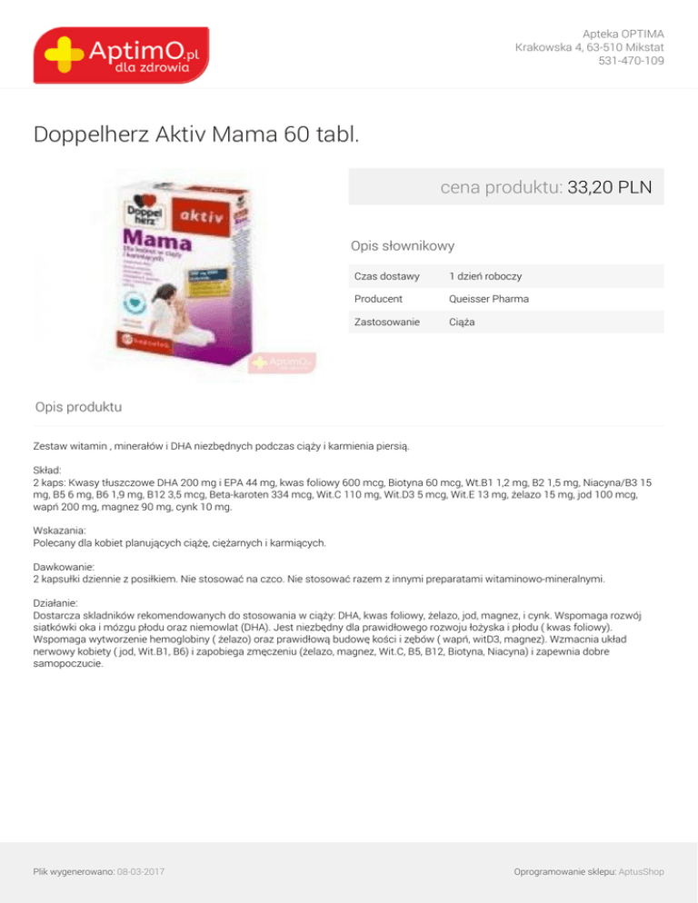 Apteka OPTIMA Krakowska 4, 63-510 Mikstat 531-470-109 Doppelherz Aktiv Mama 60 tabl. cena produktu: 33,20 PLN Opis słownikowy Czas dostawy 1 dzień roboczy Producent Queisser Pharma Zastosowanie Ciąża Opis produktu Zestaw witamin , minerałów i DHA niezbędnych podczas ciąży i karmienia piersią. Skład: 2 kaps: Kwasy tłuszczowe DHA 200 mg i EPA 44 mg, kwas foliowy 600 mcg, Biotyna 60 mcg, Wt.B1 1,2 mg, B2 1,5 mg, Niacyna/B3 15 mg, B5 6 mg, B6 1,9 mg, B12 3,5 mcg, Beta-karoten 334 mcg, Wit.C 110 mg, Wit.D3 5 mcg, Wit.E 13 mg, żelazo 15 mg, jod 100 mcg, wapń 200 mg, magnez 90 mg, cynk 10 mg. Wskazania: Polecany dla kobiet planujących ciążę, ciężarnych i karmiących. Dawkowanie: 2 kapsułki dziennie z posiłkiem. Nie stosować na czco. Nie stosować razem z innymi preparatami witaminowo-mineralnymi. Działanie: Dostarcza skladników rekomendowanych do stosowania w ciąży: DHA, kwas foliowy, żelazo, jod, magnez, i cynk. Wspomaga rozwój siatkówki oka i mózgu płodu oraz niemowlat (DHA). Jest niezbędny dla prawidłowego rozwoju łożyska i płodu ( kwas foliowy). Wspomaga wytworzenie hemoglobiny ( żelazo) oraz prawidłową budowę kości i zębów ( wapń, witD3, magnez). Wzmacnia układ nerwowy kobiety ( jod, Wit.B1, B6) i zapobiega zmęczeniu (żelazo, magnez, Wit.C, B5, B12, Biotyna, Niacyna) i zapewnia dobre samopoczucie. Plik wygenerowano: 08-03-2017 Powered by TCPDF (www.tcpdf.org) Oprogramowanie sklepu: AptusShop