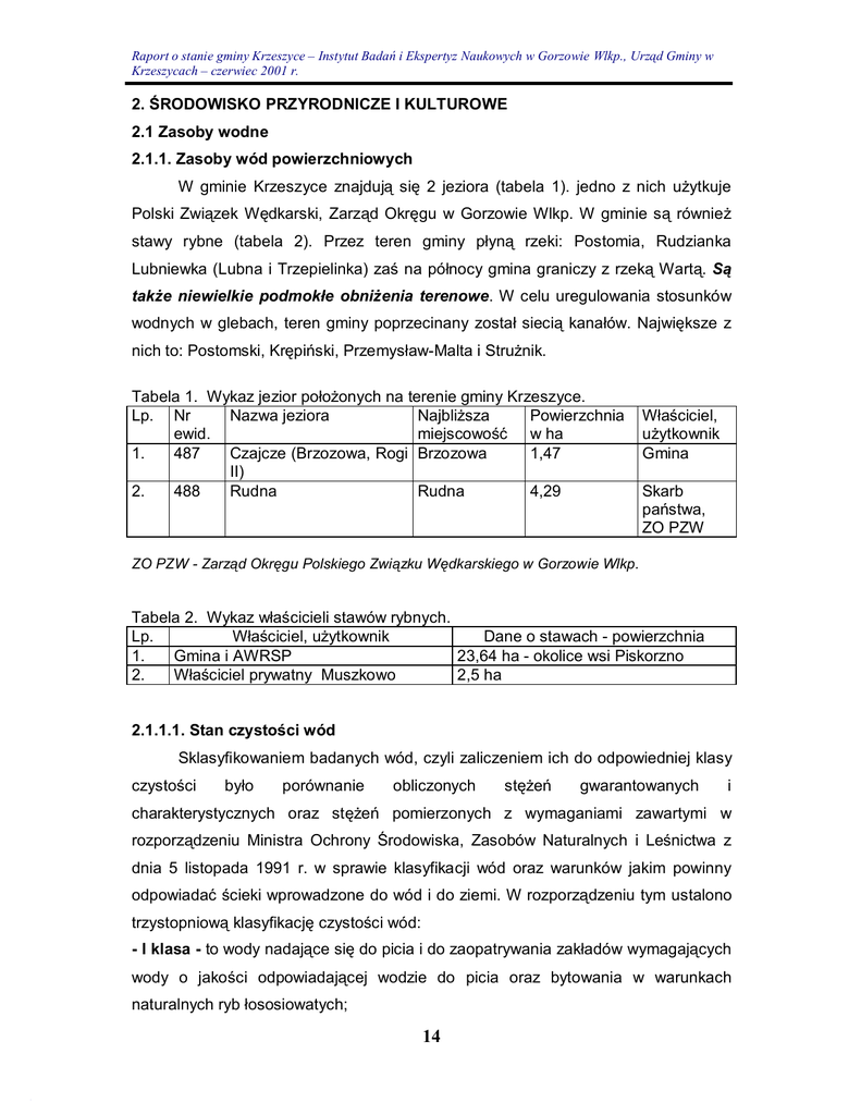 Raport o stanie gminy Krzeszyce – Instytut Badań i Ekspertyz Naukowych w Gorzowie Wlkp., Urząd Gminy w Krzeszycach – czerwiec 2001 r. 2. ŚRODOWISKO PRZYRODNICZE I KULTUROWE 2.1 Zasoby wodne 2.1.1. Zasoby wód powierzchniowych W gminie Krzeszyce znajdują się 2 jeziora (tabela 1). jedno z nich użytkuje Polski Związek Wędkarski, Zarząd Okręgu w Gorzowie Wlkp. W gminie są również stawy rybne (tabela 2). Przez teren gminy płyną rzeki: Postomia, Rudzianka Lubniewka (Lubna i Trzepielinka) zaś na północy gmina graniczy z rzeką Wartą. Są także niewielkie podmokłe obniżenia terenowe. W celu uregulowania stosunków wodnych w glebach, teren gminy poprzecinany został siecią kanałów. Największe z nich to: Postomski, Krępiński, Przemysław-Malta i Strużnik. Tabela 1. Wykaz jezior położonych na terenie gminy Krzeszyce. Lp. Nr Nazwa jeziora Najbliższa Powierzchnia ewid. miejscowość w ha 1. 487 Czajcze (Brzozowa, Rogi Brzozowa 1,47 II) 2. 488 Rudna Rudna 4,29 Właściciel, użytkownik Gmina Skarb państwa, ZO PZW ZO PZW - Zarząd Okręgu Polskiego Związku Wędkarskiego w Gorzowie Wlkp. Tabela 2. Wykaz właścicieli stawów rybnych. Lp. Właściciel, użytkownik Dane o stawach - powierzchnia 1. Gmina i AWRSP 23,64 ha - okolice wsi Piskorzno 2. Właściciel prywatny Muszkowo 2,5 ha 2.1.1.1. Stan czystości wód Sklasyfikowaniem badanych wód, czyli zaliczeniem ich do odpowiedniej klasy czystości było porównanie obliczonych stężeń gwarantowanych i charakterystycznych oraz stężeń pomierzonych z wymaganiami zawartymi w rozporządzeniu Ministra Ochrony Środowiska, Zasobów Naturalnych i Leśnictwa z dnia 5 listopada 1991 r. w sprawie klasyfikacji wód oraz warunków jakim powinny odpowiadać ścieki wprowadzone do wód i do ziemi. W rozporządzeniu tym ustalono trzystopniową klasyfikację czystości wód: - I klasa - to wody nadające się do picia i do zaopatrywania zakładów wymagających wody o jakości odpowiadającej wodzie do picia oraz bytowania w warunkach naturalnych ryb łososiowatych; 14 Raport o stanie gminy Krzeszyce – Instytut Badań i Ekspertyz Naukowych w Gorzowie Wlkp., Urząd Gminy w Krzeszycach – czerwiec 2001 r. - II klasa - to wody nadające się do bytowania w naturalnych warunkach innych ryb niż łososiowate, chowu i hodowli zwierząt gospodarskich, celów rekreacyjnych, urządzania zorganizowanych kąpielisk; - III klasa - to wody nadające się do zaopatrywania różnych zakładów i nawadniania terenów rolniczych; - NON - wody nie odpowiadające normom. 2.1.1.2. Stan czystości jezior - badania Jeziora położone w gminie Krzeszyce nie są objęte badaniami monitoringowymi i innymi, które w cyklach pięcioletnich przeprowadza Inspekcja Ochrony Środowiska WIOŚ w Zielonej Górze Delegatura w Gorzowie Wlkp. 2.1.1.3. Stan czystości rzek - badania Przez teren gminy Krzeszyce płyną rzeki: Postomia, Rudzianka, Lubna, Trzepielinka i Warta. Postomia jest rzeką IV rzędu i stanowi lewobrzeżny dopływ Kanału Postomskiego. Początek swój bierze w Jeziorze Postomsko położonym między Sulęcinem a Trzemesznem Lubuskim (gm. Sulęcin) i uchodzi do Kanału Postomskiego w gminie Krzeszyce. Jej długość wynosi 34,5 km, a powierzchnia zlewni całkowitej obejmuje 202,7 km2. Postomia jest badana przez WIOŚ w Zielonej Górze, Delegatura w Gorzowie Wlkp. w programie monitoringu regionalnego w sieci krajowej. Badania stanu czystości wód Postomii wykonywane są w 1 punkcie pomiarowo-kontrolnym Postomskiego. zlokalizowanym 0,8 km przed ujściem do Kanału Brak danych dotyczących czystości Postomii sprzed 1993 r. Badania przeprowadzone w 1997 roku wykazały, że wody Postomii nie odpowiadały normom ze względu na wysoką zawartość zawiesin ogólnych, azotu azotynowego, fosforu ogólnego oraz zły stan sanitarny. W ciągu pięciu lat (od poprzednich badań w 1993 roku) jakość wód rzeki nie uległa zmianom. Także w 1999 r. wody nie odpowiadały normom ( tabela 3). Kanał Postomski - jest to ciek III rzędu. Początek bierze z jeziora Glinik, a od źródła do Postomii nosi nazwę Kanał Roszkowicki. Długość Kanału Postomskiego wynosi 62,6 km, a powierzchnia zlewni całkowitej 434,8 km2. Kanał zbiera wody z lewostronnej części doliny Warty. Badania czystości wód prowadzono w 2000 r. w dwóch punktach pomiarowo-kontrolnych: w Krzeszycach (powyżej Postomii) - 32 km 15 Raport o stanie gminy Krzeszyce – Instytut Badań i Ekspertyz Naukowych w Gorzowie Wlkp., Urząd Gminy w Krzeszycach – czerwiec 2001 r. rzeki i w Przyborowie - 10,9 km, wody Kanału nie odpowiadały normom. Stwierdzono wysokie stężenia chlorofilu „a”. Również w pomiarowo-kontrolnym w Przyborowie wody nie 1997 r. w punkcie odpowiadały normom. Zdecydowała o tym bardzo mała zawartość tlenu rozpuszczonego, wysoka zawartość chlorofilu „a” oraz zły stan sanitarny. Do klasy III obniżone były zawartość fosforu ogólnego i azotu azotynowego. Niska jakość wody spowodowana jest zrzutem zanieczyszczeń z terenu gminy Słońsk i poprzez zanieczyszczone dopływy Postomia i Ośnianka (tabela 3). Tabela 3. Ocena jakości wód Postomii w latach 1997 - 1999 Nazwa rzeki Lokalizacja ppk km Klasyfikacja Klasyfikacja Klasyfikacja wg. cech wg. cech stanu fizycznobiologicznych sanitarnego chemicznych 1997 19 19 98 99 Postomia przed ujściem 0,8 NON - NON do Kanału Postomskiego Kanał Przed ujściem 10,9 NON - NON Postomski do baseny słońskiego w Przyborowie 19 97 19 98 19 99 II - II - - - wg. Klasyfikacja ogólna 1997 19 98 1999 1997 19 1999 98 NON NON NON - NON - NON - - - Rzeki Rudzianka, Lubna nie są objęte badaniami. Rzeka Warta jest rzeką II rzędu. Początek swój bierze w Kromołowie na Wyżynie Krakowsko-Częstochowskiej i uchodzi do Odry. Jej długość całkowita wynosi 808,2 km, a powierzchnia zlewni całkowitej obejmuje 54.310,2 km2. Na terenie woj. lubuskiego jest zasilana przez wody rzek: Obry, Noteci, Kłodawki, Kanału Postomskiego 