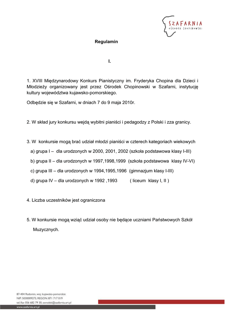 Regulamin I. 1. XVIII Międzynarodowy Konkurs Pianistyczny im. Fryderyka Chopina dla Dzieci i MłodzieŜy organizowany jest przez Ośrodek Chopinowski w Szafarni, instytucję kultury województwa kujawsko-pomorskiego. Odbędzie się w Szafarni, w dniach 7 do 9 maja 2010r. 2. W skład jury konkursu wejdą wybitni pianiści i pedagodzy z Polski i zza granicy. 3. W konkursie mogą brać udział młodzi pianiści w czterech kategoriach wiekowych a) grupa I – dla urodzonych w 2000, 2001, 2002 (szkoła podstawowa klasy I-III) b) grupa II – dla urodzonych w 1997,1998,1999 (szkoła podstawowa klasy IV-VI) c) grupa III – dla urodzonych w 1994,1995,1996 (gimnazjum klasy I-III) d) grupa IV – dla urodzonych w 1992 ,1993 ( liceum klasy I, II ) 4. Liczba uczestników jest ograniczona 5. W konkursie mogą wziąć udział osoby nie będące uczniami Państwowych Szkół Muzycznych. II. 1. Zgłoszenia do udziału w konkursie w języku polskim, angielskim lub hiszpańskim, na zamieszczonym w załączniku egzemplarzu naleŜy przesyłać do dnia 30 marca 2010 roku na adres: Ośrodek Chopinowski w Szafarni 87-404 Radomin województwo kujawsko-pomorskie „Konkurs Pianistyczny” załączając: • • • • • • • krótką notatkę biograficzną ( w języku polskim, angielskim lub hiszpańskim) fotokopię paszportu lub aktu urodzenia ( przetłumaczoną na język polski lub angielski) dwa aktualne zdjęcia w formacie 9 x 13 cm potwierdzenie zgłoszenia przez szkołę z krótką opinią o osiągnięciach kandydata listę utworów przygotowanych na konkurs nazwisko nauczyciela prowadzącego, przygotowującego do konkursu informację, w której grupie wystąpi solista 2. Wpisowe od uczestników polskich w PLN, zagranicznych w Euro wynosi: kategoria I i II - 150,00 zł. lub 40 Euro kategoria III i IV - 200,00 zł. lub 60 Euro Wpłaty naleŜy przesłać na konto PKO BP oddział Golub-Dobrzyń 04 1020 5024 0000 1002 0042 0828 z podaniem przeznaczenia wpłaty i nazwiska kandydata 3. Koszty przelewu wpisowego, pokrywają uczestnicy bądź instytucje delegujące. 4. O przyjęciu zgłoszenia decyduje data stempla pocztowego. 5. Wszelkie zgłoszenia nadesłane po wyznaczonym terminie tj. 30 marca 2010 r. nie zostaną przyjęte. III. 1. Kandydaci otrzymują potwierdzenie o przyjęciu do udziału w konkursie do dnia 10 kwietnia 2010 roku z dołączoną informacją o miejscu zakwaterowania tj. decyduje kolejność zgłoszeń. 2. Uczestnicy, których zgłoszenia zostaną odrzucone, otrzymają zwrot wpisowego po potrąceniu kosztów przelewu. 3. Wpisowe nie podlega zwrotowi, jeŜeli uczestnik nie zgłosi się do przesłuchania konkursowego lub wycofa zgłoszenie po 10 kwietnia 2010 roku. 4. Uczestnikom Konkursu zapewnia się próbę fortepianu w Sali Koncertowej Ośrodka Chopinowskiego w Szafarni. Datę i godzinę próby, występu oraz harmonogram ćwiczeń uczestnik otrzyma wraz z potwierdzeniem zakwalifikowania do konkursu. 5. Koszty związane z udziałem w konkursie tj. podróŜ, wyŜywienie pokrywają uczestnicy, natomiast organizator zapewnia uczestnikowi noclegi oraz bezpłatny dojazd do miejsca przesłuchań wszystkim osobom zakwaterowanym poza Szafarnią. IV. Obowiązujący Program Konkursu dla poszczególnych grup: I. grupa wiekowa do lat 10 1. Jan Sebastian Bach jeden utwór ze zbiorów „Łatwe utwory” lub „ Drobne utwory” 2. Fryderyk Chopin – jeden polonez z podanych: Polonez g-moll z 1817r., Polonez B-dur z 1817r.,Polonez As-dur z 1821r. 3. Dowolny utwór o charakterze wirtuozowskim Czas wykonania utworów nie powinien przekroczyć 12 min. II grupa wiekowa do 13 lat 1. Jan Sebastian Bach : Inwencje dwugłosowe, trzygłosowe do wyboru lub inny utwór tego kompozytora (jeden). 2. Fryderyk Chopin jeden z utworów zamieszczonych w zbiorze „Drobne utwory”(PWN) 3.Dowolny utwór o charakterze wirtuozowskim. Czas wykonania do 15 minut III grupa wiekowa do 16 lat 1. Józef Haydn, Wolfgang Amadeusz Mozart, Ludwig van Beethoven sonatowe do wyboru. Allegro 2. Fryderyk Chopin: dowolnie wybrany Walc spośród następujących: As-dur op.69 nr1, Ges-dur op.70 nr1, f-moll op.70 nr 2, Des-dur op.70 nr 3, e-moll op. pośm. (w wydaniu Paderewskiego) nr 14, Es-dur op. pośm. W wydaniu Paderewskiego nr 17, oraz 2 Walce Es-dur i a-moll (PWM 2 zapomniane utwory). 3.Fryderyk Chopin wybrany Mazurek spośród wymienionych: cis-moll op.6 nr2, Bdur op.7 nr 1, a-moll op.7 nr 2, f-moll op.63 nr 2, g-moll op.67 nr 2, a-moll op.67 nr4, F-dur op.68 nr 3, f-moll op.68 nr4, oraz 2 mazurki bez opusu B-dur i As-dur ( w wydaniu Paderweskiego figurują jako nr52 i 58) 4. Wybrany utwór o Charakterze wirtuozowskim Czas wykonania utworów 25 min. IV grupa wiekowa do lat 18 1. J.Haydn, W.A.Mozart, L.van Beethoven do wyboru Al.legro sonatowe 2. Fryderyk Chopin wybrany Nokturn spośród wymienionych: b-moll op9, F-dur op.15, Fis-dur op.15, As-dur op. 32, g-moll op.37, cis-moll op.27, Des-dur op. 27 3.Fryderyk Chopin – Mazurek a-moll op.17 nr 4 (utwór obowiązkowy) 4.Dowolny utwór o charakterze wirtuozowskim w tym Etiuda, F. Chopina 5. Karol Szymanowski jedno Preludium op.1 oprócz 1,3,6 lub jedno z Impromptu F. Chopina do wyboru. Z okazji Roku Chopinowskiego specjalna nagroda dla uczestnika, który wykona część I lub III Koncertu Fryderyka Chopina wraz z kwintetem smyczkowym (kwintet smyczkowy zapewnia Organizator). Jest to wymienna część programu za utwory dowolne. Nagrody 1. Nagrody pienięŜne: I nagroda 1000 € ∗ II nagroda 500 € ∗ III nagroda 300 € ∗ ∗Dotyczy II III i IV kategorii wiekowej Nagrody w grupie wiekowej I I nagroda 600 € II nagroda 400 € III nagroda 200€ 2. Koncert z Orkiestrą Konserwatorium Muzycznego w Pampelunie w Polsce ( Toruń lub Szafarnia) i w Hiszpanii (Pampeluna) – koszt przejazdu i pobytu zapewnia Organizator – wyboru dokonuje jury. 3. 4 dniowy kurs mistrzowski w Ośrodku Chopinowskim w Szafarni ( czerwiec 2010). V. 1. Jury powołuje organizator Konkursu: Ośrodek Cho