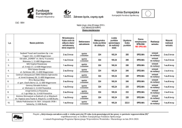 CAZ - 5804 Nabór drugi z dnia 26 lutego 2016 r. CAZ-5804/02/2016/RPO Ocena merytoryczna L.p. 1. 2. 3. 4. 5. 6. 7. 8. 9. 10. Nazwa podmiotu Sealand Travel and Locations Sp. z oo. Trygort 132, 11-600 Węgorzewo Ośrodek „DOREN” im. Berty Trusiewicz Różewiec 1, 11-600 Węgorzewo MCZ Szpital Powiatowy ul. 3 maja 17, 11-600 Węgorzewo PHU Sylwia Girwidz ul. Zamkowa 10C, 11-600 Węgorzewo Centrum Ubezpieczeń EMIS Elżbieta Sędrowska ul. Armii Krajowej 2B, 11-600 Węgorzewo PH-U Roman Biłas ul. gen. Józefa Bema 13, 11-600 Węgorzewo Gminny Ośrodek Kultury ul. Wolności 4, 11-610 Pozezdrze Urząd Gminy w Pozezdrzu ul. 1-go Maja 1a, 11-610 Pozezdrze Gminne Gimnazjum w Budrach z/s w Więckach im. Papieża Jana Pawła II, Więcki 8, 11-606 Budry Szkoła Podstawowa im. Boh. Listopada 1918 r. Sobiechy, 11-606 Budry Wnioskowana liczba osób do odbycia stażu/ wnioskowany okres wsparcia Deklarowane zatrudnienie Maksymalna liczba punktów do zdobycia Liczba punktów uprawniająca do realizacji stażu Uzyskana liczba punktów Ocena merytoryczna SPEŁNIA/ NIE SPEŁNIA Realizacja wniosku Warunki realizacji wniosku 2 os./3 m-ce zgodnie z wnioskiem 324 165,24 285 SPEŁNIA wniosek do realizacji 2 os./3 m-ce 1 os./3 m-ce zgodnie z wnioskiem 324 165,24 269 SPEŁNIA wniosek do realizacji 1 os./3 m-ce 1 os./6 m-cy zgodnie z wnioskiem 324 165,24 250 SPEŁNIA wniosek do realizacji 1 os./6 m-cy 2 os./6 m-cy zgodnie z wnioskiem 324 165,24 249 SPEŁNIA wniosek do realizacji 2 os./6 m-cy 1 os./6 m-cy zgodnie z wnioskiem 324 165,24 249 SPEŁNIA wniosek do realizacji 1 os./6 m-cy 2 os./6 m-cy zgodnie z wnioskiem 324 165,24 246 SPEŁNIA wniosek do realizacji 1 os./6 m-cy 1 os./6 m-cy zgodnie z wnioskiem 324 165,24 235 SPEŁNIA wniosek do realizacji 1 os./6 m-cy 2 os./6 m-cy zgodnie z wnioskiem 324 165,24 232 SPEŁNIA wniosek do realizacji 2 os./6 m-cy 1 os./6 m-cy zgodnie z wnioskiem 324 165,24 228 SPEŁNIA wniosek do realizacji 1 os./6 m-cy 1 os./6 m-cy zgodnie z wnioskiem 324 165,24 222,5 SPEŁNIA wniosek do realizacji 1 os./6 m-cy Projekt „Aktywizacja zawodowa osób w wieku powyżej 29 roku życia pozostających bez pracy w powiecie węgorzewskim (II)” współfinansowany ze środków Europejskiego Funduszu Społecznego w ramach Regionalnego Programu Operacyjnego Województwa Warmińsko- Mazurskiego na lata 2014-2020. 11. 12. 13. 14. 15. 16. 17. 18. 19. 20. „SPOŁEM” PSS ul. Zamkowa 12, 11-600 Węgorzewo Sklep Spożywczo-Przemysłowy Marek Siemionko ul. Pocztowa 1A, 11-610 Pozezdrze Zakł. Gastronomiczno-Hotelarski Jerzy Dziokan ul. M. Wańkowicza 3, 11-600 Węgorzewo AGRO-TURYSTYKA Kazimierz Wincławski Kal 19B, 11-600 Węgorzewo „VEGA” Teresa Kuncer-Zawierucha ul. Ogrodowa 48/2, 11-600 Węgorzewo Parafia Rzymskokatolicka pw. św. Józefa Węgielsztyn 38, 11-600 Węgorzewo Sklep Spoż.-Przem. „PETRA” A. Piszczatowski ul. Węgorzewska 9, Kol. Rybacka, 11-600 W-wo ŚWIAT DZIECKA Zbigniew Niedźwiecki ul. Zamkowa 10F, 11-600 Węgorzewo WAG-MET Grzegorz Oszako Janówko 1, 11-600 Węgorzewo Gospodarstwo Rolne Adam Olszewski Krzywińskie 3, 11-610 Pozezdrze 4 os./6 m-cy zgodnie z wnioskiem 324 165,24 220,5 SPEŁNIA wniosek do realizacji 4 os./6 m-cy 1 os./6 m-cy zgodnie z wnioskiem 324 165,24 219 SPEŁNIA wniosek do realizacji 1 os./6 m-cy 4 os./6 m-cy zgodnie z wnioskiem 324 165,24 218 SPEŁNIA wniosek do realizacji 4 os./6 m-cy 1 os./6 m-cy zgodnie z wnioskiem 324 165,24 201 SPEŁNIA wniosek do realizacji 1 os./6 m-cy 1 os./6 m-cy zgodnie z wnioskiem 324 165,24 192 SPEŁNIA wniosek do realizacji 1 os./6 m-cy 1 os./6 m-cy zgodnie z wnioskiem 324 165,24 188,5 SPEŁNIA wniosek do realizacji 1 os./6 m-cy 1 os./6 m-cy zgodnie z wnioskiem 324 165,24 188 SPEŁNIA wniosek do realizacji 1 os./6 m-cy 1 os./6 m-cy zgodnie z wnioskiem 324 165,24 175 SPEŁNIA wniosek do realizacji 1 os./6 m-cy 1 os./6 m-cy zgodnie z wnioskiem 324 165,24 174 SPEŁNIA wniosek do realizacji 1 os./6 m-cy 1 os./6 m-cy zgodnie z wnioskiem 324 165,24 173 SPEŁNIA wniosek do realizacji 1 os./6 m-cy Węgorzewo, dnia 21.03.2016 r. Zatwierdzam : DYREKTOR POWIATOWEGO URZĘDU PRACY W WĘGORZEWIE LESZEK BALON Osoby do kontaktu: Agnieszka Szałko – Kierownik Centrum Aktywizacji Zawodowej - tel. 87 429 69 10 Beata Dmochowska - Balon – Doradca Klienta - tel. 87 429 69 13 Projekt „Aktywizacja zawodowa osób w wieku powyżej 29 roku życia pozostających bez pracy w powiecie węgorzewskim (II)” współfinansowany ze środków Europejskiego Funduszu Społecznego w ramach Regionalnego Programu Operacyjnego Województwa Warmińsko- Mazurskiego na lata 2014-2020.