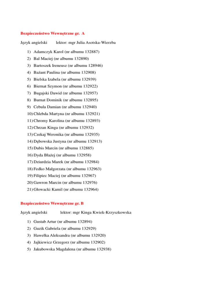 Bezpieczeństwo Wewnętrzne gr. A Język angielski lektor: mgr Julia Asotska-Wierzba 1) Adamczyk Karol (nr albumu 132887) 2) Bal Maciej (nr albumu 132890) 3) Bartoszek Ireneusz (nr albumu 128946) 4) Bażant Paulina (nr albumu 132908) 5) Bielska Izabela (nr albumu 132939) 6) Biernat Szymon (nr albumu 132922) 7) Bugajski Dawid (nr albumu 132957) 8) Burnat Dominik (nr albumu 132895) 9) Cebula Damian (nr albumu 132940) 10) Chlebda Martyna (nr albumu 132921) 11) Chromy Karolina (nr albumu 132893) 12) Chrzan Kinga (nr albumu 132932) 13) Czekaj Weronika (nr albumu 132935) 14) Dębowska Justyna (nr albumu 132913) 15) Dubis Marcin (nr albumu 132885) 16) Dyda Błażej (nr albumu 132958) 17) Dziurdzia Marek (nr albumu 132984) 18) Fedko Małgorzata (nr albumu 132963) 19) Filipiec Maciej (nr albumu 132967) 20) Gawron Marcin (nr albumu 132976) 21) Głowacki Kamil (nr albumu 132964) Bezpieczeństwo Wewnętrzne gr. B Język angielski lektor: mgr Kinga Kwiek-Krzyszkowska 1) Gustab Artur (nr albumu 132894) 2) Guzik Gabriela (nr albumu 132929) 3) Hawełka Aleksandra (nr albumu 132920) 4) Jajkiewicz Grzegorz (nr albumu 132902) 5) Jakubowska Magdalena (nr albumu 132938) 6) Janecki Daniel (nr albumu 132978) 7) Jasielska Patrycja (nr albumu 132983) 8) Klęczar Katarzyna (nr albumu 132912) 9) Klima Paulina (nr albumu 132904) 10) Knapik Adrian (nr albumu 132982) 11) Koc Justyna (nr albumu 132941) 12) Kocik Kamil (nr albumu 132945) 13) Kohut Kamil (nr albumu 132974) 14) Korczak Katarzyna (nr albumu 132954) 15) Koszyk Barbara (nr albumu 132980) 16) Kowacka Katarzyna (nr albumu 132973) 17) Kuc Aleksandra (nr albumu 132934) 18) Kucharczyk Mateusz (nr albumu 132986) 19) Kurek Weronika (nr albumu 132910) Bezpieczeństwo Wewnętrzne gr. C Język angielski lektor: mgr Grzegorz Miernik 1) Lechowicz Artur (nr albumu 132943) 2) Lewińska Monika (nr albumu 132962) 3) Lewkowicz Dominika (nr albumu 132953) 4) Liwak Diana (nr albumu 132897) 5) Lorczak Magdalena (nr albumu 132933) 6) Łapa Alicja (nr albumu 132981) 7) Łysek Marta (nr albumu 132916) 8) Maciaś Anna (nr albumu 132898) 9) Majder Dominika (nr albumu 132952) 10) Marciniak Justyna (nr albumu 132931) 11) Mazela Maciej (nr albumu 132970) 12) Mądry Klaudia (nr albumu 132906) 13) Michno Miłosz (nr albumu 132965) 14) Mikołajek Patryk (nr albumu 132977) 15) Mikos Arkadiusz (nr albumu 132901) 16) Milczanowski Maciej (nr albumu 132959) 17) Mucha Karolina (nr albumu 132915) 18) Obcowski Adrian (nr albumu 132937) 19) Obcowski Dawid (nr albumu 132936) 20) Orzeł Krzysztof (nr albumu 132942) 21) Ozarko Yuliia (nr albumu 132889) Bezpieczeństwo Wewnętrzne gr. D Język angielski Lektor: mgr Małgorzata Trybus 1) Ozga Michał (nr albumu 132956) 2) Paradysz Anna (nr albumu 132968) 3) Pociecha Marcin (nr albumu 132946) 4) Preisner Amanda (nr albumu 132923) 5) Raczyńska Magda (nr albumu 132951) 6) Rajczyk Filip (nr albumu 132888) 7) Rak Natalia (nr albumu 132876) 8) Romanek Michał (nr albumu 132884) 9) Siwulska Weronika (nr albumu 132926) 10) Skórka Krzysztof (nr albumu 132899) 11) Sowiżdżał Klaudia (nr albumu 132907) 12) Stachowicz Patrycja (nr albumu 132891) 13) Sułkowska Justyna (nr albumu 132924) 14) Surma Aleksandra (nr albumu 132960) 15) Szeląg Aleksandra (nr albumu 132905) 16) Szepielak Małgorzata (nr albumu 132975) 17) Szewc Kinga (nr albumu 132961) 18) Szot Monika (nr albumu 128617) 19) Szymańska Olga (nr albumu 132930) Bezpieczeństwo Wewnętrzne gr. E Język angielski lektor: mgr Ewa Zarzycka-Piskorz 1) Kusy Aleksandra (nr albumu 132950) 2) Goraj Jagoda (nr albumu 132909) 3) Światłoń Sabina (nr albumu 132892) 4) Tokarczyk Maria (nr albumu 132875) 5) Tokarski Łukasz (nr albumu 132918) 6) Walczak Damian (nr albumu 132903) 7) Wąsik Sylwia (nr albumu 132878) 8) Wiktorska Wiktoria (nr albumu 132883) 9) Winiarska Dominika (nr albumu 132917) 10) Wiśniewska Aleksandra (nr albumu 132928) 11) Woch Filip (nr albumu 132882) 12) Wójtowicz Aleksandra (nr albumu 132919) 13) Wołowiec Dominika (nr albumu 132880) 14) Wolska Aleksandra (nr albumu 132896) 15) Wyporska Natalia (nr albumu 132879) 16) Zawilińska Agnieszka (nr albumu 132971) 17) Zawora Patrycja (nr albumu 135497) 18) Zielińska Karolina (nr albumu 128009)