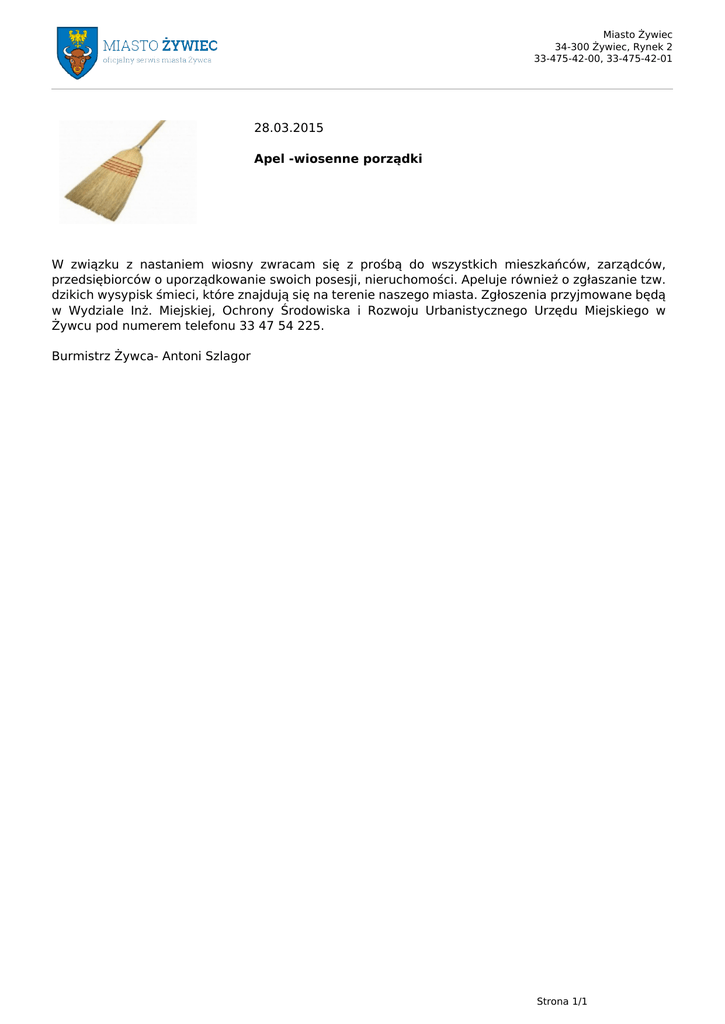 Miasto Żywiec 34-300 Żywiec, Rynek 2 33-475-42-00, 33-475-42-01 28.03.2015 Apel -wiosenne porządki W związku z nastaniem wiosny zwracam się z prośbą do wszystkich mieszkańców, zarządców, przedsiębiorców o uporządkowanie swoich posesji, nieruchomości. Apeluje również o zgłaszanie tzw. dzikich wysypisk śmieci, które znajdują się na terenie naszego miasta. Zgłoszenia przyjmowane będą w Wydziale Inż. Miejskiej, Ochrony Środowiska i Rozwoju Urbanistycznego Urzędu Miejskiego w Żywcu pod numerem telefonu 33 47 54 225. Burmistrz Żywca- Antoni Szlagor Strona 1/1 Powered by TCPDF (www.tcpdf.org)
