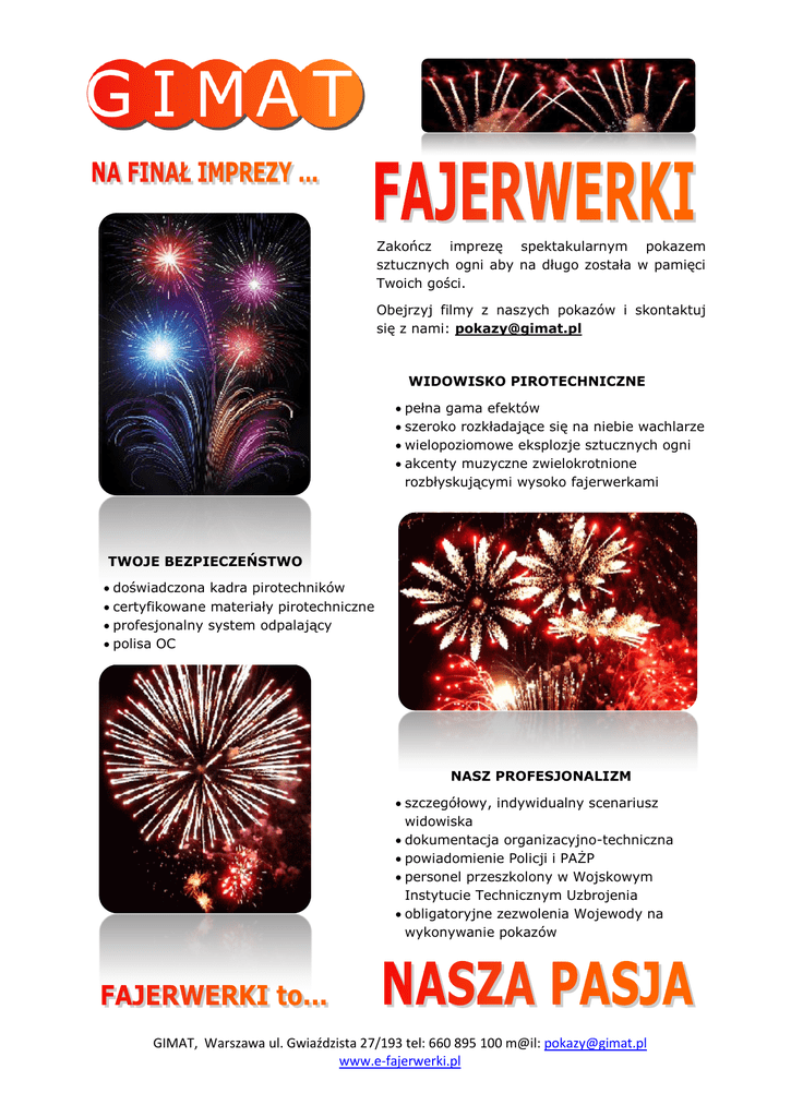 Zakończ imprezę spektakularnym pokazem sztucznych ogni aby na długo została w pamięci Twoich gości. Obejrzyj filmy z naszych pokazów i skontaktuj się z nami: [email protected] WIDOWISKO PIROTECHNICZNE pełna gama efektów szeroko rozkładające się na niebie wachlarze wielopoziomowe eksplozje sztucznych ogni akcenty muzyczne zwielokrotnione rozbłyskującymi wysoko fajerwerkami TWOJE BEZPIECZEŃSTWO doświadczona kadra pirotechników certyfikowane materiały pirotechniczne profesjonalny system odpalający polisa OC NASZ PROFESJONALIZM szczegółowy, indywidualny scenariusz widowiska dokumentacja organizacyjno-techniczna powiadomienie Policji i PAŻP personel przeszkolony w Wojskowym Instytucie Technicznym Uzbrojenia obligatoryjne zezwolenia Wojewody na wykonywanie pokazów GIMAT, Warszawa ul. Gwiaździsta 27/193 tel: 660 895 100 m@il: [email protected] www.e-fajerwerki.pl Czas pokazu: Cena: Podkład muzyczny: Charakterystyka pokazu pirotechnicznego: 4-6 minut 2000 - 3500zł Wybrany utwór muzyczny W pokazie stosujemy: - elementy pirotechniki niskiej takie jak wulkany, komety, wielobarwne bukiety iskier - wielostrzałowe wyrzutnie pirotechniczne o kalibrze do 30 mm i zmiennym natężeniu efektów - wyrzutnie kątowe i rzymskie ognie rozkładające się na niebie szerokim wachlarzem efektów. Uzupełnieniem są moździerze pirotechniczne o kalibrach od 50 do 100mm akcentujące punkty kulminacyjne oraz finał pokazu. Główna część pokazu rozgrywa się na poziomie 30-60 metrów natomiast punkty kulminacyjne i część finałowa osiąga wysokość około 100 metrów nad ziemią. Obsługa techniczna: - dokonujemy wizji lokalnej terenu pokazu, - przygotowujemy scenariusz pokazu, - opracowujemy dokumentację organizacyjno-techniczną, - o pokazie informujemy Policję i Polską Agencję Żeglugi Powietrznej, - w dniu pokazu transportujemy sprzęt oraz materiały pirotechniczne, - zabezpieczamy terenu pokazu, - realizujemy pokaz przy użycie profesjonalnego systemu odpalającego, gwarantującego idealną synchronizację z muzyką, - prace przy pokazie prowadzi i nadzoruje wykwalifikowany pirotechnik, - po zakończeniu pokazu dokonujemy inspekcji terenu i sprzątamy zużyte materiały pirotechniczne. Oferta obowiązuje do 31.10.2013 GIMAT, Warszawa ul. Gwiaździsta 27/193 tel: 660 895 100 m@il: [email protected] www.e-fajerwerki.pl Czas pokazu: Cena: Podkład muzyczny: Charakterystyka pokazu pirotechnicznego: 5-10 minut 4000-7000zł Synchronizacja z wybrany utworem muzycznym W pokazie stosujemy: - efekty synchroniczne w postaci komet „Single shots”, efekty strzelane salwami w kształcie wachlarza „One row” oraz wielobarwne bukiety iskier tzw. „Miny”, które podkreślają akcenty muzyczne, - wielostrzałowe wyrzutnie pirotechniczne o zmiennym natężeniu efektów o kalibrach od 30 do 50mm, - wyrzutnie kątowe i profesjonalne rzymskie ognie eksplodujące na niebie szerokim wachlarzem efektów, - moździerze pirotechniczne o kalibrach 75 do 125 mm potęgujące punkty kulminacyjne utworu muzycznego, Pokaz może być odpalany z dwóch miejsc jednocześnie aby uzyskać szeroki plan ekspozycji efektów pirotechnicznych pokrywających niebo przed publicznością. Tło pokazu i jego dolne partie widoczne są na wysokości 30 – 60 metrów. Część główną pokazu stanowią moździerze pirotechniczne o kalibrach od 75 do 125mm, które akcentują punkty kulminacyjne oraz finał pokazu osiągający wysokość 150 metrów ponad ziemią. Obsługa techniczna: - dokonujemy wizji lokalnej terenu pokazu, - przygotowujemy scenariusz pokazu, - opracowujemy dokumentację organizacyjno-techniczną, - o pokazie informujemy Policję i Polską Agencję Żeglugi Powietrznej, - w dniu pokazu transportujemy sprzęt oraz materiały pirotechniczne, - zabezpieczamy terenu pokazu, - realizujemy pokaz przy użycie profesjonalnego systemu odpalającego, gwarantującego idealną synchronizację z muzyką, - prace przy pokazie prowadzi i nadzoruje wykwalifikowany pirotechnik, - po zakończeniu pokazu dokonujemy inspekcji terenu i sprzątamy zużyte materiały pirotechniczne. Oferta obowiązuje do 31.10.2013 GIMAT, Warszawa ul. Gwiaździsta 27/193 tel: 660 895 100 m@il: [email protected] www.e-fajerwerki.pl Czas pokazu: Cena: Podkład muzyczny: Charakterystyka pokazu pirotechnicznego: Obsługa techniczna: od 8 minut od 7000zł Pełna synchronizacja z wybrany utworem muzycznym W pokazie stosujemy: - efekty synchroniczne w postaci komet „Single shots” krzyżujące się na niebie pod różnymi kątami, - efekty strzelane salwami w kształcie wachlarza „One row” np. złote ściany ognia, - tzw. „Miny”, wyrzucające w niebo wielobarwne bukiety iskier - wielostrzałowe wyrzutnie pirotechniczne o zmiennym natężeniu efektów o kalibrach od 30 do 75mm, - wyrzutnie kątowe i profesjonalne rzymskie ognie eksplodujące na niebie szerokim wachlarzem efektów, - moździerze pirotechniczne o kalibrach 75 do 150 mm potęgujące punkty kulminacyjne utworu muzycznego, Pokaz odpalany jest z kilku miejsc jednocześnie aby zwiększyć natężenie oraz uzyskać szeroką ekspozycję efektów pirotechnicznych. Niebo przed publicznością w całości zasnuwają fajerwerki zwielokrotniając atrakcyjność pokazu. Tło pokazu i jego dolne partie widoczne są na wysokości 30 – 100 metrów. Część główną pokazu stanowią moździerze pirotechniczne o kalibrach od 75 do 150mm, które akcentują punkty kulminacyjne oraz finał pokazu osiągający wysokość 200 metrów ponad ziemią. - dokonujemy wizji lokalnej terenu pokazu, - przygotowujemy scenariusz pokazu, - opracowujemy dokumentację organizacyjno-techniczną, - o pokazie informujemy Policję i Polską Agencję Żeglugi Powietrznej, - w dniu pokazu transportujemy sprzęt oraz materiały pirotechniczne, - zabezpieczamy terenu pokazu, - realizujemy pokaz przy użycie profesjonalnego systemu odpalającego, gwarantującego idealną synchronizację z muzyką, - prac