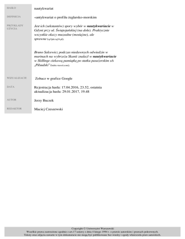 HASŁO nautykwariat DEFINICJA «antykwariat o profilu żeglarsko-morskim» PRZYKŁADY UŻYCIA Jest ich (sekstantów) spory wybór w nautykwariacie w Gdyni przy ul. Świętojańskiej (na dole). Praktycznie wszystkie okazy muzealne (mosiężne), ale sprawne (sp7pki.iq24.pl). Bruno Salcewicz podczas niedawnych odwiedzin w marinach na wybrzeżu Skanii znalazł w nautykwariacie w Skillinge ciekawą pamiątkę po statku pasażerskim s/s „Piłsudski” (baltic-travel.com). WIZUALIZACJE Zobacz w grafice Google DATA Rejestracja hasła: 17.04.2016, 23.52, ostatnia aktualizacja hasła: 29.01.2017, 19.48 AUTOR Jerzy Buczek REDAKTOR Maciej Czeszewski Copyright © Uniwersytet Warszawski Wszelkie prawa zastrzeżone zgodnie z art.17 ustawy z dnia 4 lutego 1994 r. o prawie autorskim i prawach pokrewnych. Teksty oraz zdjęcia zawarte w tym dokumencie nie mogą być publikowane bez wiedzy i zgody właściciela praw autorskich. Powered by TCPDF (www.tcpdf.org)