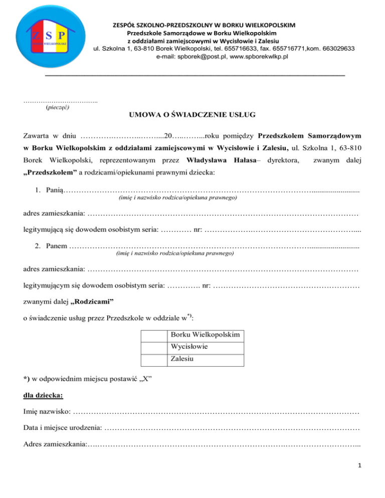 ZESPÓŁ SZKOLNO-PRZEDSZKOLNY W BORKU WIELKOPOLSKIM Przedszkole Samorządowe w Borku Wielkopolskim z oddziałami zamiejscowymi w Wycisłowie i Zalesiu ul. Szkolna 1, 63-810 Borek Wielkopolski, tel. 655716633, fax. 655716771,kom. 663029633 e-mail: [email protected], www.spborekwlkp.pl ____________________________________________________________________________ …………………………….. (pieczęć) UMOWA O ŚWIADCZENIE USŁUG Zawarta w dniu ………….………..……....20…..……...roku pomiędzy Przedszkolem Samorządowym w Borku Wielkopolskim z oddziałami zamiejscowymi w Wycisłowie i Zalesiu, ul. Szkolna 1, 63-810 Borek Wielkopolski, reprezentowanym przez Władysława Hałasa– dyrektora, zwanym dalej „Przedszkolem” a rodzicami/opiekunami prawnymi dziecka: 1. Panią……………………………………………………………………………………......................... (imię i nazwisko rodzica/opiekuna prawnego) adres zamieszkania: …………………………………………………………………………………………… legitymującą się dowodem osobistym seria: ………… nr: ……………….………………………………….... 2. Panem ………………………………………………………………………………….......................... (imię i nazwisko rodzica/opiekuna prawnego) adres zamieszkania: …………………………………………………………………………………………… legitymującym się dowodem osobistym seria: …………. nr: ………………………………………………… zwanymi dalej „Rodzicami” o świadczenie usług przez Przedszkole w oddziale w*): Borku Wielkopolskim Wycisłowie Zalesiu *) w odpowiednim miejscu postawić „X” dla dziecka: Imię nazwisko: ………………………………………………………………………………………………… Data i miejsce urodzenia: ……………………………………………………………………………………… Adres zamieszkania:….……………………………………………………………….………………………... 1 §1 1. Przedszkole zobowiązuje się do zapewnienia dziecku w przedszkolu: 1) bezpłatnej 5 godzinnej realizacji podstawy programowej w godzinach od 8.00 do 13.00, wprowadzonej odrębnymi przepisami, a w przypadku uczęszczania na religię w dniu religii do 13.30. 2) dodatkowo płatnych zajęć opiekuńczo-wychowawczych i dydaktycznych w czasie przekraczającym realizację podstawy programowej: a) zajęcia komputerowe, gimnastyka korekcyjna, zajęcia ruchowe, zajęcia logopedyczne, zajęcia korekcyjno-kompensacyjne, b) gry i zabawy edukacyjne wspomagające rozwój psychofizyczny, emocjonalny i społeczny dziecka, c) gry i zabawy aktywizujące oraz badawcze rozwijające zainteresowania otaczającym światem, d) zajęcia plastyczne, muzyczne, teatralne, twórcze rozwijające zdolność dzieci oraz zaspokajające ich potrzebę poznawczą, e) gry i zabawy ruchowe, zajęcia sportowe wspomagające rozwój fizyczny dziecka. 3. Przedszkole umożliwia odpłatne korzystanie z wyżywienia. 4. Do godziny 13.00 przedszkole zapewnia dwa posiłki tj. śniadanie i obiad. 5. Do godziny 15.30 przedszkole zapewnia trzy posiłki tj. śniadanie, obiad, podwieczorek. 6. Przedszkole świadczy usługi w dni robocze od poniedziałku do piątku w godzinach od 6.30 do 15.30. 7. W okresie wakacji w miesiącu sierpniu oraz dni wolne od pracy przedszkole jest nieczynne. W dni wolne od zajęć dydaktycznych szkoły, których organem prowadzącym jest gmina Borek Wielkopolski, ze względu na zmniejszoną frekwencję przedszkole pełni dyżur. §2 Zasady organizacji pracy przedszkola określa statut przedszkola. §3 1. Opłatę za jedną godzinę świadczenia, w zakresie przekraczającym realizację podstawy programowej wychowania przedszkolnego w przedszkolu obejmującą zajęcia opiekuńczo-wychowawcze dla dzieci, nalicza się w wysokości ustalonej w uchwale nr XII/64/2015 Rady Miejskiej Borku Wlkp. z dnia 25 czerwca 2015 r. w sprawie ustalenia wysokości opłat za świadczenia udzielane w publicznym przedszkolu i oddziałach przedszkolnych w szkołach podstawowych prowadzonym przez Gminę Borek Wlkp. i jest to w bieżącym roku szkolnym 0,80 zł. 2. Odpłatność dzienną za wyżywienie (stawkę żywieniową) ustala dyrektor zespołu na podstawie kosztów zakupu surowców spożywczych niezbędnych do przygotowania posiłków. W dniu zawarcia niniejszej umowy stawka ta wynosi 4,50 zł na 3 posiłki (śniadanie, obiad, podwieczorek) lub 3,50 na 2 posiłki (śniadanie, obiad). Dzienna stawka za wyżywienie może ulec zmianie w zależności od cen rynkowych towarów i nie wymaga zmiany niniejszej umowy. 3. Odpłatność za wyżywienie jest niezależna od opłaty określonej w ust. 1. 4. Rodzic zobowiązuje się do wniesienia opłaty z góry w terminach wyznaczonych w harmonogramie opłat za wychowanie przedszkole w przedszkolu. 5. Wszystkie wpłaty dokonywane są u starszej intendentki. §4 1. Rodzic oświadcza, że dziecko korzystać będzie z usług przedszkola w godz. *) Od godziny Do godziny *) Wpisać wyraźnie czas pobytu dziecka w przedszkolu. 2 2. Rodzic zobowiązuje się do przyprowadzania i odbierania dziecka z przedszkola osobiście lub przez upoważnioną w oświadczeniu osobę według zadeklarowanych godzin. 3. W przypadku odebrania dziecka po godzinie zadeklarowanej w umowie rodzice zobowiązani są do uiszczenia opłaty w wysokości 0,80 zł za każdą dodatkową rozpoczętą godzinę. 4. Konsekwencją dwukrotnego odebrania dziecka poza godzinami pracy przedszkola będzie naliczenie dodatkowej opłaty w wysokości 25 zł za każdą rozpoczętą godzinę. §5 1. Wprowadza się odpis za wyżywienie z tytułu nieobecności dziecka w przedszkolu w wysokości dziennej stawki żywieniowej za każdy dzień nieobecności dziecka w przedszkolu, przy cz