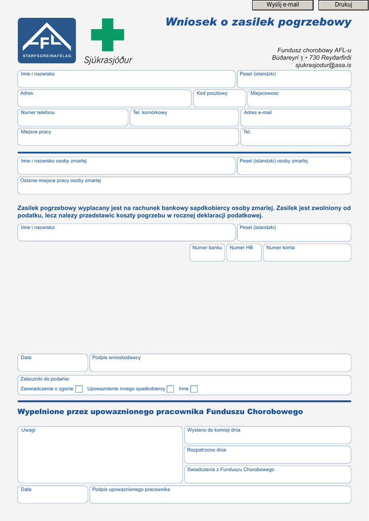Wyślij e-mail Drukuj Wniosek o zasilek pogrzebowy Fundusz chorobowy AFL-u Búðareyri 7 • 730 Reyðarfirði [email protected] Imie i nazwisko Pesel (islandzki) Adres Kod pocztowy Miejscowosc Tel. komórkowy Numer telefonu Adres e-mail Miejsce pracy Tel. Imie i nazwisko osoby zmarlej Pesel (islandzki) osoby zmarlej Ostanie miejsce pracy osoby zmarlej Zasilek pogrzebowy wyplacany jest na rachunek bankowy sapdkobiercy osoby zmarlej. Zasilek jest zwolniony od podatku, lecz nalezy przedstawic koszty pogrzebu w rocznej deklaracji podatkowej. Pesel (islandzki) Imie i nazwisko Numer banku Data Numer HB Numer konta Podpis wnioskodawcy Zalaczniki do podania: Zaswiadczenie o zgonie Upowaznienie innego spadkobiercy Inne Wypelnione przez upowaznionego pracownika Funduszu Chorobowego Uwagi Wyslano do komisji dnia Rozpatrzono dnia Swiadczenia z Funduszu Chorobowego Data Podpis upowaznionego pracownika