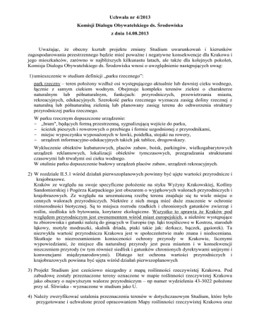 Uchwała nr 4/2013 Komisji Dialogu Obywatelskiego ds. Środowiska z dnia 14.08.2013 UwaŜając, Ŝe obecny kształt projektu zmiany Studium uwarunkowań i kierunków zagospodarowania przestrzennego będzie mieć powaŜne i negatywne konsekwencje dla Krakowa i jego mieszkańców, zarówno w najbliŜszych kilkunastu latach, ale takŜe dla kolejnych pokoleń, Komisja Dialogu Obywatelskiego ds. Środowiska wnosi o uwzględnienie następujących uwag: 1) umieszczenie w studium definicji „parku rzecznego”: park rzeczny – teren połoŜony wzdłuŜ osi występującego aktualnie lub dawniej cieku wodnego, łącznie z samym ciekiem wodnym. Obejmuje kompleks terenów zieleni o charakterze naturalnym lub półnaturalnym, funkcjach: przyrodniczych, przewietrzania miasta, rekreacyjnych, edukacyjnych. Szerokość parku rzecznego wyznacza zasięg doliny rzecznej z naturalną lub półnaturalną zielenią lub planowany zasięg terenu do odtworzenia struktury przyrodniczej parku rzecznego. W parku rzecznym dopuszczone urządzenie: - „bram", będących formą przestrzenną, sygnalizującą wejście do parku, - ścieŜek pieszych i rowerowych o przebiegu i formie uzgodnionej z przyrodnikami, - miejsc wypoczynku wyposaŜonych w ławki, poidełka, stojaki na rowery, - urządzeń informacyjno-edukacyjnych takich jak tablice, drogowskazy. Wykluczenie obiektów kubaturowych, placów zabaw, boisk, parkingów, wielkogabarytowych urządzeń reklamowych, lokalizacji obiektów tymczasowych, przegradzania strukturami czasowymi lub trwałymi osi cieku wodnego. W otulinie parku dopuszczenie budowy urządzeń placów zabaw, urządzeń rekreacyjnych. 2) W rozdziale II.5.1 wśród działań pierwszoplanowych powinny być ujęte wartości przyrodnicze i krajobrazowe. Kraków ze względu na swoje specyficzne połoŜenie na styku WyŜyny Krakowskiej, Kotliny Sandomierskiej i Pogórza Karpackiego jest obszarem o wyjątkowych walorach przyrodniczych i krajobrazowych. Ze względu na urozmaiconą rzeźbę terenu znajduje się tu wiele miejsc o cennych walorach przyrodniczych. Niektóre z nich mogą mieć duŜe znaczenie w ochronie róŜnorodności biotycznej. Są to miejsca rozrodu rzadkich i chronionych gatunków zwierząt i roślin, siedliska ich bytowania, korytarze ekologiczne. Wszystko to sprawia Ŝe Kraków pod względem przyrodniczym jest ewenementem wśród miast europejskich, a niektóre występujące tu zbiorowiska i gatunki naleŜą do ginących w Europie (np. łąki trzęślicowe w Kostrzu, starodub łąkowy, motyle modraszki, skalnik driada, ptaki takie jak: derkacz, bączek, gąsiorek). Ta niezwykła wartość przyrodnicza Krakowa jest w społeczeństwie mało znana i niedoceniana. Skutkuje to niezrozumieniem konieczności ochrony przyrody w Krakowie, licznymi wypowiedziami, Ŝe miejsce dla naturalnej przyrody jest poza miastem i w konsekwencji niszczeniem przyrody (w tym równieŜ siedlisk i gatunków chronionych dyrektywami unijnymi i konwencjami międzynarodowymi). Dlatego teŜ ochrona wartości przyrodniczych i krajobrazowych powinna być ujęta wśród działań pierwszoplanowych 3) Projekt Studium jest cześciowo niezgodny z mapą roślinności rzeczywistej Krakowa. Pod zabudowę zostały przeznaczone tereny oznaczone w mapie roślinności rzeczywistej Krakowa jako obszary o najwyŜszym walorze przyrodniczym – np numer wydzielenia 43-3022 połoŜone przy ul. Śliwiaka - wyznaczone w studium jako U. 4) NaleŜy zweryfikować ustalenia przeznaczenia terenów w dotychczasowym Studium, które było przygotowane i uchwalone przed opracowaniem Mapy roślinności rzeczywistej Krakowa oraz "Koncepcji ochrony róŜnorodności biotycznej miasta Krakowa". Nowe ustalenia Studium muszą uwzględniać aktualną wiedzę o walorach przyrodniczych i konieczność ich ochrony. 5) W rozdziale II.5.4 wśród obszarów proponowanych do objęcia ochroną brak: łąk w Kostrzu, łąk w Pastwiskach, Szerokich Łąk - obszary te są opisane jako cenne przyrodniczo i proponowane do objęcia ochroną w "Koncepcji ochrony róŜnorodności biotycznej miasta Krakowa" ( Instytut Nauk o Środowisku UJ, Kraków 2005) (wersja internetowa dostępna na http://www.eko.uj.edu.pl/przyrodakrakowa/koncept.htm) W rozdziale II.5.4 wśród obszarów proponowanych do objęcia ochroną znajduje się „Las łęgowy w Przegorzałach” przez teren którego planuje się jednocześnie poprowadzenie trasy komunikacyjnej. NaleŜy wykluczyć poprowadzenie trasy komunikacyjnej przez teren lasu łęgowego. 6) Wśród innych obszarów cenne przyrodniczo, na których występują chronione gatunki roślin i zwierząt wymienione są oczka wodne w RŜące, jednocześnie teren wokół jest przeznaczony w studium pod zabudowę. Nie moŜna chronić stawów i gatunków zwierząt przy dopuszczeniu budowy tuŜ obok osiedla. Stawy zostaną zamienione w przyblokowe sadzawki, pozbawione jakichkolwiek walorów przyrodniczych ze względu na przerwanie korytarzy ekologicznych, zagroŜenia dla przyrody stawu związane z zamieszkaniem w jego bezpośrednim sąsiedztwie kilku tysięcy ludzi oraz ich zwierząt (psów, kotów). Jest to jednocześnie obszar źródliskowy potoku BieŜanowskiego. Wykonanie wykopów fundamentów osiedla spowoduje zmianę stosunków wodnych co moŜe mieć wpływ na stan wód Potoku BieŜanowskiego oraz stawu. Teren w "Koncepcji ochrony róŜnorodności biotycznej miasta Krakowa" (wersja internetowa dostępna na http://www.eko.uj.edu.pl/przyrodakrakowa/koncept.htm) na str 128, 129 Instytut Nauk o Środowisku UJ proponuje objęcie terenu ochroną w postaci uŜytku ekologicznego. 7) Niezbędne jest uzupełnienie mapy terenów cennych przyrodniczo i korytarzy ekologicznych zgodnie z mapą autorstwa dr. Kazimierza Walasza (zał. nr 1) 8) Niezbędne jest wykorzystanie w pracach nad zmianą Studium mapy zbiorników i cieków wodnych autorstwa dr. Kazimierza Walasza (zał. nr 2). NaleŜy przeprowadzić rzetelną inwentaryzację szczególnie małych, ginąc