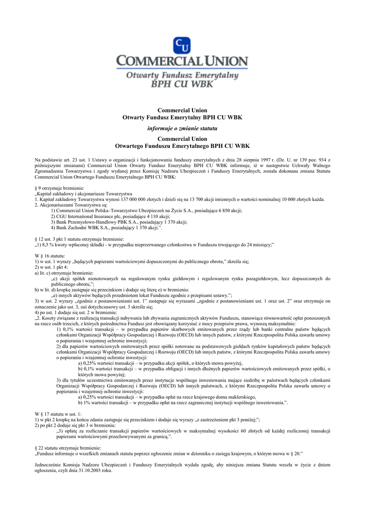 Commercial Union Otwarty Fundusz Emerytalny BPH CU WBK informuje o zmianie statutu Commercial Union Otwartego Funduszu Emerytalnego BPH CU WBK Na podstawie art. 23 ust. 1 Ustawy o organizacji i funkcjonowaniu funduszy emerytalnych z dnia 28 sierpnia 1997 r. (Dz. U. nr 139 poz. 934 z późniejszymi zmianami) Commercial Union Otwarty Fundusz Emerytalny BPH CU WBK informuje, iż w następstwie Uchwały Walnego Zgromadzenia Towarzystwa i zgody wydanej przez Komisję Nadzoru Ubezpieczeń i Funduszy Emerytalnych, została dokonana zmiana Statutu Commercial Union Otwartego Funduszu Emerytalnego BPH CU WBK: § 9 otrzymuje brzmienie: „Kapitał zakładowy i akcjonariusze Towarzystwa 1. Kapitał zakładowy Towarzystwa wynosi 137 000 000 złotych i dzieli się na 13 700 akcji imiennych o wartości nominalnej 10 000 złotych każda. 2. Akcjonariuszami Towarzystwa są: 1) Commercial Union Polska–Towarzystwo Ubezpieczeń na Życie S.A., posiadające 6 850 akcji; 2) CGU International Insurance plc, posiadające 4 110 akcji; 3) Bank Przemysłowo-Handlowy PBK S.A., posiadający 1 370 akcji; 4) Bank Zachodni WBK S.A., posiadający 1 370 akcji.”. § 12 ust. 3 pkt 1 statutu otrzymuje brzmienie: „1) 8,5 % kwoty wpłaconej składki - w przypadku nieprzerwanego członkostwa w Funduszu trwającego do 24 miesięcy;” W § 16 statutu: 1) w ust. 1 wyrazy „będących papierami wartościowymi dopuszczonymi do publicznego obrotu,” skreśla się; 2) w ust. 1 pkt 4: a) lit. c) otrzymuje brzmienie: „c) akcji spółek nienotowanych na regulowanym rynku giełdowym i regulowanym rynku pozagiełdowym, lecz dopuszczonych do publicznego obrotu,”; b) w lit. d) kropkę zastępuje się przecinkiem i dodaje się literę e) w brzmieniu: „e) innych aktywów będących przedmiotem lokat Funduszu zgodnie z przepisami ustawy.”; 3) w ust. 2 wyrazy „zgodnie z postanowieniami ust. 1” zastępuje się wyrazami „zgodnie z postanowieniami ust. 1 oraz ust. 2” oraz otrzymuje on oznaczenie jako ust. 3, zaś dotychczasowy ust. 3 skreśla się; 4) po ust. 1 dodaje się ust. 2 w brzmieniu: „2. Koszty związane z realizacją transakcji nabywania lub zbywania zagranicznych aktywów Funduszu, stanowiące równowartość opłat ponoszonych na rzecz osób trzecich, z których pośrednictwa Fundusz jest obowiązany korzystać z mocy przepisów prawa, wynoszą maksymalnie: 1) 0,1% wartości transakcji – w przypadku papierów skarbowych emitowanych przez rządy lub banki centralne państw będących członkami Organizacji Współpracy Gospodarczej i Rozwoju (OECD) lub innych państw, z którymi Rzeczpospolita Polska zawarła umowy o popieraniu i wzajemnej ochronie inwestycji; 2) dla papierów wartościowych emitowanych przez spółki notowane na podstawowych giełdach rynków kapitałowych państw będących członkami Organizacji Współpracy Gospodarczej i Rozwoju (OECD) lub innych państw, z którymi Rzeczpospolita Polska zawarła umowy o popieraniu i wzajemnej ochronie inwestycji: a) 0,25% wartości transakcji – w przypadku akcji spółek, o których mowa powyżej, b) 0,1% wartości transakcji – w przypadku obligacji i innych dłużnych papierów wartościowych emitowanych przez spółki, o których mowa powyżej; 3) dla tytułów uczestnictwa emitowanych przez instytucje wspólnego inwestowania mające siedzibę w państwach będących członkami Organizacji Współpracy Gospodarczej i Rozwoju (OECD) lub innych państwach, z którymi Rzeczpospolita Polska zawarła umowy o popieraniu i wzajemnej ochronie inwestycji: a) 0,25% wartości transakcji – w przypadku opłat na rzecz krajowego domu maklerskiego, b) 1% wartości transakcji – w przypadku opłat na rzecz zagranicznej instytucji wspólnego inwestowania.”. W § 17 statutu w ust. 1: 1) w pkt 2 kropkę na końcu zdania zastępuje się przecinkiem i dodaje się wyrazy „z zastrzeżeniem pkt 3 poniżej;”; 2) po pkt 2 dodaje się pkt 3 w brzmieniu: „3) opłatę za rozliczanie transakcji papierów wartościowych w maksymalnej wysokości 60 złotych od każdej rozliczonej transakcji papierami wartościowymi przechowywanymi za granicą.”. § 22 statutu otrzymuje brzmienie: „Fundusz informuje o wszelkich zmianach statutu poprzez ogłoszenie zmian w dzienniku o zasięgu krajowym, o którym mowa w § 20.” Jednocześnie Komisja Nadzoru Ubezpieczeń i Funduszy Emerytalnych wydała zgodę, aby niniejsza zmiana Statutu weszła w życie z dniem ogłoszenia, czyli dnia 31.10.2003 roku.