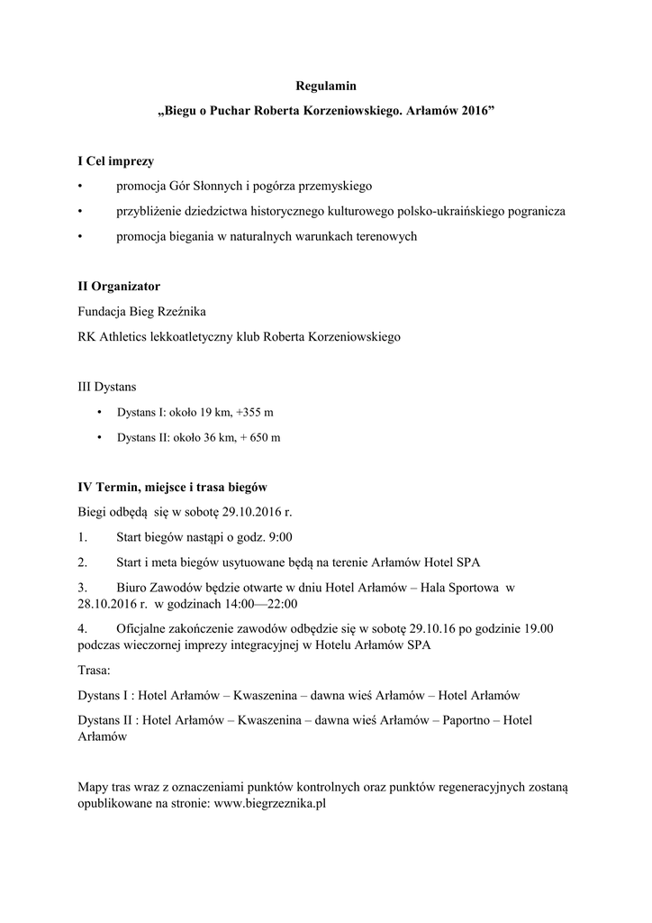 Regulamin „Biegu o Puchar Roberta Korzeniowskiego. Arłamów 2016” I Cel imprezy • promocja Gór Słonnych i pogórza przemyskiego • przybliżenie dziedzictwa historycznego kulturowego polsko-ukraińskiego pogranicza • promocja biegania w naturalnych warunkach terenowych II Organizator Fundacja Bieg Rzeźnika RK Athletics lekkoatletyczny klub Roberta Korzeniowskiego III Dystans • Dystans I: około 19 km, +355 m • Dystans II: około 36 km, + 650 m IV Termin, miejsce i trasa biegów Biegi odbędą się w sobotę 29.10.2016 r. 1. Start biegów nastąpi o godz. 9:00 2. Start i meta biegów usytuowane będą na terenie Arłamów Hotel SPA 3. Biuro Zawodów będzie otwarte w dniu Hotel Arłamów – Hala Sportowa w 28.10.2016 r. w godzinach 14:00—22:00 4. Oficjalne zakończenie zawodów odbędzie się w sobotę 29.10.16 po godzinie 19.00 podczas wieczornej imprezy integracyjnej w Hotelu Arłamów SPA Trasa: Dystans I : Hotel Arłamów – Kwaszenina – dawna wieś Arłamów – Hotel Arłamów Dystans II : Hotel Arłamów – Kwaszenina – dawna wieś Arłamów – Paportno – Hotel Arłamów Mapy tras wraz z oznaczeniami punktów kontrolnych oraz punktów regeneracyjnych zostaną opublikowane na stronie: www.biegrzeznika.pl V Limity czasu 1. Zawodników obowiązuje limit czasu na pokonanie trasy biegu: Dystans I - 3 godziny; Dysnas II – 5 godzin. 2. Na obu dystansach obowiązuje dodatkowy limit czasu 1,5 godz. na punkcie kontrolnym w Kwaszeninie. Zawodnicy, którzy nie zdołają opuścić tego punktu kontrolnego w limicie, będą dyskwalifikowani. VI Uczestnictwo 1. Z zastrzeżeniem pkt VI ust. 2, w imprezie mogą wziąć osoby, które: a) w dniu zawodów będą mały ukończone 18 lat, b) przedstawią organizatorom pisemne oświadczenie o stanie zdrowia pozwalającym na udział w zawodach (do podpisania w biurze zawodów), c) dokonają opłaty za udział w imprezie obejmującej: - zakwaterowanie w pokojach 1 lub 2-osobowych w Arłamów Hotel SPA wraz z dostępem do centrum wodno–termalnego i siłowni oraz wyżywieniem od kolacji w dniu 28.10.2016r do śniadania 30.10.2016 roku; - udział w biegu na wybranym dystansie, - udział w wieczornej imprezie integracyjnej w dniu 29.10.2016 roku, 2. Istnieje możliwość uczestnictwa w imprezie osób nie biorących udziału w biegu. Do osób tych nie znajduje zastosowania pkt VI ust. 1 lit. a) - b). 3. Zgłoszeń można dokonać drogą elektroniczną poprzez formularz dostępny na stronie www.biegrzeznika.pl oraz [www.arlamow.pl]. W zgłoszeniu należy podać m.in. imię, nazwisko, datę urodzenia, adres e-mail, nr telefonu komórkowego, obywatelstwo, adres korespondencyjny oraz opcjonalnie przynależność klubową i dane do faktury. 3. Limit uczestników określa się na 300 osób. VII Opłata startowa 1. Opłata za udział w imprezie wynosi: a) 990 zł w przy wyborze zakwaterowania w pokoju 2 – osobowym, b) 1190 zł w przy wyborze zakwaterowania w pokoju 1 – osobowym, c) 1090 zł dla osób nie biorących udziału w biegu przy wyborze zakwaterowania w pokoju 1 – osobowym, d) 890 zł dla osób nie biorących udziału w biegu przy wyborze zakwaterowania w pokoju 2 – osobowym. 2. Opłatę należy dokonać przy zapisach, za pośrednictwem systemu płatności transferuj.pl: https://b4sportonline.pl/bieg-o-puchar-roberta-korzeniowskiego/zapisy VIII Świadczenia w ramach udziału w biegu Zawodnicy otrzymają: • Weekendowy pobyt w Hotelu Arłamów (dwie doby hotelowe) • Pakiet startowy wraz z numerem uprawniającym do udziału w biegu na wybranym dystansie • napoje izotoniczne, energetyczne oraz lekkie posiłki, które będą serwowane na punkcie regeneracyjnym na trasie biegu oraz na mecie, • podstawową obsługę medyczną. Wszyscy, którzy ukończą bieg otrzymają pamiątkowe medale. IX Punkty regeneracyjne Punkty regeneracyjne zaopatrzone będą m.in. w wodę, napoje izotoniczne oraz żele lub batony energetyczne. X Klasyfikacje 1. Na każdym dystansie prowadzona będzie klasyfikacja generalna kobiet i mężczyzn. Organizator zastrzega sobie prawo wprowadzenia dodatkowych klasyfikacji. 2. Podstawą klasyfikacji jest elektroniczny pomiar czasu. Na trasie biegu znajdować się będą punkty kontrolne. Brak odczytu pojawienia się zawodnika na danym punkcie może spowodować dyskwalifikację. 3. Klasyfikacja zawodników odbywa się na podstawie czasu brutto (liczonego od chwili strzału startera). XI Nagrody 1. Zwycięscy na każdym z dystansów otrzymają pamiątkowy puchar. Dekoracja zwycięzców każdego z dystansów odbędzie się podczas imprezy integracyjnej w dniu 29.10.2016r. 2. Podczas imprezy integracyjnej wśród uczestników biegów rozlosowane zostaną nagrody specjalne: • bal sylwestrowy 2016 wraz z dwudobowym pobytem dla dwóch osób w Arłamów Hotel & SPA • 2 pobyty weekendowe dla dwóch osób w dowolnie wybranym terminie w Arłamów Hotel & SPA do wykorzystania w ciągu 12 miesięcy po „Biegu o Puchar Roberta Korzeniowskiego”. XII Bezpieczeństwo 1. Od uczestników oczekujemy samodzielnej oceny sytuacji panującej na trasie i odpowiedniego reagowania w razie pogorszenia pogody. Organizatorzy zastrzegają sobie możliwość wstrzymania lub przerwania biegów m.in. w razie wystąpienia burzy, innych ekstremalnych warunków pogodowych, naturalnych katastrof lub innych czynników uniemożliwiających bezpieczne przeprowadzenie zawodów. 2. W przypadku rezygnacji z dalszego biegu, zawodnik ma obowiązek poinformować o tym obsługę biegu (telefonicznie lub w inny skuteczny sposób). W przeciwnym razie Organizator może być zmuszony do uruchomienia akcji poszukiwawczej, czego konsekwencje będą spoczywały na zawodniku, który zaniechał udzielenia informacji o rezygnacji z biegu. 3. Zawodnicy powinni posiadać ubezpieczenie NNW. XIII Ochrona przyrody Na trasach biegu należy stosować się do zasad ochrony przyrody, a w szczególności zabrania się: • zaśmiecania terenu (czyli np. porzucan