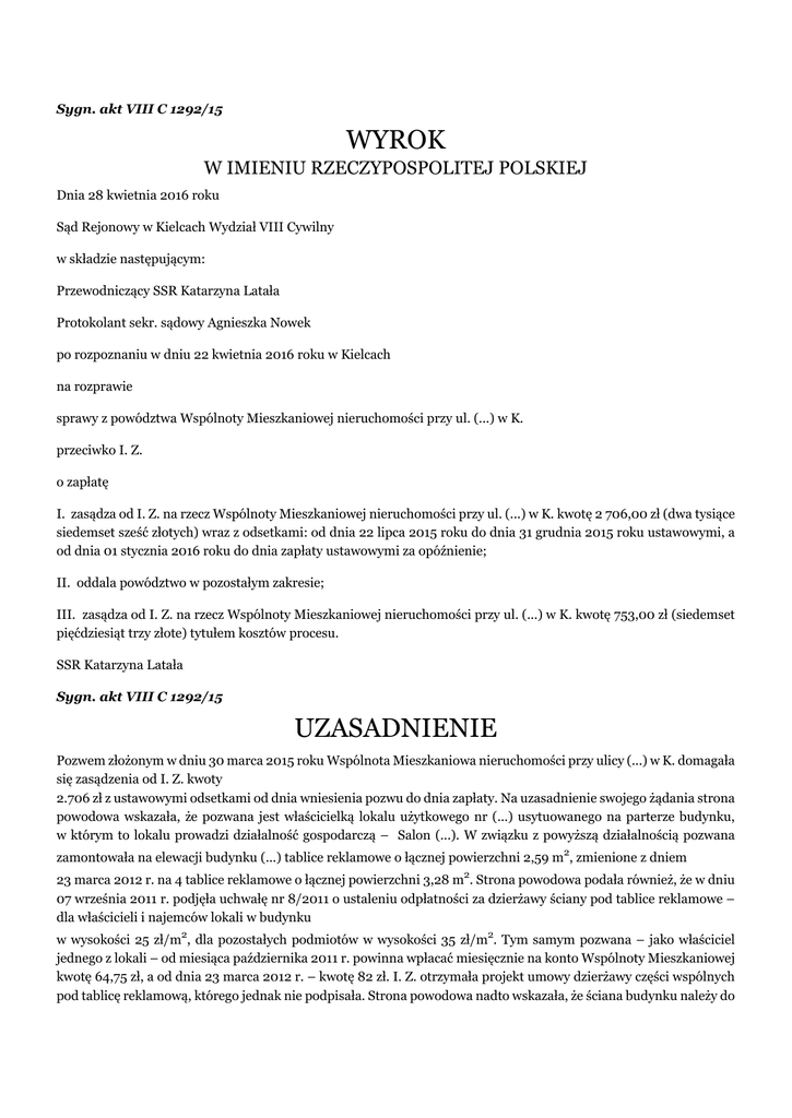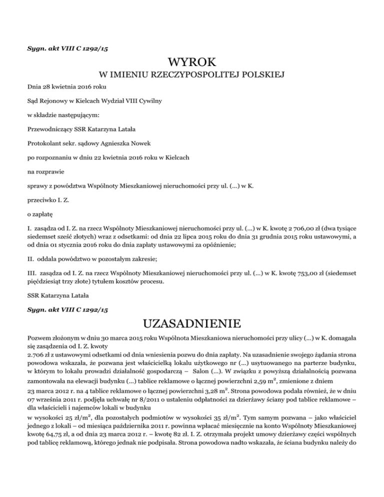 Sygn. akt VIII C 1292/15 WYROK W IMIENIU RZECZYPOSPOLITEJ POLSKIEJ Dnia 28 kwietnia 2016 roku Sąd Rejonowy w Kielcach Wydział VIII Cywilny w składzie następującym: Przewodniczący SSR Katarzyna Latała Protokolant sekr. sądowy Agnieszka Nowek po rozpoznaniu w dniu 22 kwietnia 2016 roku w Kielcach na rozprawie sprawy z powództwa Wspólnoty Mieszkaniowej nieruchomości przy ul. (...) w K. przeciwko I. Z. o zapłatę I. zasądza od I. Z. na rzecz Wspólnoty Mieszkaniowej nieruchomości przy ul. (...) w K. kwotę 2 706,00 zł (dwa tysiące siedemset sześć złotych) wraz z odsetkami: od dnia 22 lipca 2015 roku do dnia 31 grudnia 2015 roku ustawowymi, a od dnia 01 stycznia 2016 roku do dnia zapłaty ustawowymi za opóźnienie; II. oddala powództwo w pozostałym zakresie; III. zasądza od I. Z. na rzecz Wspólnoty Mieszkaniowej nieruchomości przy ul. (...) w K. kwotę 753,00 zł (siedemset pięćdziesiąt trzy złote) tytułem kosztów procesu. SSR Katarzyna Latała Sygn. akt VIII C 1292/15 UZASADNIENIE Pozwem złożonym w dniu 30 marca 2015 roku Wspólnota Mieszkaniowa nieruchomości przy ulicy (...) w K. domagała się zasądzenia od I. Z. kwoty 2.706 zł z ustawowymi odsetkami od dnia wniesienia pozwu do dnia zapłaty. Na uzasadnienie swojego żądania strona powodowa wskazała, że pozwana jest właścicielką lokalu użytkowego nr (...) usytuowanego na parterze budynku, w którym to lokalu prowadzi działalność gospodarczą – Salon (...). W związku z powyższą działalnością pozwana zamontowała na elewacji budynku (...) tablice reklamowe o łącznej powierzchni 2,59 m2, zmienione z dniem 23 marca 2012 r. na 4 tablice reklamowe o łącznej powierzchni 3,28 m2. Strona powodowa podała również, że w dniu 07 września 2011 r. podjęła uchwałę nr 8/2011 o ustaleniu odpłatności za dzierżawy ściany pod tablice reklamowe – dla właścicieli i najemców lokali w budynku w wysokości 25 zł/m2, dla pozostałych podmiotów w wysokości 35 zł/m2. Tym samym pozwana – jako właściciel jednego z lokali – od miesiąca października 2011 r. powinna wpłacać miesięcznie na konto Wspólnoty Mieszkaniowej kwotę 64,75 zł, a od dnia 23 marca 2012 r. – kwotę 82 zł. I. Z. otrzymała projekt umowy dzierżawy części wspólnych pod tablicę reklamową, którego jednak nie podpisała. Strona powodowa nadto wskazała, że ściana budynku należy do części wspólnych nieruchomości i jej zajęcie bez zgody wspólnoty mieszkaniowej nie jest dopuszczalne. Tym samym właściciele lokali nie mogą dowolnie korzystać z elewacji z powołaniem się wyłącznie na swoje prawo własności. Strona powodowa stwierdziła przy tym, że wspólnota mieszkaniowa ma prawo czerpać korzyści z dzierżawy ściany pod reklamy. Podniosła także, że reklama zamieszczona przez pozwaną miała charakter komercyjny i służyła wyłącznie I. Z., bowiem jej celem było zachęcenie potencjalnych klientów do korzystania z usług prowadzonego przez nią salonu sukien ślubnych. Z uzasadnienia pozwu wynika również, że kwota dochodzona pozwem z tytułu bezumownego korzystania ze ściany budynku została obliczona według stawki ustalonej na podstawie powołanej uchwałą od daty jej wejścia w życie, tj. od miesiąca lipca 2012 r. do marca 2015 r. Jako wysokość szkody strona powodowa przyjęła kwotę, jaką mogłaby uzyskać za wynajem elewacji zgodnie z powyższą uchwałą, czyli 2.706 zł (33 miesiące x 82 zł). Wskazana suma zbliżona jest do średniej stawki wynajmu elewacji na sąsiednich budynkach w tej części miasta. Strona powodowa wskazała również, że już raz wystąpiła z pozwem przeciwko pozwanej o zapłatę kwoty 639,51 zł za bezumowne korzystanie z elewacji budynku w okresie 1 października 2011 r. do czerwca 2012 r., jednak powództwo zostało oddalone z przyczyn o charakterze formalnym (k. 45-48). Nakazem zapłaty w postepowaniu upominawczym z dnia 27 maja 2015 roku o sygn. VIII Nc 740/15 Sąd Rejonowy w Kielcach uwzględnił powództwo w całości (k. 49). Pozwana I. Z. wzniosła sprzeciw od powyższego nakazu zapłaty, w którym zaskarżyła go w całości, żądając oddalenia powództwa. Na uzasadnienie swojego stanowiska wskazała, że roszczenie pozwu nie zostało udowodnione, co zwalnia ją od wdawania się w spór w szerszym zakresie. Podała, iż strona powodowa wywodzi swoje roszczenie z prawa własności. W ocenie pozwanej wywody pozwu wskazują, iż strona powodowa wysuwa swoje żądanie z faktu, że w myśl ustawy o własności lokali ściana budynku należy do części wspólnych nieruchomości, a jej jakiekolwiek zajęcie bez zgody wspólnoty jako właściciela nie jest dopuszczalne. Powyższe sformułowanie wskazuje, że strona powodowa wywodzi swoje roszczenia z prawa własności, podczas gdy nie wykazała tytułu własności do nieruchomości. Z uzasadnienia sprzeciwu wynika przy tym, że powyższa wada pozwu – zgodnie z zasadą prekluzji – jest nienaprawialna, a w konsekwencji całkowicie niweczy zasadność dochodzonego roszczenia. Strona powodowa nie wskazała również o jakie przepisy ustawy o własności lokali chodzi i co ma z nich wynikać, natomiast załączyła do pozwu wyrok w innej podobnej sprawie, którą przegrała przede wszystkim dlatego, że nie przedstawiła dowodów na uzasadnienie swojego żądania. Zdaniem pozwanej w niniejszej sprawie strona powodowa powiela ten sam błąd formalny i nie prezentuje dowodów uzasadniających żądanie pozwu. I. Z. stwierdziła także, że żądanie pozwu jest mało precyzyjne, bowiem w petitum pozwu nie wskazano jakiego okresu dotyczą dochodzone świadczenia okresowe. Podniosła również, że strona powodowa nie wykazała wysokości szkody, podczas gdy z treści pozwu wynika, że roszczenie ma charakter odszkodowawczy. W ocenie pozwanej, w takim przypadku nie mają żadnego znaczenia uchwały podejmowane przez wspólnotę mieszkaniową. Pozew nie zawiera przy tym żadnego wniosku dowod