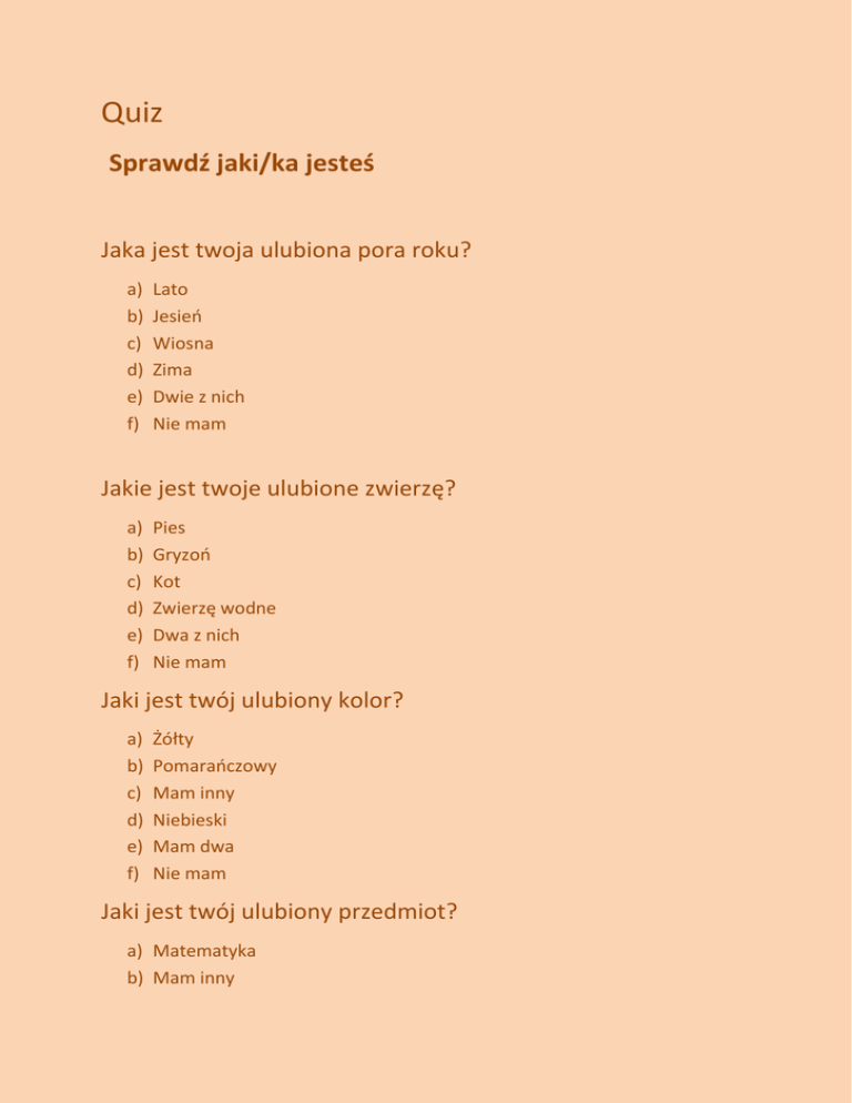 Quiz Sprawdź jaki/ka jesteś Jaka jest twoja ulubiona pora roku? a) b) c) d) e) f) Lato Jesieo Wiosna Zima Dwie z nich Nie mam Jakie jest twoje ulubione zwierzę? a) b) c) d) e) f) Pies Gryzoo Kot Zwierzę wodne Dwa z nich Nie mam Jaki jest twój ulubiony kolor? a) b) c) d) e) f) Żółty Pomaraoczowy Mam inny Niebieski Mam dwa Nie mam Jaki jest twój ulubiony przedmiot? a) Matematyka b) Mam inny c) d) e) f) Język polski W-f Mam dwa Nie mam Jaka jest twoja ulubiona muzyka? a) b) c) d) e) f) Latynoska Pop Szybka Spokojna Dwie z nich Nie mam Jaki chciałbyś mied kolor włosów? a) b) c) d) e) f) Kasztan Rudy Blond Brązowy Dwa z tych Inny Jaki chciałbyś/abyś mied kolor oczu? a) b) c) d) e) f) Wodę morską Brąz Błękit Niebiesko-szare Dwa z tych Inny Co robisz w czasie wolnym? a) b) c) d) Spędzam czas z przyjaciółmi Uprawiam jakiś sport Gram na komputerze Rysuję e) Mam dwa z tych f) Robię coś innego Jaki jest ulubiony strój? a) b) c) d) e) f) Swobodny Sportowy Na topie Elegancki Dwa z nich Nie mam Jak spędziłbyś/abyś wakacje? a) Najchętniej pojechałabym/bym nad morze, lub na kolonie z koleżanką/kolegą b) Zostałabym/bym w domu i bawiłabym/bym się z przyjaciółmi, a czasem wyjechałabym/bym nad jezioro c) Pluskałabym/bym się do woli w basenach i odpoczywał pośród palm d) Wyjechałabym/bym w góry, jadła/jadł oscypki i wspinała się po górskich szlakach e) Nie mogę się zdecydowad f) Mnie jest obojętnie, gdyż to rodzice wybierają Punktacja a Jesteś przyjacielska/ki i żywa/wy b Jesteś wyjątkowy/wa masz w sobie coś co sprawia, inni cię lubią mimo, że się wyróżniasz c jesteś prawdziwą dziewczyną d Lubisz spędzad czas sama/sam nie masz dużo przyjaciół, lecz wszystko z czasem się ułoży e Trudno jest wybrad Ci jedną ulubioną rzecz, dlatego gdy będzie tego koniecznośd będzie Ci trudno f Jesteś bardzo, aż za nadto obojętny Małgosia Knast kl. 4b