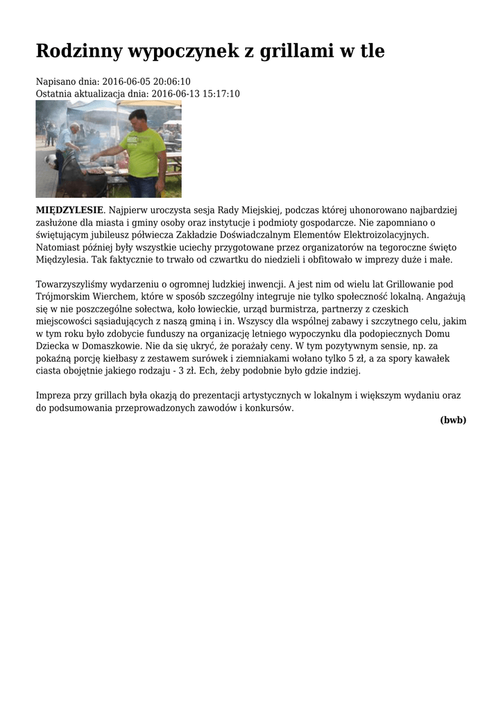 Rodzinny wypoczynek z grillami w tle Napisano dnia: 2016-06-05 20:06:10 Ostatnia aktualizacja dnia: 2016-06-13 15:17:10 MIĘDZYLESIE. Najpierw uroczysta sesja Rady Miejskiej, podczas której uhonorowano najbardziej zasłużone dla miasta i gminy osoby oraz instytucje i podmioty gospodarcze. Nie zapomniano o świętującym jubileusz półwiecza Zakładzie Doświadczalnym Elementów Elektroizolacyjnych. Natomiast później były wszystkie uciechy przygotowane przez organizatorów na tegoroczne święto Międzylesia. Tak faktycznie to trwało od czwartku do niedzieli i obfitowało w imprezy duże i małe. Towarzyszyliśmy wydarzeniu o ogromnej ludzkiej inwencji. A jest nim od wielu lat Grillowanie pod Trójmorskim Wierchem, które w sposób szczególny integruje nie tylko społeczność lokalną. Angażują się w nie poszczególne sołectwa, koło łowieckie, urząd burmistrza, partnerzy z czeskich miejscowości sąsiadujących z naszą gminą i in. Wszyscy dla wspólnej zabawy i szczytnego celu, jakim w tym roku było zdobycie funduszy na organizację letniego wypoczynku dla podopiecznych Domu Dziecka w Domaszkowie. Nie da się ukryć, że porażały ceny. W tym pozytywnym sensie, np. za pokaźną porcję kiełbasy z zestawem surówek i ziemniakami wołano tylko 5 zł, a za spory kawałek ciasta obojętnie jakiego rodzaju - 3 zł. Ech, żeby podobnie było gdzie indziej. Impreza przy grillach była okazją do prezentacji artystycznych w lokalnym i większym wydaniu oraz do podsumowania przeprowadzonych zawodów i konkursów. (bwb)