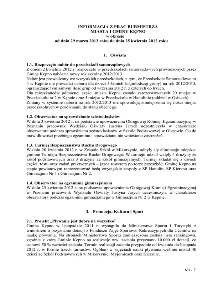 INFORMACJA Z PRAC BURMISTRZA MIASTA I GMINY KĘPNO w okresie od dnia 29 marca 2012 roku do dnia 25 kwietnia 2012 roku 1. Oświata 1.1. Rozpoczęto nabór do przedszkoli samorządowych Z dniem 2 kwietnia 2012 r. rozpoczęto w przedszkolach samorządowych prowadzonych przez Gminę Kępno nabór na nowy rok szkolny 2012/2013. Nabór jest prowadzony we wszystkich przedszkolach, z tym, że Przedszkole Samorządowe nr 4 w Kępnie nie prowadzi naboru dla dzieci 3-letnich (najmłodszej grupy) na rok 2012/2013, ograniczając tym samym ilość grup od września 2012 r. z czterech do trzech. Dla mieszkańców północnej części miasta Kępna zostało zarezerwowanych 20 miejsc w Przedszkolu nr 2 w Kępnie oraz 5 miejsc w Przedszkolu w Hanulinie (oddział w Osinach). Zmiany w systemie naboru na rok 2012/2013 nie spowodują zmniejszenia się ilości miejsc przedszkolnych w porównaniu do stanu obecnego. 1.2. Obserwator na sprawdzianie szóstoklasistów W dniu 3 kwietnia 2012 r. na podstawie upoważnienia Okręgowej Komisji Egzaminacyjnej w Poznaniu pracownik Wydziału Oświaty Justyna Jarych uczestniczyła w charakterze obserwatora podczas sprawdzianu szóstoklasistów w Szkole Podstawowej w Olszowie. Co do prawidłowości przebiegu egzaminu i sprawdzianu nie wniesiono zastrzeżeń. 1.3. Turniej Bezpieczeństwa Ruchu Drogowego W dniu 20 kwietnia 2012 r. w Zespole Szkół w Mikorzynie, odbyły się eliminacje miejskogminne Turnieju Bezpieczeństwa Ruchu Drogowego. W turnieju udział wzięły 4 drużyny ze szkół podstawowych oraz 3 drużyny ze szkół gimnazjalnych. Turniej składał się z dwóch części: testu oraz zadań praktycznych – jazda rowerem po torze przeszkód. Gminę Kępno na etapie powiatowym reprezentować będą zwycięskie zespoły z SP Hanulin, SP Kierzno oraz Gimnazjum Nr 1 i Gimnazjum Nr 2. 1.4. Obserwator na egzaminie gimnazjalnym W dniu 25 kwietnia 2012 r. na podstawie upoważnienia Okręgowej Komisji Egzaminacyjnej w Poznaniu pracownik Wydziału Oświaty Justyna Jarych uczestniczyła w charakterze obserwatora podczas egzaminu gimnazjalnego w Gimnazjum Nr 2 w Kępnie. 2. Promocja, Kultura i Sport 2.1. Projekt „Pływanie jest dobre na wszystko” Gmina Kępno w listopadzie 2011 r. wystąpiła do Ministerstwa Sportu i Turystyki z wnioskiem o przyznanie dotacji z Funduszu Zajęć Sportowo-Rekreacyjnych dla Uczniów na naukę pływania. Na stronach Ministerstwa Sportu zamieszczona została lista rankingowa, zgodnie z którą Gminie Kępno na realizację ww. zadania przyznano 10.000 zł dotacji, co stanowi 50 % wartości zadania. Termin realizacji zadania przypadnie od kwietnia do listopada 2012 r. w formie trzech turnusów. Ogółem w zajęciach nauki pływania weźmie udział 40 dzieci ze Szkół Podstawowych w Mikorzynie, Myjomicach oraz Kierznie. str. 1 2.2. Dzień Pamięci Ofiar Zbrodni Katyńskiej Dzień Pamięci Ofiar Zbrodni Katyńskiej jest polskim świętem obchodzonym co roku 13 kwietnia. Sejm Rzeczypospolitej Polskiej uchwalił je poprzez aklamację 14 listopada 2007 roku a jego przesłaniem jest oddanie hołdu ofiarom zbrodni katyńskiej. Dzień Pamięci obchodzony jest w rocznicę opublikowania przez Niemców w 1943 r. informacji o odkryciu w Rosji masowych grobów oficerów Wojska Polskiego. W piątek, 13 kwietnia 2012 r. o godz. 12:00 z okazji 72 rocznicy zbrodni katyńskiej na kępińskim Rynku odbyło się złożenie wiązanek. Kwiaty pod pomnikiem z tej okazji złożyła delegacja Urzędu Miasta i Gminy w Kępnie w składzie: Burmistrz Aniela Kempa, Przewodniczący Rady Miejskiej Krzysztof Dąbrowski oraz Sekretarz Miasta i Gminy Kępno Krystyna Wiertelak. Wiązanki składali również przedstawiciele Starostwa Powiatowego ze Starostą Włodzimierzem Mazurkiewiczem oraz Towarzystwa Miłośników Ziemi Kępińskiej 3. Gospodarka komunalna i nieruchomości 3.1. W dniu 30 marca 2012 r. odbył się II przetarg dotyczący zbycia, z zasobu mienia komunalnego Gminy Kępno, nieruchomości lokalowej, położonej w Kępnie, przy ul. Spółdzielczej nr 7 (lokal nr 9). W związku z brakiem oferentów przetarg nie dał rezultatu. 3.2. W dniu 2 kwietnia 2012 r. w budynku Ratusza odbyło się spotkanie z udziałem Burmistrz Miasta i Gminy Kępno, Dyrektora KOSIR-u, Naczelnika Wydziału Gospodarki Komunalnej, Nieruchomości, Ochrony Środowiska i Planowania Przestrzennego, Naczelnika Wydziału Promocji Informacji Kultury i Sportu oraz Zastępcy Naczelnika Wydziału Inwestycji i Funduszów Europejskich Urzędu Miasta i Gminy w Kępniem a także przedstawicieli Rady Sołeckiej Wsi Krążkowy w sprawie zarządzania nowo wybudowanymi obiektami sportowymi w miejscowości Krążkowy. 3.3. W dniu 4 kwietnia 2012 r. Burmistrz Miasta i Gminy Kępno podpisała zarządzenie Nr 23/2012 w sprawie: dzierżawy z zasobów mienia komunalnego Gminy Kępno gruntu położonego w miejscowości Hanulin. Przedmiotem dzierżawy jest grunt o powierzchni ca. 0,0060 ha, położony w Hanulinie przy ul. Bohaterów Westerplatte. Dzierżawa nastąpi w drodze przetargu ustnego ograniczonego do właścicieli nieruchomości przyległych, w celu poprawy warunków ich zagospodarowania. 3.4. W dniu 20 kwietnia 2012 r. w siedzibie Urzędu Miasta i Gminy w Kępnie przy ul. Kościuszki nr 5 odbyło się spotkanie z udziałem Przewodniczącego Rady Miejskiej w Kępnie, Naczelnika Wydziału Gospodarki Komunalnej, Nieruchomości, Ochrony Środowiska i Planowania Przestrzennego oraz Zastępcy Naczelnika Wydziału Inwestycji i Funduszów Europejskich Urzędu Miasta i Gminy w Kępnie oraz przedstawicielami firmy REGIOPLAN Sp. z o.o., dotyczące rozpatrzenia skargi właściciela gruntów położonych w Osinach przy drodze krajowej nr 8 oraz wprowadzenia zmiany do projektu studium uwarunkowań i kierunków zagospodarowania przestrzennego oraz planu miejscowego. 3.5. Zbiórka odpadów wielkogabarytowych W każdą kolejną sobotę od 28 kwietnia do 19 maja 2012 roku włącznie na terenie Miasta i Gminy Kępno odbędzie si