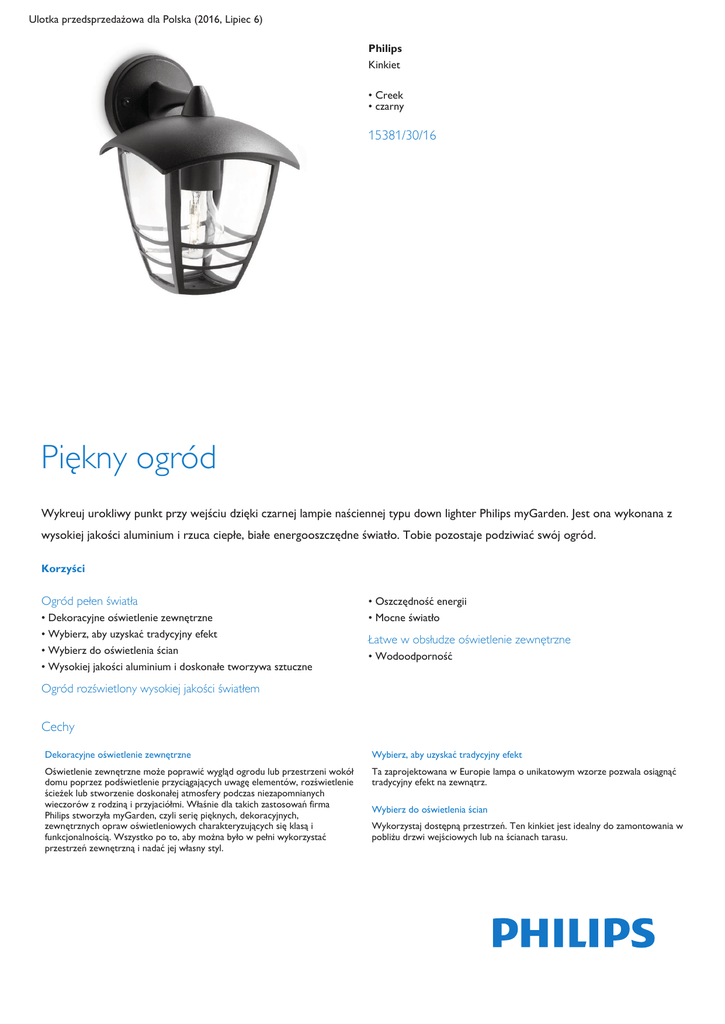 Ulotka przedsprzedażowa dla Polska (2016, Lipiec 6) Philips Kinkiet • Creek • czarny 15381/30/16 Piękny ogród Wykreuj urokliwy punkt przy wejściu dzięki czarnej lampie naściennej typu down lighter Philips myGarden. Jest ona wykonana z wysokiej jakości aluminium i rzuca ciepłe, białe energooszczędne światło. Tobie pozostaje podziwiać swój ogród. Korzyści Ogród pełen światła • Dekoracyjne oświetlenie zewnętrzne • Wybierz, aby uzyskać tradycyjny efekt • Wybierz do oświetlenia ścian • Wysokiej jakości aluminium i doskonałe tworzywa sztuczne • Oszczędność energii • Mocne światło Łatwe w obsłudze oświetlenie zewnętrzne • Wodoodporność Ogród rozświetlony wysokiej jakości światłem Cechy Dekoracyjne oświetlenie zewnętrzne Wybierz, aby uzyskać tradycyjny efekt Oświetlenie zewnętrzne może poprawić wygląd ogrodu lub przestrzeni wokół domu poprzez podświetlenie przyciągających uwagę elementów, rozświetlenie ścieżek lub stworzenie doskonałej atmosfery podczas niezapomnianych wieczorów z rodziną i przyjaciółmi. Właśnie dla takich zastosowań firma Philips stworzyła myGarden, czyli serię pięknych, dekoracyjnych, zewnętrznych opraw oświetleniowych charakteryzujących się klasą i funkcjonalnością. Wszystko po to, aby można było w pełni wykorzystać przestrzeń zewnętrzną i nadać jej własny styl. Ta zaprojektowana w Europie lampa o unikatowym wzorze pozwala osiągnąć tradycyjny efekt na zewnątrz. Wybierz do oświetlenia ścian Wykorzystaj dostępną przestrzeń. Ten kinkiet jest idealny do zamontowania w pobliżu drzwi wejściowych lub na ścianach tarasu. Najwyższej jakości materiały Mocne światło Ta lampa Philips została zaprojektowana specjalnie do zastosowań zewnętrznych. Jest trwała i będzie oświetlać ogród przez długi czas. Została wykonana z wysokiej jakości odlewanego aluminium i doskonałych tworzyw sztucznych. Ta lampa zewnętrzna daje mocne, ciepłe, białe światło. Jasny strumień światła odpowiednio oświetli Twój ogród lub taras. Wodoodporność Oszczędność energii Ta lampa firmy Philips zużywa mniej energii niż tradycyjne źródła światła, co pozwala zmniejszyć rachunki za prąd i przyczynia się do ochrony środowiska. Ta lampa Philips została zaprojektowana pod kątem wilgotnych miejsc i przeszła rygorystyczne testy, które potwierdziły jej odporność na wodę. Poziom IP określają dwie liczby: pierwsza to poziom ochrony przeciw kurzowi, a druga przeciw wodzie. Poziom IP44 oznacza, że jest odporna na zachlapania. To czyni z niej idealną lampę do zastosowań zewnętrznych. Specyfikacje Prosimy pamiętać, że jest to ulotka przedsprzedażowa. Treść ulotki jest zgodna z naszą najlepszą wiedzą w momencie publikacji i w odniesieniu do danego kraju (podane powyżej). Treść ulotki może ulec zmianie bez powiadomienia. Firma Philips nie ponosi odpowiedzialności za treść ulotki. Stylistyka i wykończenie Materiał Kolor Klasa energetyczna dołączonego źródła światła Oprawa jest zgodna ze źródłami światła klasy Współczynnik IP aluminium syntetyk czarny Dodatkowe funkcje/akcesoria w zestawie Pełna odporność na warunki pogodowe TAK Wymiary i waga produktu Wysokość Długość Szerokość Waga netto Klasa ochronności 24 cm 17,5 cm 20 cm 0,633 kg Liczba źródeł światła Trzonek Moc źródła światła w zestawie Maksymalna moc wymiennego źródła światła Oprawa z możliwością przyciemniania LED Wbudowane źródło światła LED A++ do E IP44 ochrona przed przedmiotami powyżej 1 mm ochrona przed rozchlapaną wodą I — uziemienie Serwis Gwarancja 2 lata Wymiary i waga opakowania Dane techniczne Zasilanie sieciowe źródło światła do nabycia osobno Przedział 220–240 V 50–60 Hz 1 E27 źródło światła niedołączone do zestawu 60 W Tak Wysokość Długość Szerokość Waga 25,9 cm 21,3 cm 18,3 cm 0,850 kg Różne Opracowano z myślą o Styl Typ Ogród i patio Tradycyjny Kinkiet Nie NIE Dane wkrótce ulegną zmianie 2016, Lipiec 6 Version: 2.0.1 EAN: 8718291443483 © 2016 Koninklijke Philips Electronics N.V. Wszelkie prawa zastrzeżone Dane mogą ulec zmianie bez uprzedniego powiadomienia. Znak towarowy jest własnością Koninklijke Philips Electronics N.V. lub odpowiednich podmiotów . www.philips.com