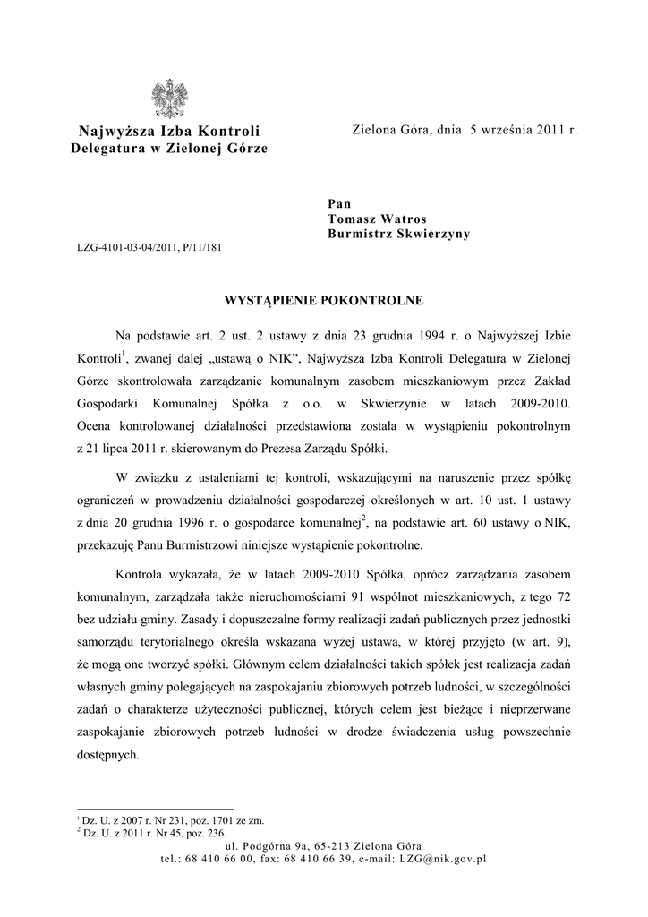 Zielona Góra, dnia 5 września 2011 r. Najwyższa Izba Kontroli Delegatura w Zielonej Górze Pan Tomasz Watros Burmistrz Skwierzyny LZG-4101-03-04/2011, P/11/181 WYSTĄPIENIE POKONTROLNE Na podstawie art. 2 ust. 2 ustawy z dnia 23 grudnia 1994 r. o Najwyższej Izbie Kontroli1, zwanej dalej „ustawą o NIK”, Najwyższa Izba Kontroli Delegatura w Zielonej Górze skontrolowała zarządzanie komunalnym zasobem mieszkaniowym przez Zakład Gospodarki Komunalnej Spółka z o.o. w Skwierzynie w latach 2009-2010. Ocena kontrolowanej działalności przedstawiona została w wystąpieniu pokontrolnym z 21 lipca 2011 r. skierowanym do Prezesa Zarządu Spółki. W związku z ustaleniami tej kontroli, wskazującymi na naruszenie przez spółkę ograniczeń w prowadzeniu działalności gospodarczej określonych w art. 10 ust. 1 ustawy z dnia 20 grudnia 1996 r. o gospodarce komunalnej2, na podstawie art. 60 ustawy o NIK, przekazuję Panu Burmistrzowi niniejsze wystąpienie pokontrolne. Kontrola wykazała, że w latach 2009-2010 Spółka, oprócz zarządzania zasobem komunalnym, zarządzała także nieruchomościami 91 wspólnot mieszkaniowych, z tego 72 bez udziału gminy. Zasady i dopuszczalne formy realizacji zadań publicznych przez jednostki samorządu terytorialnego określa wskazana wyżej ustawa, w której przyjęto (w art. 9), że mogą one tworzyć spółki. Głównym celem działalności takich spółek jest realizacja zadań własnych gminy polegających na zaspokajaniu zbiorowych potrzeb ludności, w szczególności zadań o charakterze użyteczności publicznej, których celem jest bieżące i nieprzerwane zaspokajanie zbiorowych potrzeb ludności w drodze świadczenia usług powszechnie dostępnych. 1 2 Dz. U. z 2007 r. Nr 231, poz. 1701 ze zm. Dz. U. z 2011 r. Nr 45, poz. 236. ul. Podgórna 9a, 65-213 Zielona Góra tel.: 68 410 66 00, fax: 68 410 66 39, e-mail: [email protected] 2 W ocenie NIK, zarządzanie nieruchomościami wspólnot mieszkaniowych nie może być uznane za realizację zadań o charakterze użyteczności publicznej, ponieważ: − nie jest zadaniem wymienionym w art. 7 ust. 1 ustawy z dnia 8 marca 1990 r. o samorządzie gminnym3, − zarządzaniu nieruchomościami wspólnot mieszkaniowych nie można przypisać żadnej z cech zadania o charakterze użyteczności publicznej wymienionych w art. 1 ust. 2 ustawy o gospodarce komunalnej. Nie jest bowiem potrzebą zbiorową, ani powszechną, jak również usługą powszechnie dostępną, gdyż zaspokaja jedynie potrzeby członków wspólnoty mieszkaniowej. Brak jest również podstaw prawnych, aby na żądanie wspólnoty mieszkaniowej gmina (bądź spółka z udziałem gminy) była zobowiązana do zawarcia z nią umowy o zarządzanie nieruchomością wspólną. Wprawdzie gmina może tworzyć spółki prawa handlowego poza sferą użyteczności publicznej i przystępować do nich, ale wyłącznie na zasadach określonych w art. 10 ust. 1-3 ustawy o gospodarce komunalnej. Zdaniem NIK, przepis ten nie ma zastosowania w przypadku działalności polegającej na zarządzaniu nieruchomościami wspólnot mieszkaniowych. Zgodnie bowiem z treścią art. 10 ust. 1 pkt 1 i pkt 2 tej ustawy, poza sferą użyteczności publicznej gmina może tworzyć spółki prawa handlowego i przystępować do nich wyłącznie wtedy, gdy łącznie spełnione zostaną następujące warunki: – istnieją niezaspokojone potrzeby wspólnoty samorządowej na rynku lokalnym, – występujące w gminie bezrobocie w znacznym stopniu wpływa ujemnie na poziom życia wspólnoty samorządowej, a zastosowanie innych działań i wynikających z obowiązujących przepisów środków prawnych nie doprowadziło do aktywizacji gospodarczej, a w szczególności do znacznego ożywienia rynku pracy lub trwałego ograniczenia bezrobocia. Z ustaleń kontroli nie wynika, aby łącznie spełnione zostały ww. przesłanki4. Najwyższa Izba Kontroli dostrzega uwarunkowania i racjonalne przesłanki uzasadniające zarządzanie wspólnotami mieszkaniowymi przez spółki prawa handlowego z udziałem gmin. Zezwolenie na przedmiotową działalność, w jasno i precyzyjnie 3 4 Dz. U. z 2001 r. Nr 142, poz. 1591 ze zm. Z centralnego rejestru zarządców nieruchomości prowadzonego przez Ministerstwo Infrastruktury wynikało m.in., że na terenie na terenie Skwierzyny licencję zawodową w zakresie zarządzania nieruchomościami posiada 6 osób. Wspólnotami mieszkaniowymi z udziałem gminy zarządza m.in. 2 licencjonowanych zarządców ze Skwierzyny (nr licencji 13855 i 1620) oraz jeden podmiot z Gorzowa Wlkp. 3 określonych prawem sytuacjach, odpowiadałoby zasadom pragmatyzmu w zarządzaniu zasobem gminnym, zwłaszcza w przypadku wspólnot z udziałem lokali gminnych. Jednak aktualny stan prawny w tym względzie jest jednoznaczny, a ewentualna zmiana przepisów należy do kompetencji ustawodawcy. Przedstawiając powyższe uwagi, Najwyższa Izba Kontroli wnosi o podjęcie działań, mających na celu dostosowanie zakresu działalności Spółki do ograniczeń wynikających z ustawy o samorządzie gminnym i gospodarce komunalnej. Najwyższa Izba Kontroli Delegatura w Zielonej Górze, stosownie do art. 62 ust. 1 ustawy o NIK, oczekuje od Pana Burmistrza przedstawienia, w terminie 14 dni od dnia otrzymania niniejszego wystąpienia, informacji o sposobie wykorzystania uwag i wykonania wniosku, bądź o podjętych działaniach na rzecz jego realizacji lub przyczynach niepodjęcia takich działań. Stosownie do art. 61 ust. 1 ustawy o NIK, w terminie 7 dni od dnia otrzymania niniejszego wystąpienia pokontrolnego przysługuje Panu Burmistrzowi prawo zgłoszenia na piśmie, do dyrektora Delegatury NIK w Zielonej Górze, umotywowanych zastrzeżeń w sprawie zawartych w tym wystąpieniu ocen, uwag i wniosku. W razie zgłoszenia zastrzeżeń, zgodnie z art. 62 ust. 2 ustawy o NIK, termin nadesłania informacji, o którym mowa wyżej, liczy się od dnia otrzymania ostatecznej uchwały właściwej