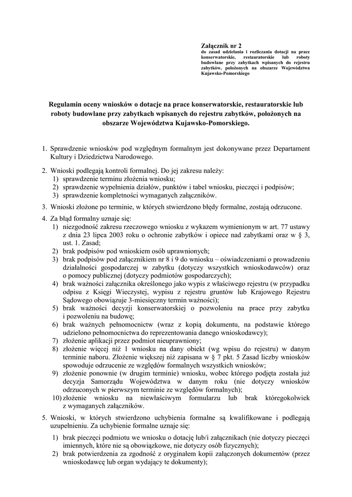 Załącznik nr 2 do zasad udzielania i rozliczania dotacji na prace konserwatorskie, restauratorskie lub roboty budowlane przy zabytkach wpisanych do rejestru zabytków, położonych na obszarze Województwa Kujawsko-Pomorskiego Regulamin oceny wniosków o dotacje na prace konserwatorskie, restauratorskie lub roboty budowlane przy zabytkach wpisanych do rejestru zabytków, położonych na obszarze Województwa Kujawsko-Pomorskiego. 1. Sprawdzenie wniosków pod względnym formalnym jest dokonywane przez Departament Kultury i Dziedzictwa Narodowego. 2. Wnioski podlegają kontroli formalnej. Do jej zakresu należy: 1) sprawdzenie terminu złożenia wniosku; 2) sprawdzenie wypełnienia działów, punktów i tabel wniosku, pieczęci i podpisów; 3) sprawdzenie kompletności wymaganych załączników. 3. Wnioski złożone po terminie, w których stwierdzono błędy formalne, zostają odrzucone. 4. Za błąd formalny uznaje się: 1) niezgodność zakresu rzeczowego wniosku z wykazem wymienionym w art. 77 ustawy z dnia 23 lipca 2003 roku o ochronie zabytków i opiece nad zabytkami oraz w § 3, ust. 1. Zasad; 2) brak podpisów pod wnioskiem osób uprawnionych; 3) brak podpisów pod załącznikiem nr 8 i 9 do wniosku – oświadczeniami o prowadzeniu działalności gospodarczej w zabytku (dotyczy wszystkich wnioskodawców) oraz o pomocy publicznej (dotyczy podmiotów gospodarczych); 4) brak ważności załącznika określonego jako wypis z właściwego rejestru (w przypadku odpisu z Księgi Wieczystej, wypisu z rejestru gruntów lub Krajowego Rejestru Sądowego obowiązuje 3-miesięczny termin ważności); 5) brak ważności decyzji konserwatorskiej o pozwoleniu na prace przy zabytku i pozwoleniu na budowę; 6) brak ważnych pełnomocnictw (wraz z kopią dokumentu, na podstawie którego udzielono pełnomocnictwa do reprezentowania danego wnioskodawcy); 7) złożenie aplikacji przez podmiot nieuprawniony; 8) złożenie więcej niż 1 wniosku na dany obiekt (wg wpisu do rejestru) w danym terminie naboru. Złożenie większej niż zapisana w § 7 pkt. 5 Zasad liczby wniosków spowoduje odrzucenie ze względów formalnych wszystkich wniosków; 9) złożenie ponownie (w drugim terminie) wniosku, wobec którego podjęta została już decyzja Samorządu Województwa w danym roku (nie dotyczy wniosków odrzuconych w pierwszym terminie ze względów formalnych); 10) złożenie wniosku na niewłaściwym formularzu lub brak któregokolwiek z wymaganych załączników. 5. Wnioski, w których stwierdzono uchybienia formalne są kwalifikowane i podlegają uzupełnieniu. Za uchybienie formalne uznaje się: 1) brak pieczęci podmiotu we wniosku o dotację lub/i załącznikach (nie dotyczy pieczęci imiennych, które nie są obowiązkowe, nie dotyczy osób fizycznych); 2) brak potwierdzenia za zgodność z oryginałem kopii załączonych dokumentów (przez wnioskodawcę lub organ wydający te dokumenty); 3) niespójność pomiędzy kalkulacją przewidywanych kosztów (pkt. IV formularza wniosku) a załączonym kosztorysem; harmonogramem planowanych prac lub robót (pkt. V formularza wniosku) a terminami ważności decyzji konserwatorskiej o pozwoleniu na prace i pozwoleniu na budowę. 6. Ocena merytoryczna jest dokonywana przez komisję powołaną przez Zarząd Województwa Kujawsko-Pomorskiego. Podstawą oceny są kryteria zapisane w § 9 ust. 7 Zasad. 7. Do zakresu oceny komisji należy: 1) znaczenie zabytku dla dziedzictwa kulturowego ze szczególnym uwzględnieniem jego wartości historycznej, naukowej lub artystycznej; 2) stan zagrożenia w jakim znajduje się zabytek; 3) dostępność zabytku dla społeczeństwa; 4) zaangażowanie finansowe podmiotu występującego o dotację; 5) pozyskanie środków finansowych z innych źródeł; 6) jakość i terminowość wykonania oraz rozliczenia poprzednio przyznanych dotacji. 8. Komisja dokonuje oceny poszczególnych aplikacji na zasadzie konsensusu. 9. Na podstawie oceny merytorycznej, komisja ustala ranking wniosków, który przedkłada Zarządowi Województwa. 10. Maksymalne wagi poszczególnych kryteriów oceny określa poniższa tabela. Charakterystyka kryterium maksymalna punktacja 1.Znaczenie zabytku dla dziedzictwa kulturowego ze szczególnym uwzględnieniem jego wartości historycznej, naukowej lub artystycznej 1) indywidualny wpis zabytku na listę Pomników Historii 2) obiekt znajduje się na obszarze uznanym za Pomnik Historii 3) znaczenie zabytku dla regionu 6 4 3 2. Stan zagrożenia w jakim znajduje się zabytek 1) konieczność przeprowadzenia prac wynikająca ze stanu zachowania zabytku 0-25 3. Dostępność zabytku dla społeczeństwa 1) dostępny bez ograniczeń 2) dostępny w ograniczonym zakresie lub okazjonalnie 3) dostępny wyłącznie z zewnątrz 6 3 1 4) niedostępny 0 4. Zaangażowanie finansowe podmiotu występującego o dotację 1) wkład własny od 70,01% i więcej wartości kosztorysowej zadania 2) wkład własny od 65,01% do 70.00% wartości kosztorysowej zadania 3) wkład własny od 60,01% do 65,00% wartości kosztorysowej zadania 4) wkład własny od 55,01% do 60,00% wartości kosztorysowej zadania 10 9 8 7 5) wkład własny od 50,01% do 55,00% wartości kosztorysowej zadania 6) wkład własny od 42,01% do 50,00% wartości kosztorysowej zadania 7) wkład własny od 33.01% do 42,00% wartości kosztorysowej zadania 8) wkład własny od 25,01% do 33,00% wartości kosztorysowej zadania 9) wkład własny od 15,01% do 25,00% wartości kosztorysowej zadania 10) wkład własny od 0,01% do 15,00% wartości kosztorysowej zadania 11) brak wkładu własnego (wniosek o 100% dotacji) 6 5 4 3 2 1 0 5. Pozyskanie środków finansowych z innych źródeł 1) kontynuacja prac nie finansowanych wcześniej z dotacji samorządu województwa 5 6. Jakość i terminowość wykonania oraz rozliczenia poprzednio przyznanych dotacji* 1) prawidłowe i terminowe wykonanie i rozliczenie zadania 2) rezygnacja, niepełne lub nieterminowe wykonanie lub rozliczenia zada