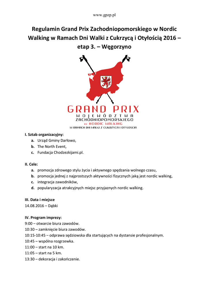 www.gpzp.pl Regulamin Grand Prix Zachodniopomorskiego w Nordic Walking w Ramach Dni Walki z Cukrzycą i Otyłością 2016 – etap 3. – Węgorzyno I. Sztab organizacyjny: a. Urząd Gminy Darłowo, b. The North Event, c. Fundacja Chodzezkijami.pl. II. Cele: a. promocja zdrowego stylu życia i aktywnego spędzania wolnego czasu, b. promocja jednej z najprostszych aktywności fizycznych jaką jest nordic walking, c. integracja zawodników, d. popularyzacja atrakcyjnych miejsc przyjaznych nordic walking. III. Data i miejsce 14.08.2016 – Dąbki IV. Program imprezy: 9:00 – otwarcie biura zawodów. 10:30 – zamknięcie biura zawodów. 10:15-10:45 – odprawa sędziowska dla startujących na dystansie profesjonalnym. 10:45 – wspólna rozgrzewka. 11:00 – start na 10 km. 11:05 – start na 5 km. 13:30 – dekoracja i zakończenie. www.gpzp.pl V. Dystanse: krótszy – około 5 km, profesjonalny – około 10 km. VI. Kategorie wiekowe Na dystansie około 5 km: do 9 lat, 10 – 12 lat, 13 – 15 lat, 16 – 29 lat, 30 – 39 lat 40 – 49 lat, 50 – 59 lat, 60 – 69 lat, 70 lat i starsi. Na dystansie profesjonalnym około 10 km: 16 – 39 lat, 40 – 49 lat, 50 – 59 lat, 60 lat i starsi. VII. Kategoria OPEN Kategoria OPEN dotyczy trzech najlepszych zawodników i zawodniczek dystansu profesjonalnego. Kobiety i mężczyźni są klasyfikowani osobno. Miejsca na podium w kategorii OPEN przysługują tylko zawodnikom, którzy nie otrzymali żadnego ostrzeżenia na trasie. VIII. Kategoria osób niepełnosprawnych a. W kategorii osób niepełnosprawnych może startować każdy zawodnik z aktualnym orzeczeniem o niepełnosprawności. b. Nagradzani są: trzy najlepsze niepełnosprawne kobiety i trzech najlepszych niepełnosprawnych mężczyzn dystansu krótszego – około 5 km. c. Zadeklarowanie startu w kategorii niepełnosprawnych wyklucza uczestnika w klasyfikacji w kategorii wiekowej. IX. Rejestracja i opłaty a. Zapisy na imprezę odbywają się za pośrednictwem serwisu elektronicznezapisy.pl. b. Opłaty pobierane są za pośrednictwem systemu DotPay, formularz wpłaty wyświetla się po dokonaniu zapisów on-line. c. Istnieje możliwość dopisania się do listy startowej w biurze zawodów. d. Opłaty startowe to: www.gpzp.pl Kategoria powyżej 18 lat niepełnosprawni do 18 lat Opłata do czwartku poprzedzającego imprezę 30 15 0 Opłata w biurze zawodów 40 25 0 e. Pierwszych zapisanych elektronicznie 100 mieszkańców gminy Darłowo jest zwolnionych z opłaty startowej. f. Raz uiszczona opłata nie podlega zwrotowi, ani przeniesieniu na poczet startu w innej imprezie cyklu. X. Nagrody Każdy zawodnik na linii mety otrzyma pamiątkową monetę okolicznościową. Troje najlepszych zawodników w swoich kategoriach wiekowych otrzyma puchary. Troje najlepszych zawodników na dystansie profesjonalnym w klasyfikacji OPEN otrzyma puchary. XI. Trasa a. Organizator zobowiązany jest do wyznaczenia dwóch dystansów na trasie zawodów, istnieje przy tym możliwość utworzenia dwóch lub więcej okrążeń. b. Trasa jest wyraźnie oznakowana, aby ułatwić poruszanie się po niej, dopuszczalny jest każdy sposób oznakowania, zwłaszcza taśma techniczna. c. Na trasie ustawione są tabliczki z informacjami o przebytych kilometrach, jest to oznakowanie orientacyjne i może różnić się od właściwego przebytego dystansu. d. Na trasie znajdować będą się punkty odświeżania z wodą niegazowaną podawaną do rąk zawodników. e. Długość trasy liczona jest po najkrótszej linii jaką może pokonać zawodnik. f. Dopuszcza się możliwość niedużego błędu w pomiarze. g. Start i meta oznaczone będą bramami/bramą startową. h. W okolicach startu i mety będą znajdować się punkty z wodą. XII. Pomiar czasu a. Czas zawodników mierzony jest elektronicznie za pomocą chipów umieszczonych przy bucie zawodnika. b. Czas zawodników mierzony jest brutto, co oznacza, że start każdej kategorii wiekowej liczony jest oddzielnie. Przy małej liczbie osób dopuszcza się łączenie kategorii podczas startu. c. Rejestrowany jest czas każdego zawodnik kończącego swój dystans, tam gdzie to możliwe rejestrowane są również międzyczasy. www.gpzp.pl XIII. Bezpieczeństwo a. Nad bezpieczeństwem zawodników czuwa służba medyczna i wykwalifikowana służba techniczna. b. Organizator zapewnia bezpieczeństwo na trasie i zamknięcie ruchu kołowego na odcinku zawodów. c. Na polecenie służb medycznych zawodnik musi niezwłocznie zejść z trasy. XIV. Zasady sędziowania Sędziowaniem na tej imprezie zajmuje się Kolegium Sędziów Fundacji Chodzezkijami.pl Zasady dotyczące poprawności techniki nordic walking, przyznawania kar, protestów, opuszczania trasy zawodów, numerów startowych, doboru odpowiedniego sprzętu czy ubioru znajdują się w regulaminie Kolegium Sędziów Fundacji Chodzezkijami.pl http://chodzezkijami.pl/sedziowie-fundacji-chodzezkijami-pl XV. Patroni medialni a. Chodzezkijami.pl b. Radio Koszalin c. TVP Szczecin XV. Postanowienia końcowe a. Przekazanie do Organizatora, prawidłowo wypełnionego i podpisanego formularza zgłoszeniowego oznacza wyrażenie zgody przez uczestnika imprezy na wykorzystanie podanych przez niego danych osobowych na potrzeby przesłania do uczestnika informacji o przyszłych imprezach, produktach handlowych, a także na wewnętrzne potrzeby administracyjne i analityczne, zgodnie z ustawą o ochronie danych osobowych z dnia 29 sierpnia 1997 r., Dz. U. nr 33, poza 883. Uczestnikowi przysługuje prawo do wycofania takiej zgody i może to zrobić w dowolnym momencie kierując korespondencję na adres Organizatora. b. Organizator nie wykupuje ubezpieczenia NNW, uczestnicy muszą posiadać je we własnym zakresie. c. W biurze zawodów będzie istniała możliwość wypożyczenia profesjonalnych kijów nordic walking. Przy wypożyczeniu może być pobierana opłata lub kaucja. d. Punkty zdobyte na jednym dystansie nie przechodzą na drugi. e. Uczest