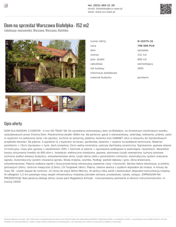 tel. (022) 404 21 20 email: [email protected] www: www.scn.waw.pl Dom na sprzedaż Warszawa Białołęka - 152 m2 Lokalizacja: mazowieckie, Warszawa, Warszawa, Białołęka numer oferty D-10375-16 cena 798 000 PLN dom sprzedaż, metraż 152 m2 pow. działki 856 m2 zabudowa wolnostojący rok budowy 2005 informacje dodatkowe materiał budynku poroterm Opis oferty DOM DLA RODZINY Z DZIEĆMI - 4 min DO TRASY S8! Do sprzedania wolnostojący dom na Białołęce, na strzeżonym zamkniętym osiedlu, wybudowanych przez Victoria Dom. Powierzchnia działki: 856m kw. Na parterze: garaż 1-stanowiskowy, wiatrołap, kotłownia, pralnia, salon (z wyjściem na zadaszony taras i do ogrodu), kuchnia ze spiżarnią, jadalnia, łazienka oraz GABINET (atut w stosunku do standardowych projektów domów). Na piętrze: 3 sypialnie (2 z wyjściem na taras), garderoba, łazienka + wyjście na poddasze techniczne. Materiał: porotherm + 15cm styropianu + tynk, dach ocieplony 15cm wełną mineralną i pokryty dachówką ceramiczną. Ogrzewanie: gazowe własne (2-funkcyjny, nowy piec gazowy z zasobnikiem (50l) + kominek w salonie + ogrzewanie podłogowe w wiatrołapie i łazienkach. Niewielkie koszty utrzymania (media) ok 600 zł/m-c. Instalacje: elektryczna miedziana, gazowa, alarmowa (czujki zewnętrzne, kurtyny pionowe (ochrona wzdłuż elewacji budynku), antywłamaniowe okna, czujki zbicia szkła z parametrem ciśnienia). Automatyczny system zraszania ogrodu. Automatyczny system zraszania ogrodu. Woda miejska, szambo. Podłogi: parkiet dębowy i gres. Okna drewniane, antywłamaniowe. Pięknie zadbany ogród z dużą przestrzenią rekreacyjną zapewnia ciszę i intymność. Bardzo dobra lokalizacja, w pobliżu gimnazjum (2km), centrum medyczne (3,5km), CH Targówek (4km). Piękna, zielona okolica z szybkim dojazdem do miasta. 4 minuty do trasy S8 - szybki dojazd do centrum. 15 minut do stacji Metro Młociny. W okolicy kilka szkół z doskonałym dojazdem komunikacją miejską. W odległości 1,5 km powstaje nowy zespól infrastruktury miejskiej (ośrodek zdrowia, przedszkole, szkoła, sklepy). ZAPRASZAM NA PREZENTACJĘ! Nad jakością obsługi oferty czuwa pani Magdalena Armijak - licencjonowany pośrednik w obrocie nieruchomościami, nr licencji 19420 Zawsze dążymy do tego, aby informacje o proponowanych przez nas ofertach były jak najbardziej dokładne. Niekiedy jednak, ze względu na fakt, iż uzyskujemy je od osób trzecich nie jest możliwe ich zweryfikowanie, wobec czego należy traktować je orientacyjnie i nie stanowią one oferty w rozumieniu kodeksu cywilnego. tel. (022) 404 21 20 email: [email protected] www: www.scn.waw.pl Lokalizacja Osoba kontaktowa Agnieszka Bartoszewska województwo mazowieckie powiat Warszawa [email protected] miasto Warszawa dzielnica Białołęka Chętnie udzielę dodatkowych informacji związanych z tą ofertą. Zapraszam do kontaktu! tel. 508561895 Zawsze dążymy do tego, aby informacje o proponowanych przez nas ofertach były jak najbardziej dokładne. Niekiedy jednak, ze względu na fakt, iż uzyskujemy je od osób trzecich nie jest możliwe ich zweryfikowanie, wobec czego należy traktować je orientacyjnie i nie stanowią one oferty w rozumieniu kodeksu cywilnego.