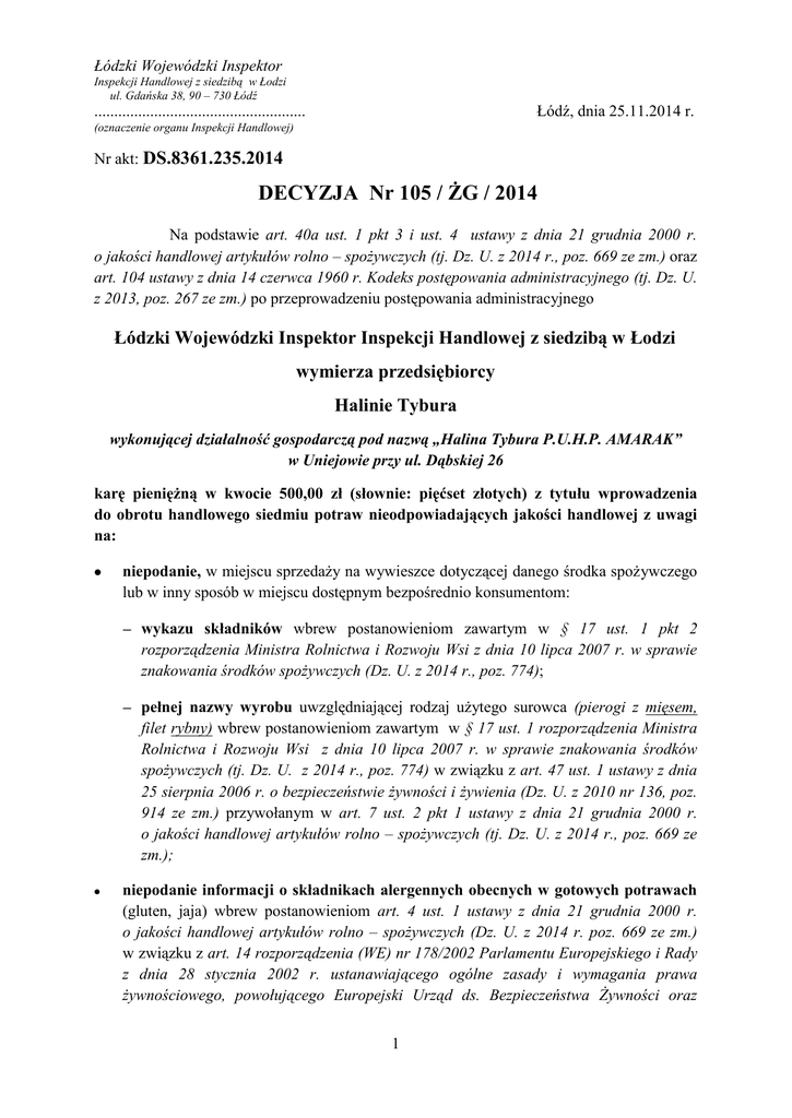 Łódzki Wojewódzki Inspektor Inspekcji Handlowej z siedzibą w Łodzi ul. Gdańska 38, 90 – 730 Łódź Łódź, dnia 25.11.2014 r. ..................................................... (oznaczenie organu Inspekcji Handlowej) Nr akt: DS.8361.235.2014 DECYZJA Nr 105 / ŻG / 2014 Na podstawie art. 40a ust. 1 pkt 3 i ust. 4 ustawy z dnia 21 grudnia 2000 r. o jakości handlowej artykułów rolno – spożywczych (tj. Dz. U. z 2014 r., poz. 669 ze zm.) oraz art. 104 ustawy z dnia 14 czerwca 1960 r. Kodeks postępowania administracyjnego (tj. Dz. U. z 2013, poz. 267 ze zm.) po przeprowadzeniu postępowania administracyjnego Łódzki Wojewódzki Inspektor Inspekcji Handlowej z siedzibą w Łodzi wymierza przedsiębiorcy Halinie Tybura wykonującej działalność gospodarczą pod nazwą „Halina Tybura P.U.H.P. AMARAK” w Uniejowie przy ul. Dąbskiej 26 karę pieniężną w kwocie 500,00 zł (słownie: pięćset złotych) z tytułu wprowadzenia do obrotu handlowego siedmiu potraw nieodpowiadających jakości handlowej z uwagi na: niepodanie, w miejscu sprzedaży na wywieszce dotyczącej danego środka spożywczego lub w inny sposób w miejscu dostępnym bezpośrednio konsumentom: wykazu składników wbrew postanowieniom zawartym w § 17 ust. 1 pkt 2 rozporządzenia Ministra Rolnictwa i Rozwoju Wsi z dnia 10 lipca 2007 r. w sprawie znakowania środków spożywczych (Dz. U. z 2014 r., poz. 774); pełnej nazwy wyrobu uwzględniającej rodzaj użytego surowca (pierogi z mięsem, filet rybny) wbrew postanowieniom zawartym w § 17 ust. 1 rozporządzenia Ministra Rolnictwa i Rozwoju Wsi z dnia 10 lipca 2007 r. w sprawie znakowania środków spożywczych (tj. Dz. U. z 2014 r., poz. 774) w związku z art. 47 ust. 1 ustawy z dnia 25 sierpnia 2006 r. o bezpieczeństwie żywności i żywienia (Dz. U. z 2010 nr 136, poz. 914 ze zm.) przywołanym w art. 7 ust. 2 pkt 1 ustawy z dnia 21 grudnia 2000 r. o jakości handlowej artykułów rolno – spożywczych (tj. Dz. U. z 2014 r., poz. 669 ze zm.); niepodanie informacji o składnikach alergennych obecnych w gotowych potrawach (gluten, jaja) wbrew postanowieniom art. 4 ust. 1 ustawy z dnia 21 grudnia 2000 r. o jakości handlowej artykułów rolno – spożywczych (Dz. U. z 2014 r. poz. 669 ze zm.) w związku z art. 14 rozporządzenia (WE) nr 178/2002 Parlamentu Europejskiego i Rady z dnia 28 stycznia 2002 r. ustanawiającego ogólne zasady i wymagania prawa żywnościowego, powołującego Europejski Urząd ds. Bezpieczeństwa Żywności oraz 1 ustanawiającego procedury w zakresie bezpieczeństwa żywności (Dz. U. L 31 z 01.02.2002 r. s. 1 ze zm.). Uzasadnienie W dniach od 11 do 13 sierpnia 2014 r. na podstawie upoważnienia Łódzkiego Wojewódzkiego Inspektora Inspekcji Handlowej numer DS.8361.235.2014 z dnia 11 sierpnia 2014 r. inspektorzy Wojewódzkiego Inspektoratu Inspekcji Handlowej w Łodzi przeprowadzili kontrolę w restauracji „Gospoda pod Brzozami” zlokalizowanej w Uniejowie przy ul. Dąbskiej 26, należącej do Haliny Tybura, wykonującej działalność gospodarczą pod nazwą „Halina Tybura P.U.H.P. AMARAK”. Kontrolę przeprowadzono na podstawie przepisów art. 3 ust. 1 - 3 rozporządzenia Parlamentu Europejskiego i Rady (WE) Nr 882/2004 z dnia 29 kwietnia 2004 r. w sprawie kontroli urzędowych przeprowadzanych w celu sprawdzenia zgodności z prawem paszowym i żywnościowym oraz regułami dotyczącymi zdrowia zwierząt i dobrostanu zwierząt (Dz. U. L 165 z 30.4.2004 ze zm.), art. 17 ust. 3 ustawy z dnia 21 grudnia 2000 r. o jakości handlowej artykułów rolno-spożywczych (tj. Dz. U. z 2014 r., poz. 669), art. 24 ust. 1 rozporządzenia Parlamentu Europejskiego i Rady (WE) nr 1935/2004 z dnia 27 października 2004 r. w sprawie materiałów i wyrobów przeznaczonych do kontaktu z żywnością oraz uchylającego dyrektywy 80/590/EWG (Dz. U. z 27.10.2004 s. 4 ze zm.), art. 3 ust. 1 pkt 1,2 i 6 ustawy z dnia 15 grudnia 2000 r. o Inspekcji Handlowej (tj. Dz. U. z 2014 r., poz. 148) w obecności przedsiębiorcy Haliny Tybura. W toku czynności kontrolnych sprawdzono prawidłowość oznakowania oraz rzetelność przekazywanych informacji o sprzedawanych potrawach. Stwierdzono, że w miejscu sprzedaży, na wywieszce dotyczącej danego środka spożywczego lub w inny sposób w miejscu dostępnym bezpośrednio konsumentom, dla 7 potraw deklarowanych w miejscu sprzedaży (karty menu) jako „placek węgierski 1 szt. w cenie 14 zł”, „świeżonka 100g w cenie 5 zł”, „spaghetti a’ la bolognese 500g w cenie 16 zł”, „zestaw surówek 150g w cenie 4 zł”, „warzywa gotowane 200g w cenie 5,50 zł”, „domowe pierogi z mięsem 8 szt. w cenie 11 zł”, „filet rybny 120g w cenie 9 zł” nie podano wykazu składników wbrew postanowieniom § 17 ust. 1 pkt 2 rozporządzenia Ministra Rolnictwa i Rozwoju Wsi z dnia 10 lipca 2007 r. w sprawie znakowania środków spożywczych (tj. Dz. U. z 2014 r., poz. 774) zwanego dalej „rozporządzeniem w sprawie znakowania środków spożywczych”. Ponadto dla domowych pierogów z mięsem i fileta rybnego nie podano rodzaju użytego surowca mięsnego (mięso wieprzowe, wołowe, drobiowe) i rybnego (np. miruna). Podanie w miejscu sprzedaży niepełnej nazwy potrawy narusza postanowienia § 17 ust. 1 rozporządzenia w sprawie znakowania środków spożywczych w związku z art. 47 ust. 1 ustawy z dnia 25 sierpnia 2006r. o bezpieczeństwie żywności i żywienia (Dz. U. z 2010 nr 136, poz. 914 ze zm.) zwanej dalej „ustawą o bezpieczeństwie żywności i żywienia” przywołanym w art. 7 ust. 2 pkt 1 ustawy z dnia 21 grudnia 2000 r. o jakości handlowej artykułów rolno – spożywczych (tj. Dz. U. z 2014 r., poz. 669 ze zm.) zwanej dalej „ustawą o jakości”, gdyż podane nazwy uniemożliwiały (bez podjęcia dodatkowych działań) konsumentowi rozpoznanie rodzaju i właściwości środka spożywczego. Do produkcji zakwestionowanych potraw zgodnie z oświadczeniem kontrolowanego przedsięb