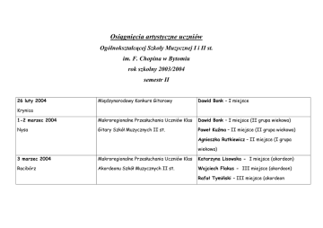 Osiągnięcia artystyczne uczniów Ogólnokształcącej Szkoły Muzycznej I i II st. im. F. Chopina w Bytomiu rok szkolny 2003/2004 semestr II 26 luty 2004 Międzynarodowy Konkurs Gitarowy Dawid Bonk – I miejsce 1-2 marzec 2004 Makroregionalne Przesłuchania Uczniów Klas Dawid Bonk – I miejsce (II grupa wiekowa) Nysa Gitary Szkół Muzycznych II st. Paweł Kuźma – II miejsce (II grupa wiekowa) Krynica Agnieszka Rutkiewicz – II miejsce (I grupa wiekowa) 3 marzec 2004 Makroregionalne Przesłuchania Uczniów Klas Katarzyna Lisowska - I miejsce (akordeon) Racibórz Akordeonu Szkół Muzycznych II st. Wojciech Flakus - III miejsce (akordeon) Rafał Tymiński – III miejsce (akordeon 4-6 marzec 2004 Ogólnopolskie przesłuchania Uczniów Klas Ewa Mizerska – II miejsce (flet) Chorzów Instrumentów Dętych Drewnianych Szkół Aleksander Niemiec – I miejsce (obój) Muzycznych II st. Barbara Sitek – II miejsce (obój) 4-7 marzec 2004 Ogólnopolskie Przesłuchania Uczniów Klas Kamila Druzd – I miejsce (altówka) Warszawa Skrzypiec i Altówki Paweł Maślanka – wyróŜnienie (skrzypce) Szkół Muzycznych II st. 11-12 marzec 2004 Makroregionalne Przesłuchania Uczniów Klas Aleksander Zalweski – I miejsce (trąbka) Chorzów Instrumentów Dętych Blaszanych Szkół Grzegorz Nowara - I miejsce (tuba) Muzycznych II st. Mateusz Sczendzina – II miejsce (puzon) 19-21 marzec 2004 Ogólnopolskie Przesłuchania Uczniów Klas Dawid Bonk - I miejsce Inowrocław Gitary Szkół Muzycznych II st. Paweł Kuźma – II miejsce 18-20 marzec 2004 Ogólnopolskie Przesłuchania Uczniów Klas Katarzyna Lisowska - II miejsce (akordeon) Gdańsk Akordeonu Szkół Muzycznych II st. 22-27 marzec 2004 XVII Międzynarodowy Konkurs Pianistyczny Łukasz Mazanek - I miejsce(fortepian) Gorzów Wklp. im. J.S. Bacha Anna Walczak – III miejsce (fortepian) kwiecień 2004 Program Stypendialny „Młoda Polska” Dawid Bonk laureat Programu Stypendialnego Warszawa Ministra Kultury Rzeczpospolitej Polskiej „Młoda Polska” 1-3 kwiecień 2004 Ogólnopolskie Przesłuchania Uczniów Klas Grzegorz Nowara – I miejsce (tuba) Katowice Instrumentów Dętych Blaszanych Szkół Aleksander Zalewski – II miejsce (trąbka) Muzycznych II st. Mateusz Sczendzina – II miejsce (puzon) 3-4 kwiecień 2004 VIII Spotkania Najmłodszych wyróŜnienie – Monika Hartmann, Aleksandra Kłodzko Wiolonczelistów Mankiewicz, Angelika Garus 6 kwiecień 2004 Regionalne Przesłuchania Zespołów kwartet kontrabasowy – VI miejsce Cieszyn Kameralnych Szkół Muzycznych I st. 20 kwiecień 2004 IX Festiwal Orkiestr I miejsce – Orkiestra Smyczkowa Będzin Szkół Muzycznych I st. oraz dyplom dla najlepszego dyrygenta (p. Adam Wesołowski) 8 maj 2004 Regionalne Przesłuchanie Smyczkowych II miejsce – Kwartet smyczkowy w składzie: Ewa Chorzów Zespołów Kameralnych Szkół Muzycznych Wacławczyk, Natalia Dyla, Marta Król, Barbara II st. Bula XXXI Konkurs Młodego Muzyka wyróŜnienie – Patrycja Korniluk (obój) 11-15 maj 2004 Szczecinek wyróŜnienie – Martyna Majda (flet) II miejsce – Barbara Sitek (obój) 20-22 maj 2004 Konin XIII Ogólnopolski Konkurs Pianistyczny wyróŜnienie - Michalina KałuŜny 22 maj 2004 XV Międzywojewódzki Przegląd Gitarowy Tychy Szkół Muzycznych I st. 27-30 maj 2004 Międzynarodowy Festiwal Muzyki Gitarowej Rewal wyróŜnienie – Jakub Szeja III miejsce – Jakub Szeja, Stanisław Hajda – duetu gitarowy III miejsce – Jakub Szeja 9 czerwiec 2004 Regionalne Przesłuchania Dętych Zespołów III miejsce – Zespół kameralny w składzie: Kamila Bytom Kameralnych II st. Klimek (sopran) , Maria Ledwig (mezzosopran), Nina śuk (flet), Monika Koźluk (obój), Anna CzyŜ (klarnet), Paulina Król (klarnet), Anna Starostka (fagot) II miejsce – Kwintet dęty w składzie: Aleksander Zalewski (I trąbka), Tomasz Zioła (II trąbka), Daria Gabler (waltornia), Mateusz Sczendzina (puzon), Grzegorz Nowara (tuba)