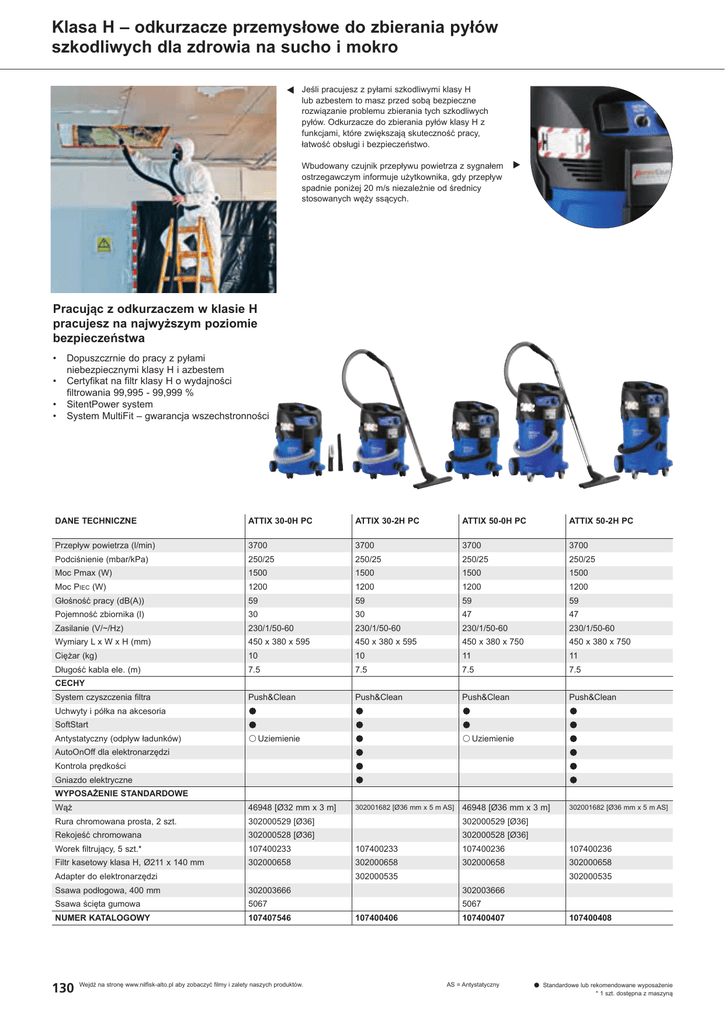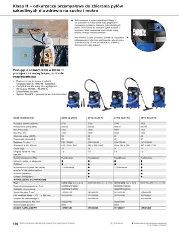 Klasa H – odkurzacze przemysłowe do zbierania pyłów szkodliwych dla zdrowia na sucho i mokro ◀ Jeśli pracujesz z pyłami szkodliwymi klasy H lub azbestem to masz przed sobą bezpieczne rozwiązanie problemu zbierania tych szkodliwych pyłów. Odkurzacze do zbierania pyłów klasy H z funkcjami, które zwiększają skuteczność pracy, łatwość obsługi i bezpieczeństwo. Wbudowany czujnik przepływu powietrza z sygnałem ostrzegawczym informuje użytkownika, gdy przepływ spadnie poniżej 20 m/s niezależnie od średnicy stosowanych węży ssących. ◀ Pracując z odkurzaczem w klasie H pracujesz na najwyższym poziomie bezpieczeństwa • Dopuszczrnie do pracy z pyłami niebezpiecznymi klasy H i azbestem • Certyfikat na filtr klasy H o wydajności filtrowania 99,995 - 99,999 % • SitentPower system • System MultiFit – gwarancja wszechstronności DANE TECHNICZNE ATTIX 30-0H PC ATTIX 30-2H PC ATTIX 50-0H PC ATTIX 50-2H PC Przepływ powietrza (l/min) 3700 3700 3700 3700 Podciśnienie (mbar/kPa) 250/25 250/25 250/25 250/25 1500 Moc Pmax (W) 1500 1500 1500 Moc PIEC (W) 1200 1200 1200 1200 Głośność pracy (dB(A)) 59 59 59 59 Pojemność zbiornika (l) 30 30 47 47 Zasilanie (V/~/Hz) 230/1/50-60 230/1/50-60 230/1/50-60 230/1/50-60 Wymiary L x W x H (mm) 450 x 380 x 595 450 x 380 x 595 450 x 380 x 750 450 x 380 x 750 Ciężar (kg) 10 10 11 11 Długość kabla ele. (m) 7.5 7.5 7.5 7.5 Cechy System czyszczenia filtra Push&Clean Push&Clean Push&Clean Push&Clean Uchwyty i półka na akcesoria • • • • SoftStart • • • • Antystatyczny (odpływ ładunków) ○ Uziemienie • ○ Uziemienie • AutoOnOff dla elektronarzędzi • • Kontrola prędkości • • Gniazdo elektryczne • • WYPOSAŻENIE STANDARDOWE 46948 [Ø36 mm x 3 m] Wąż 46948 [Ø32 mm x 3 m] Rura chromowana prosta, 2 szt. 302000529 [Ø36] Rekojeść chromowana 302000528 [Ø36] Worek filtrujący, 5 szt.* 107400233 107400233 107400236 107400236 Filtr kasetowy klasa H, Ø211 x 140 mm 302000658 302000658 302000658 302000658 Adapter do elektronarzędzi 302003666 Ssawa ścięta gumowa 5067 NUMER KATALOGOWY 107407546 Wejdź na stronę www.nilfisk-alto.pl aby zobaczyć filmy i zalety naszych produktów. 302001682 [Ø36 mm x 5 m AS] 302000529 [Ø36] 302000528 [Ø36] 302000535 Ssawa podłogowa, 400 mm 130 302001682 [Ø36 mm x 5 m AS] 302000535 302003666 5067 107400406 107400407 AS = Antystatyczny 107400408 ● Standardowe lub rekomendowane wyposażenie * 1 szt. dostępna z maszyną