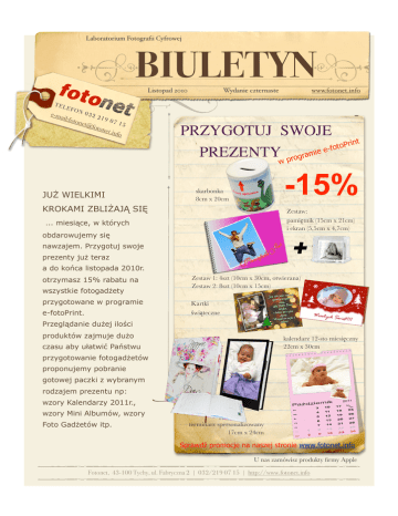 Laboratorium Fotografii Cyfrowej BIULETYN Listopad 2010 TEL Wydanie czternaste www.fotonet.info EFO N0 e-ma 32 2 19 0 il:fot onet 7 15 @fo tone t.info PRZYGOTUJ SWOJE t oPrin t o f PREZENTY programie e w JUŻ WIELKIMI -15% skarbonka 8cm x 20cm KROKAMI ZBLIŻAJĄ SIĘ Zestaw: pamiętnik (15cm x 21cm) i ekran (5,5cm x 4,7cm) ... miesiące, w których obdarowujemy się nawzajem. Przygotuj swoje prezenty już teraz a do końca listopada 2010r. otrzymasz 15% rabatu na wszystkie fotogadżety przygotowane w programie e-fotoPrint. Zestaw 1: 4szt (10cm x 30cm, otwierana) Zestaw 2: 8szt (10cm x 15cm) Kartki świąteczne Przeglądanie dużej ilości produktów zajmuje dużo kalendarz 12-sto miesięczny 22cm x 30cm czasu aby ułatwić Państwu przygotowanie fotogadżetów proponujemy pobranie gotowej paczki z wybranym rodzajem prezentu np: wzory Kalendarzy 2011r., wzory Mini Albumów, wzory Foto Gadżetów itp. terminarz spersonalizowany 17cm x 24cm Sprawdź promocje na naszej stronie www.fotonet.info U nas zamówisz produkty firmy Apple Fotonet, 43-100 Tychy, ul. Fabryczna 2 | 032/219 07 15 | http://www.fotonet.info ! Kalendarze STRONA 2 Na rok 2011 przygotowaliśmy nowy, większy wybór kalendarzy. Oferujemy: Kalendarze 1-kartkowe w formacie: A3 i A4 Kalendarze portfelowe w formacie: 5x9 cm 32x45 cm 14x31 cm 24,5x44 cm 22x30 cm - Kalendarze wiszące, 12-kartkowe, spiralowane, w formacie: - 24,5x44 cm (składany) 32x45 cm 22x30 cm 14x31 cm Fotonet, 43-100 Tychy, ul. Fabryczna 2 | 032/219 07 15 | http://www.fotonet.info ! STRONA 3 Kalendarze stojące spiralowane w formacie: 10x26 cm Kalendarze stojące, 12 miesięcy do odrywania w formacie: 10x26 cm Terminarze z okładką spersonalizowaną, w formacie: 17x24 cm Pobierz paczkę dla programu e-fotoPrint z gotowymi, nowymi wzorami szablonów kalendarzy na 2011 rok do pobrania TUTAJ >> Wszystkie produkty dostępne w programie e-fotoPrint na stronie www.fotonet.info Projekty wykonaj w darmowym programie e-fotoPrint. Oferta ważna do końca listopada 2010r. Rabaty uwzględniane przy wycenie zamówienia Fotonet, 43-100 Tychy, ul. Fabryczna 2 | 032/219 07 15 | http://www.fotonet.info