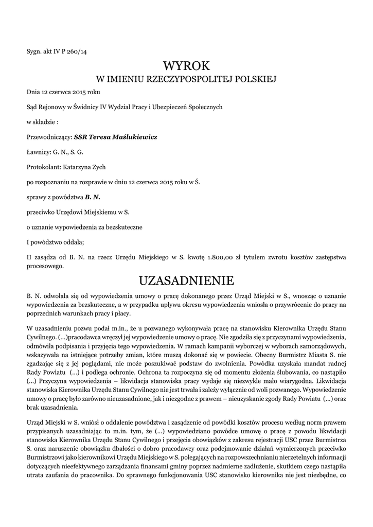 Sygn. akt IV P 260/14 WYROK W IMIENIU RZECZYPOSPOLITEJ POLSKIEJ Dnia 12 czerwca 2015 roku Sąd Rejonowy w Świdnicy IV Wydział Pracy i Ubezpieczeń Społecznych w składzie : Przewodniczący: SSR Teresa Maślukiewicz Ławnicy: G. N., S. G. Protokolant: Katarzyna Zych po rozpoznaniu na rozprawie w dniu 12 czerwca 2015 roku w Ś. sprawy z powództwa B. N. przeciwko Urzędowi Miejskiemu w S. o uznanie wypowiedzenia za bezskuteczne I powództwo oddala; II zasądza od B. N. na rzecz Urzędu Miejskiego w S. kwotę 1.800,00 zł tytułem zwrotu kosztów zastępstwa procesowego. UZASADNIENIE B. N. odwołała się od wypowiedzenia umowy o pracę dokonanego przez Urząd Miejski w S., wnosząc o uznanie wypowiedzenia za bezskuteczne, a w przypadku upływu okresu wypowiedzenia wniosła o przywrócenie do pracy na poprzednich warunkach pracy i płacy. W uzasadnieniu pozwu podał m.in., że u pozwanego wykonywała pracę na stanowisku Kierownika Urzędu Stanu Cywilnego. (...)pracodawca wręczył jej wypowiedzenie umowy o pracę. Nie zgodziła się z przyczynami wypowiedzenia, odmówiła podpisania i przyjęcia tego wypowiedzenia. W ramach kampanii wyborczej w wyborach samorządowych, wskazywała na istniejące potrzeby zmian, które muszą dokonać się w powiecie. Obecny Burmistrz Miasta S. nie zgadzając się z jej poglądami, nie może poszukiwać podstaw do zwolnienia. Powódka uzyskała mandat radnej Rady Powiatu (...) i podlega ochronie. Ochrona ta rozpoczyna się od momentu złożenia ślubowania, co nastąpiło (...) Przyczyna wypowiedzenia – likwidacja stanowiska pracy wydaje się niezwykle mało wiarygodna. Likwidacja stanowiska Kierownika Urzędu Stanu Cywilnego nie jest trwała i zależy wyłącznie od woli pozwanego. Wypowiedzenie umowy o pracę było zarówno nieuzasadnione, jak i niezgodne z prawem – nieuzyskanie zgody Rady Powiatu (...) oraz brak uzasadnienia. Urząd Miejski w S. wniósł o oddalenie powództwa i zasądzenie od powódki kosztów procesu według norm prawem przypisanych uzasadniając to m.in. tym, że (...) wypowiedziano powódce umowę o pracę z powodu likwidacji stanowiska Kierownika Urzędu Stanu Cywilnego i przejęcia obowiązków z zakresu rejestracji USC przez Burmistrza S. oraz naruszenie obowiązku dbałości o dobro pracodawcy oraz podejmowanie działań wymierzonych przeciwko Burmistrzowi jako kierownikowi Urzędu Miejskiego w S. polegających na rozpowszechnianiu nierzetelnych informacji dotyczących nieefektywnego zarządzania finansami gminy poprzez nadmierne zadłużenie, skutkiem czego nastąpiła utrata zaufania do pracownika. Do sprawnego funkcjonowania USC stanowisko kierownika nie jest niezbędne, co dowodzi okoliczność, że powódka praktycznie od (...) była nieobecna w pracy a Urząd ten wykonywał swoje zadania bez jakichkolwiek zakłóceń i zastrzeżeń. Dokonano wypowiedzenia (...) gdy powódka nie wykonywała mandatu radnego i w tym okresie nie przysługiwała jej ochrona. Powódka przedstawiając niezgodną z rzeczywistością sytuację finansową gminy naruszyła zasadę dbałości o dobro pracodawcy wynikającą z art. 100 kp, a zatem takie nielojalne zachowanie powódki skutkowało utratą zaufania stanowiącą drugą przyczynę wypowiedzenia powódce umowy o pracę. Sąd ustalił: W dniu (...) Urząd Gminy i Miasta w S. oraz B. M., zawarli umowę o pracę na czas określony od (...), na stanowisko referenta w USC w S. w pełnym wymiarze czasu pracy, za wynagrodzeniem (...) zł miesięcznie. Z dniem (...) powierzono powódce obowiązki Zastępcy Kierownika Urzędu Stanu Cywilnego w S., a od (...)– stanowisko Kierownika Urzędu Stanu Cywilnego w S. – ostatnio za wynagrodzeniem (...) Dowód: przebieg zatrudnienia powódki – w załączeniu – k. 30 – 34 Powódka kandydowała do Rady Powiatu (...) w wyborach samorządowych w roku (...) Startowała z Komitetu Wyborczego (...). W czasie kampanii wyborczej była nieobecna w pracy od (...), m.in. korzystając z urlopu wypoczynkowego. Dowód: lista nieobecności w pracy, k. 35-36 • karta ewidencji czasu pracy, k. 37 • ulotka z kampanii wyborczej + artykuły prasowe, k. 14-21 • zeznania świadka W. W. (1), k. 63 • przesłuchanie stron, k. 80 W czasie kampanii wyborczej powódka publicznie wyrażała niepochlebne opinie o działaniach Burmistrza S. bądź też nie protestowała gdy takie niepochlebne opinie m.in. co do niewłaściwej gospodarki finansowej wyrażali jej koledzy. W osobistych spotkaniach z mieszkańcami przedstawiała się jako jedynie upoważniona do reprezentowania Urzędu Miejskiego w S., a nie jako osoba upoważniona przez Burmistrza S.. W godzinach pracy USC przyjmowała osoby, prowadząc z nimi długie prywatne rozmowy na tematy nie związane z obowiązkami kierownika USC. U strony pozwanej powszechnie mówiło się, że powódka prowadzi „kawiarenkę „. Na niewłaściwość takiego zachowania zwrócił powódce uwagę W. W. (1) – trzykrotnie, a Burmistrz i Sekretarz – po jednym razie. Dowód: zeznania św.: W. W., k. 63 • K. W. (1), k. 80 • przesłuchanie pozwanego, k. 80 (...). u strony pozwanej nie było stanowiska Kierownika USC. Od (...). liczba spraw podlegających rejestracji uległa znacznemu zmniejszeniu. Ówczesny Burmistrz S. L. M. podpisał decyzję o „dociążeniu” USC poprzez powierzenie niektórych spraw służby zdrowia. Mimo tego liczba rejestracji – szczególnie aktów ślubów zmniejszyła się, wobec czego w (...) podjęto decyzję o likwidacji stanowiska kierownika USC. Ponieważ rok (...) był rokiem kampanii wyborczej do samorządu terytorialnego, chcąc uniknąć zarzutów o odwet polityczny na swoich przeciwnikach politycznych – w tym na powódce, z realizacją tej decyzji Burmistrz wstrzymał się na czas zakończenia wyborów samorządowych. O zamiarze likwidacji stanowiska kierownika USC powiedział powódce, jeszcze przed wyborami, W. W. – bezpośredni przełożony powódki. Powódka nie była tym zaskoczo