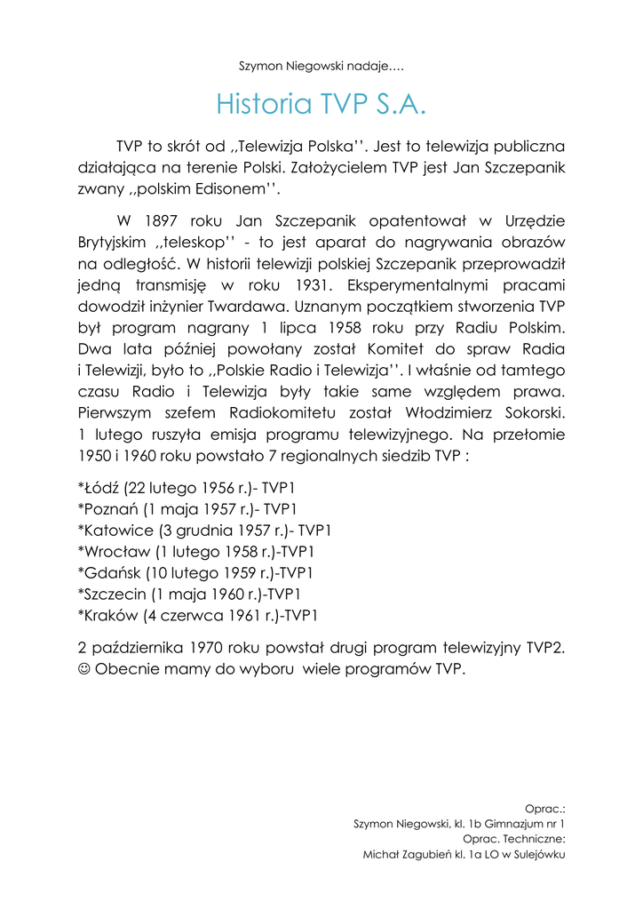 Szymon Niegowski nadaje…. Historia TVP S.A. TVP to skrót od ,,Telewizja Polska’’. Jest to telewizja publiczna działająca na terenie Polski. ZałoŜycielem TVP jest Jan Szczepanik zwany ,,polskim Edisonem’’. W 1897 roku Jan Szczepanik opatentował w Urzędzie Brytyjskim ,,teleskop’’ - to jest aparat do nagrywania obrazów na odległość. W historii telewizji polskiej Szczepanik przeprowadził jedną transmisję w roku 1931. Eksperymentalnymi pracami dowodził inŜynier Twardawa. Uznanym początkiem stworzenia TVP był program nagrany 1 lipca 1958 roku przy Radiu Polskim. Dwa lata później powołany został Komitet do spraw Radia i Telewizji, było to ,,Polskie Radio i Telewizja’’. I właśnie od tamtego czasu Radio i Telewizja były takie same względem prawa. Pierwszym szefem Radiokomitetu został Włodzimierz Sokorski. 1 lutego ruszyła emisja programu telewizyjnego. Na przełomie 1950 i 1960 roku powstało 7 regionalnych siedzib TVP : *Łódź (22 lutego 1956 r.)- TVP1 *Poznań (1 maja 1957 r.)- TVP1 *Katowice (3 grudnia 1957 r.)- TVP1 *Wrocław (1 lutego 1958 r.)-TVP1 *Gdańsk (10 lutego 1959 r.)-TVP1 *Szczecin (1 maja 1960 r.)-TVP1 *Kraków (4 czerwca 1961 r.)-TVP1 2 października 1970 roku powstał drugi program telewizyjny TVP2. ☺ Obecnie mamy do wyboru wiele programów TVP. Oprac.: Szymon Niegowski, kl. 1b Gimnazjum nr 1 Oprac. Techniczne: Michał Zagubień kl. 1a LO w Sulejówku