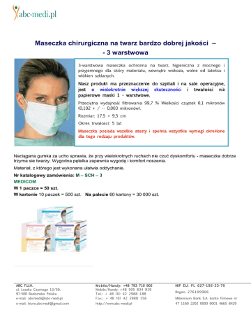 Maseczka chirurgiczna na twarz bardzo dobrej jakości – - 3 warstwowa 3-warstwowa maseczka ochronna na twarz, higieniczna z mocnego i przyjemnego dla skóry materiału, wewnątrz wiskoza, wolne od lateksu i włókien szklanych. Nasz produkt ma przeznaczenie do szpitali i na sale operacyjne, jest o wielokrotnie większej skuteczności i trwałości niż papierowe maski 1 - warstwowe. Przeciętna wydajność filtrowania 99,7 % Wielkości cząstek 0,1 mikronów (0,102 + / -- 0,003 mikronów). Rozmiar: 17,5 + 9,5 cm Okres trwałości: 5 lat Maseczka posiada wszelkie atesty i spełnia wszystkie wymogi określone dla tego rodzaju produktów. Naciągana gumka za ucho sprawia, że przy wielokrotnych ruchach nie czuć dyskomfortu - maseczka dobrze trzyma sie twarzy. Wygodna pętelka zapewnia wygodę i komfort noszenia. Materiał, z którego jest wykonana ułatwia oddychanie. Nr katalogowy zamówienia: M – SCH – 3 MEDICOM W 1 paczce = 50 szt. W kartonie 10 paczek = 500 szt. Na palecie 60 kartony = 30 000 szt. ABC F.U.H. ul. Leszka Czarnego 13/50, 97-500 Radomsko Polska e-mail: [email protected] Mobile/Handy: +48 793 710 902 Mobile/Handy: +48 505 834 919 Tel.: + 48 (0) 42 2988 188 Fax.: + 48 (0) 42 2988 156 NIP EU: P L 627- 192- 2 3- 70 e-mail: [email protected] http://www.abc-medi.pl 47 1160 2202 0000 0001 4665 8429 Regon: 2 7 6 1 0 9 9 0 6 Millennium Bank S.A. konto firmowe nr ABC F.U.H. ul. Leszka Czarnego 13/50, 97-500 Radomsko Polska e-mail: [email protected] Mobile/Handy: +48 793 710 902 Mobile/Handy: +48 505 834 919 Tel.: + 48 (0) 42 2988 188 Fax.: + 48 (0) 42 2988 156 NIP EU: P L 627- 192- 2 3- 70 e-mail: [email protected] http://www.abc-medi.pl 47 1160 2202 0000 0001 4665 8429 Regon: 2 7 6 1 0 9 9 0 6 Millennium Bank S.A. konto firmowe nr