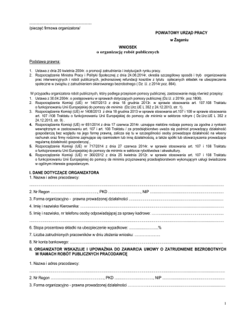 ........................................... /pieczęć firmowa organizatora/ POWIATOWY URZĄD PRACY w Żaganiu WNIOSEK o organizację robót publicznych Podstawa prawna: 1. Ustawa z dnia 20 kwietnia 2004r. o promocji zatrudnienia i instytucjach rynku pracy. 2. Rozporządzenie Ministra Pracy i Polityki Społecznej z dnia 24.06.2014r. określa szczegółowy sposób i tryb organizowania prac interwencyjnych i robót publicznych, jednorazowej refundacji kosztów z tytułu opłacanych składek na ubezpieczenia społeczne w związku z zatrudnieniem skierowanego bezrobotnego ( Dz .U. z 2014r.poz. 864). W przypadku organizatora robót publicznych, który podlega przepisom pomocy publicznej, zastosowanie mają również przepisy: 1. Ustawa z 30.04.2004r. o postępowaniu w sprawach dotyczących pomocy publicznej (Dz.U. z 2016r. poz.1808). 2. Rozporządzenie Komisji (UE) nr 1407/2013 z dnia 18 grudnia 2013r. w sprawie stosowania art. 107.108 Traktatu o funkcjonowaniu Unii Europejskiej do pomocy de minimis (Dz.Urz.UE L 352 z 24.12.2013, str. 1). 3. Rozporządzenie Komisji (UE) nr 1408/2013 z dnia 18 grudnia 2013 w sprawie stosowania art.107 i 108 w sprawie stosowania art. 107 i108 Traktatu o funkcjonowaniu Unii Europejskiej do pomocy de minimis w sektorze rolnym ( Dz.Urz.UE L 352 z 24.12.2013, str. 9) . 4. Rozporządzenie Komisji (UE) nr 651/2014 z dnia 17 czerwca 2014r. uznające niektóre rodzaje pomocy za zgodne z rynkiem wewnętrznym w zastosowaniu art. 107 i art. 108 Traktatu / za przedsiębiorstwo uważa się podmiot prowadzący działalność gospodarczą bez względu na jego formę prawną, zalicza się tu w szczególności osoby prowadzące działalność na własny rachunek oraz firmy rodzinne zajmujące się rzemiosłem lub inną działalnością, a także spółki lub stowarzyszenia prowadzące regularną działalność gospodarczą/,. 5. Rozporządzenie Komisji (UE) nr 717/2014 z dnia 27 czerwca 2014r. w sprawie stosowania art. 107 i 108 Traktatu o funkcjonowaniu Unii Europejskiej do pomocy de minimis w sektorze rybołówstwa i akwakultury. 6. Rozporządzenie Komisji (UE) nr 360/2012 z dnia 25 kwietnia 2012r. w sprawie stosowania art. 107 i 108 Traktatu o funkcjonowaniu Unii Europejskiej do pomocy de minimis przyznawanej przedsiębiorstwom wykonującym usługi świadczone w ogólnym interesie gospodarczym. I. DANE DOTYCZĄCE ORGANIZATORA 1. Nazwa i adres pracodawcy: ........................................................................................................................................................................................... 2. Nr Regon ............................................., PKD ..............................., NIP ....................................................................... 3. Forma organizacyjno - prawna prowadzonej działalności ........................................................................................... 4. Imię i nazwisko Kierownika: .......................................................................................................................................... 5. Imię i nazwisko, nr telefonu osoby odpowiadającej za sprawy kadrowe: …….............................................................. ........................................................................................................................................................................................... 6. Stopa procentowa składki na ubezpieczenie wypadkowe: ............................% 7. Liczba zatrudnionych pracowników w dniu złożenia wniosku: …………….….. 8. Nr konta bankowego: ................................................................................................................................................... II. ORGANIZATOR WSKAZUJE I UPOWAŻNIA DO ZAWARCIA UMOWY O ZATRUDNIENIE BEZROBOTNYCH W RAMACH ROBÓT PUBLICZNYCH PRACODAWCĘ 1. Nazwa i adres pracodawcy: ............................................................................................................................................................................................ 2. Nr Regon ..................................................., PKD ....................................., NIP ............................................................ 3. Forma organizacyjno - prawna prowadzonej działalności ……………............................................................................ 1 4. Imię i nazwisko, nr telefonu osoby odpowiadającej za sprawy kadrowe: ……………………………….…....................... 5. Stopa procentowa składki na ubezpieczenie wypadkowe : .................% 6. Imię, nazwisko i stanowisko osoby upoważnionej do zawarcia umowy: ………………………………………………… 7. Nr konta bankowego: ................................................................................................................................................... III. DANE DOTYCZĄCE KANDYDATÓW KIEROWANYCH DO ROBÓT PUBLICZNYCH 1. Liczba bezrobotnych proponowanych do zatrudnienia: ……....................................................................................... 2. Okres zatrudnienia w ramach robót publicznych: od dnia...................................do dnia............................................ 3. Miejsce pracy ………………………………………………………………………..……………………………….……….... 4. Proponowany wymiar czasu pracy: ………………………………………………………………………………..………… 5. Wysokość proponowanego wynagrodzenia dla skierowanych bezrobotnych: …............................................ 6. Wnioskowana miesięczna wysokość refundowanego wynagrodzenia z tytułu zatrudnienia skierowanego(ych) bezrobotnego(ych): …......................................................................................................................... 7. Opis stanowisk pracy: Na